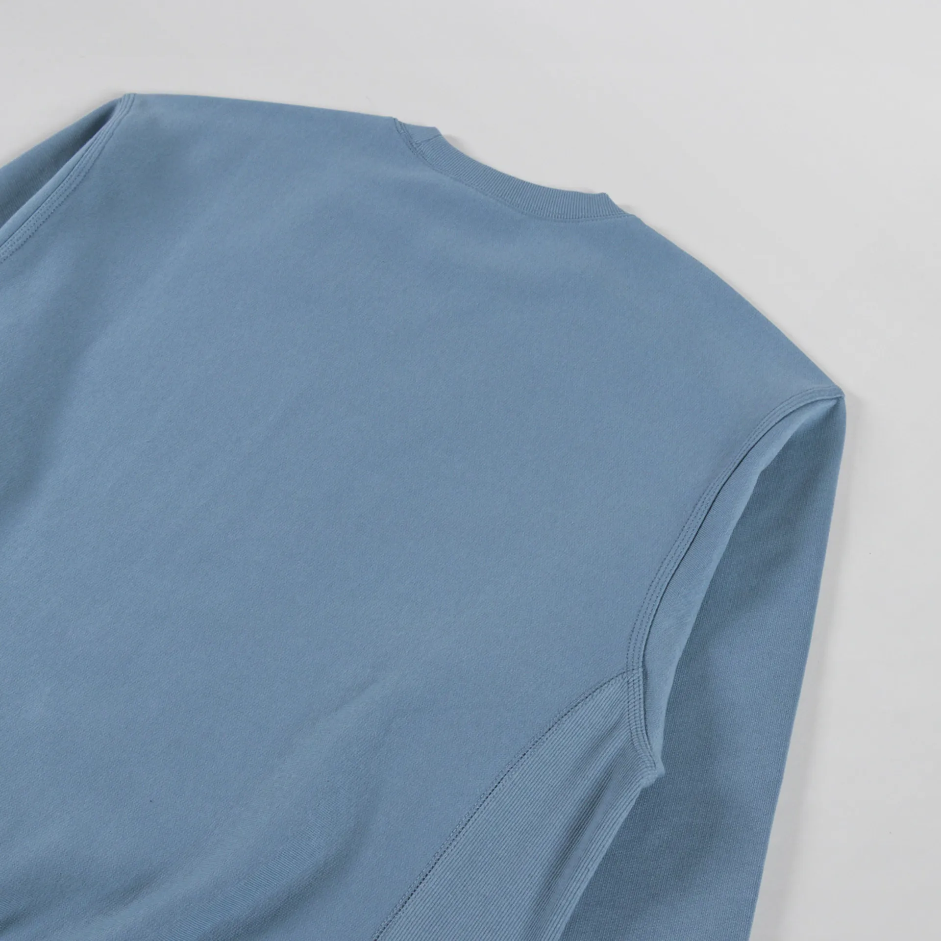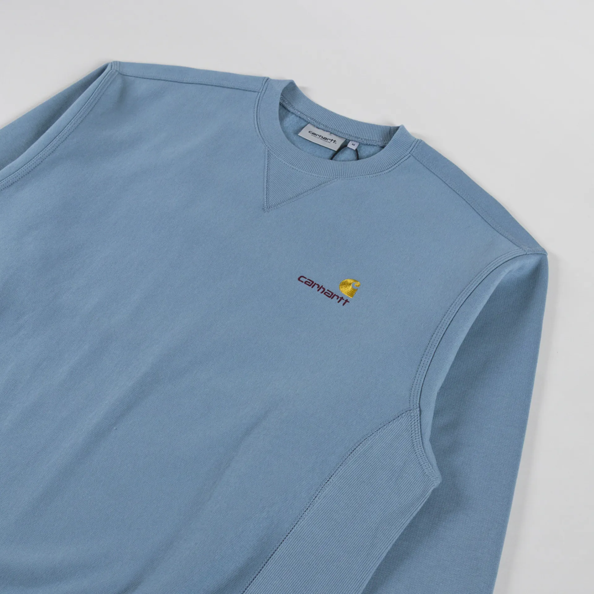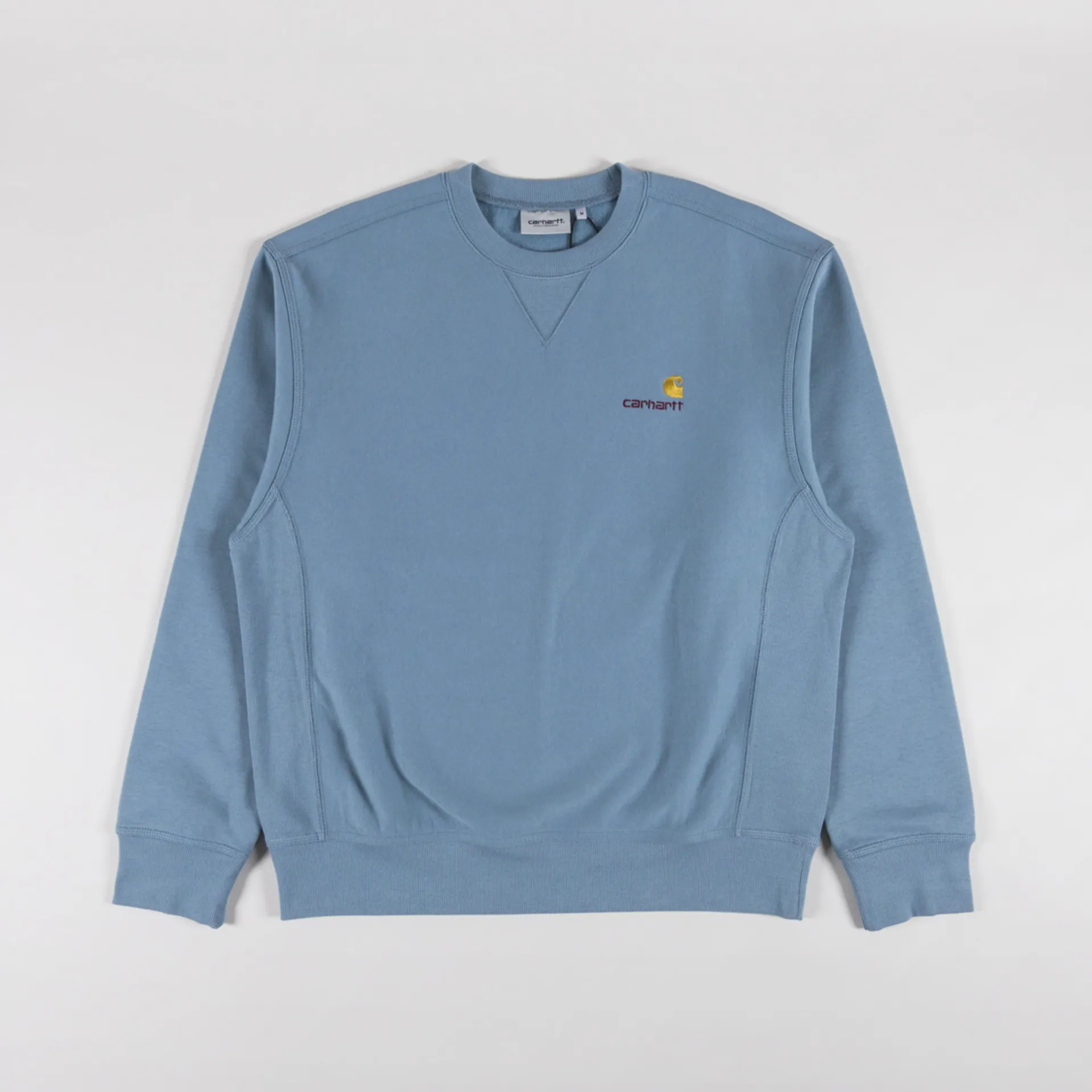 A sweatshirt from Carhartt WIP made from 100% cotton with a warm brushed fleece lining. Has a ribbed crew neck, hem, cuffs and an embroidered American Script logo to the chest.
