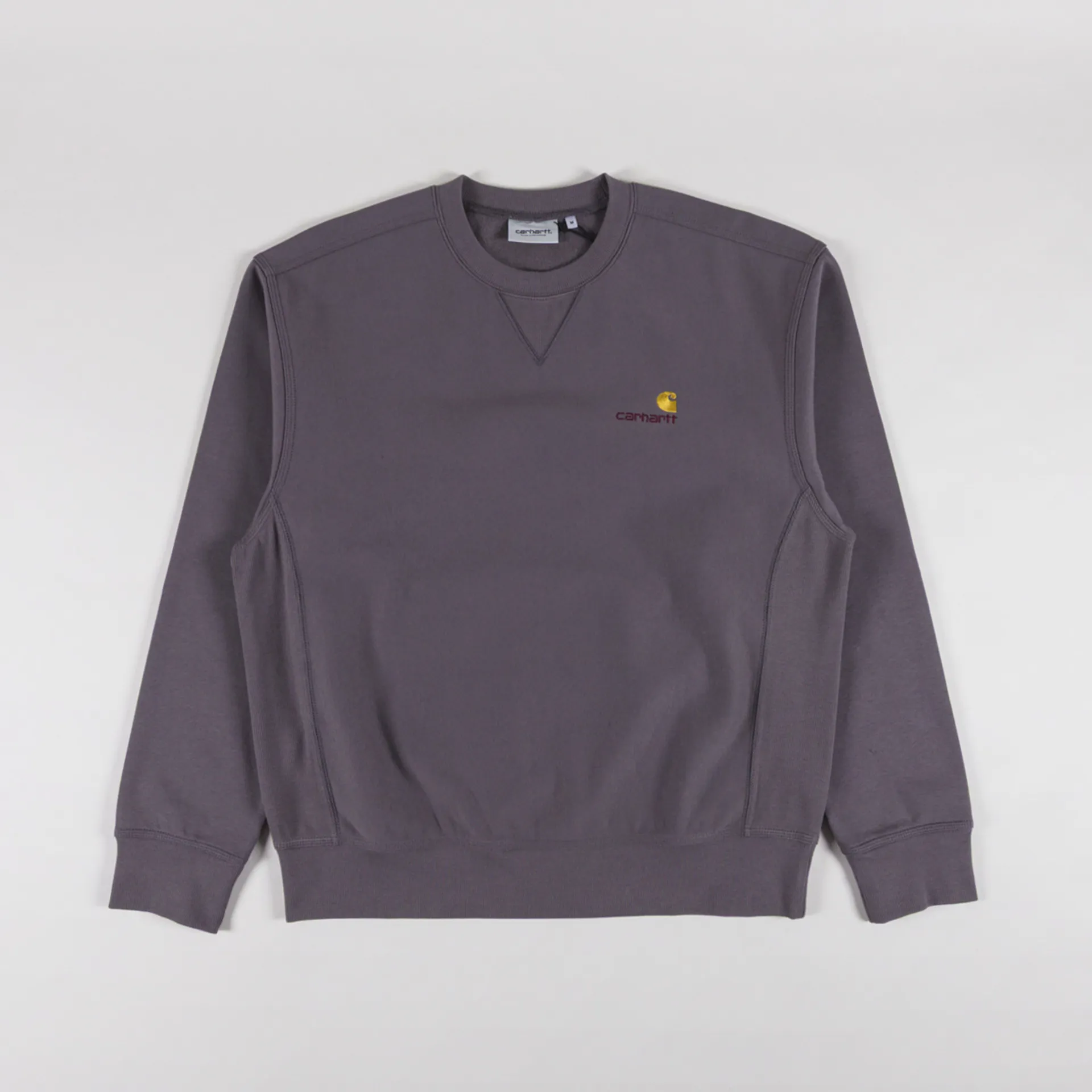 A sweatshirt from Carhartt WIP made from 100% cotton with a warm brushed fleece lining. Has a ribbed crew neck, hem, cuffs and an embroidered American Script logo to the chest.