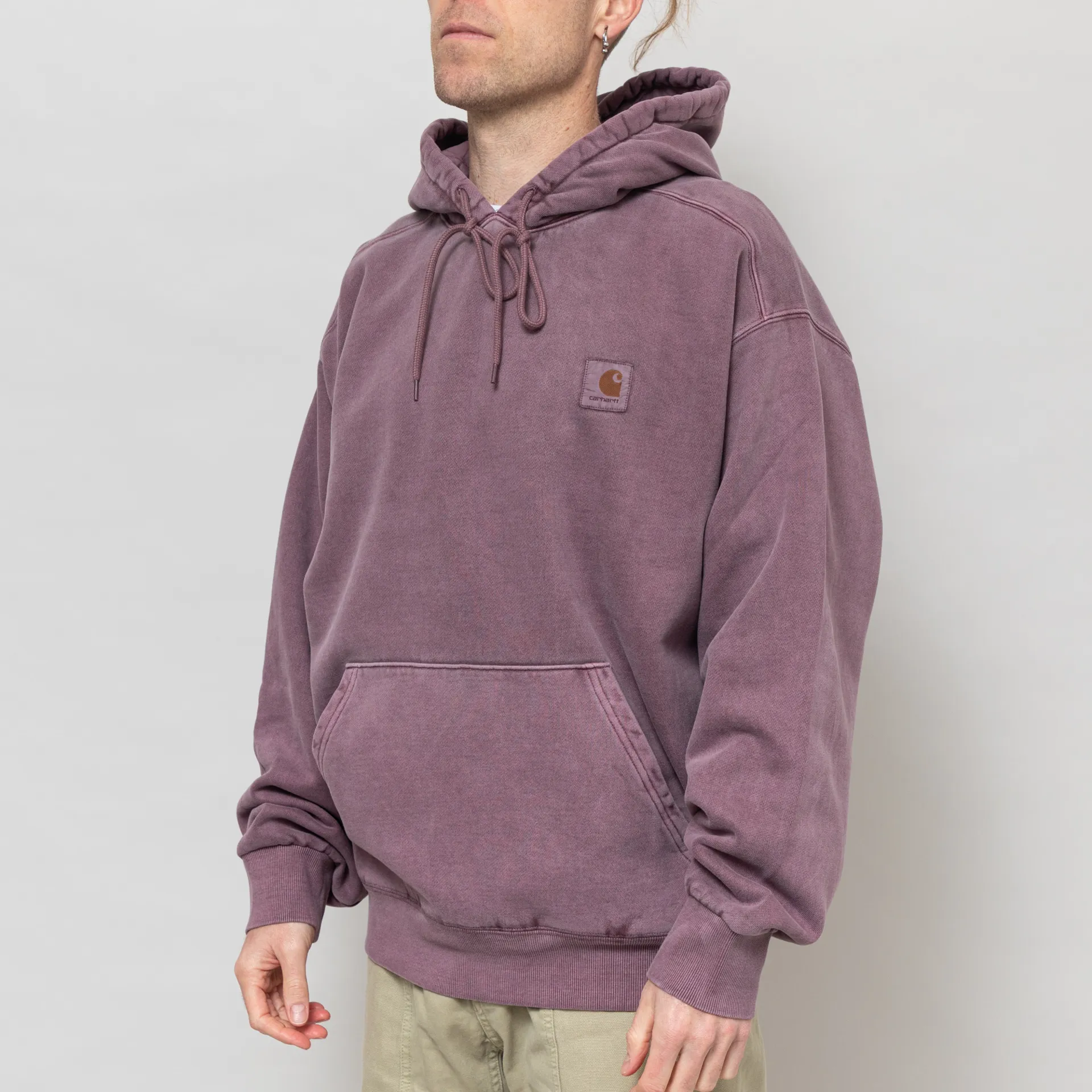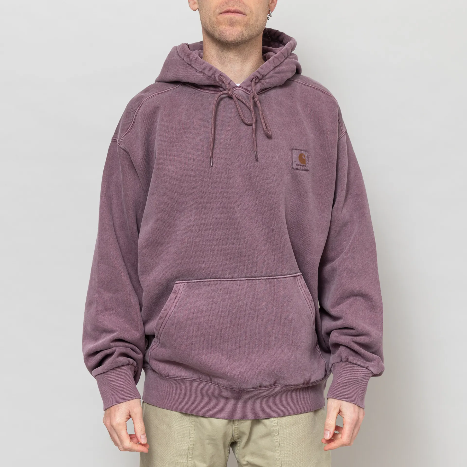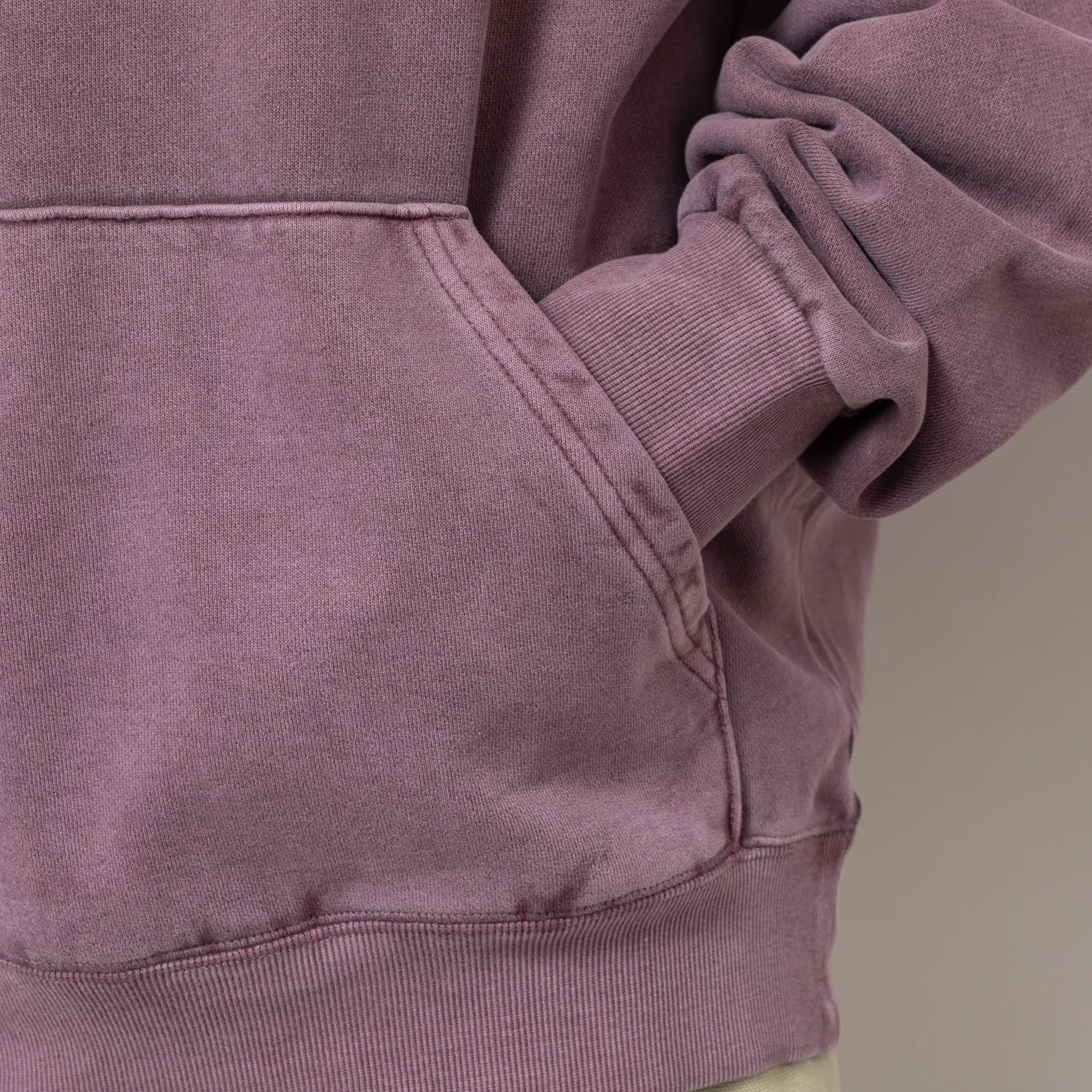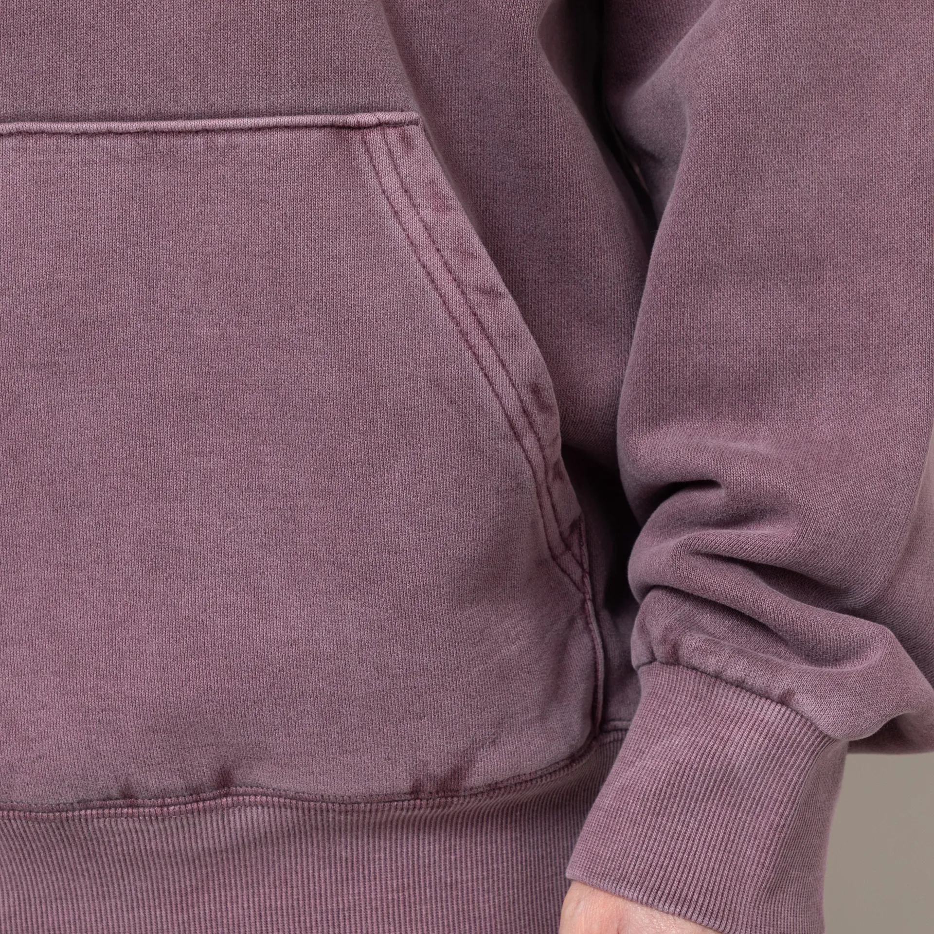 A pullover hoodie from Carhartt WIP made from a super soft and comfortable 100% cotton with a brushed fleece lining, ribbed cuffs and hem, kangaoo pocket and drawstring hood. It has a pigment dye and woven logo patch.