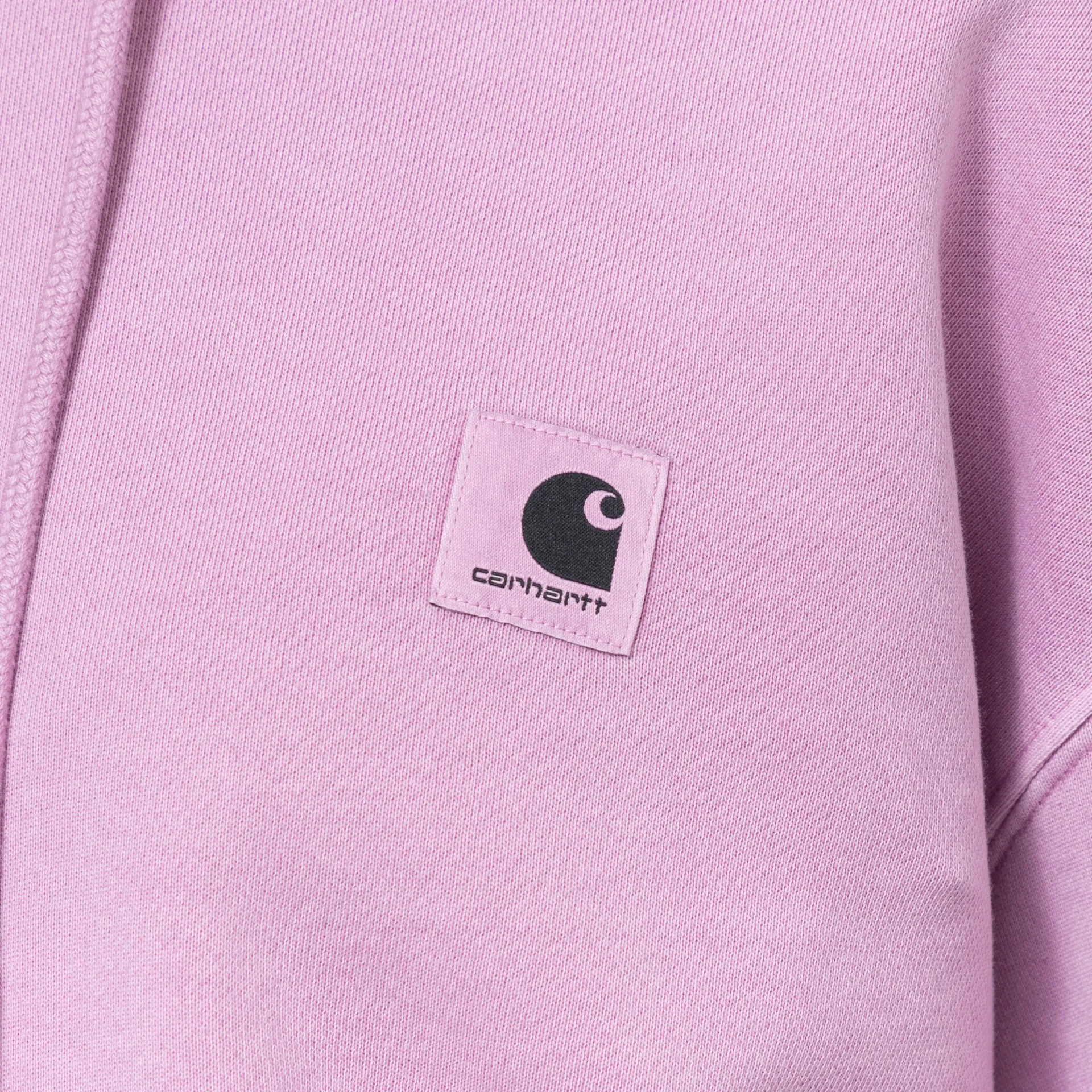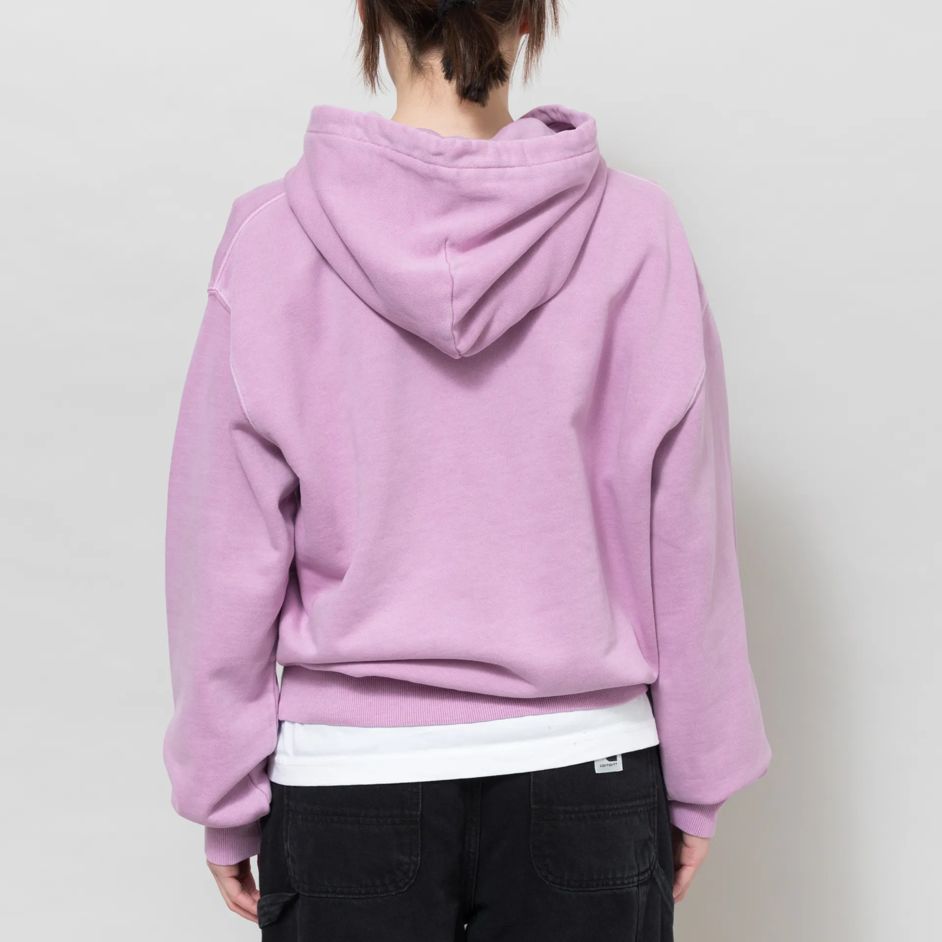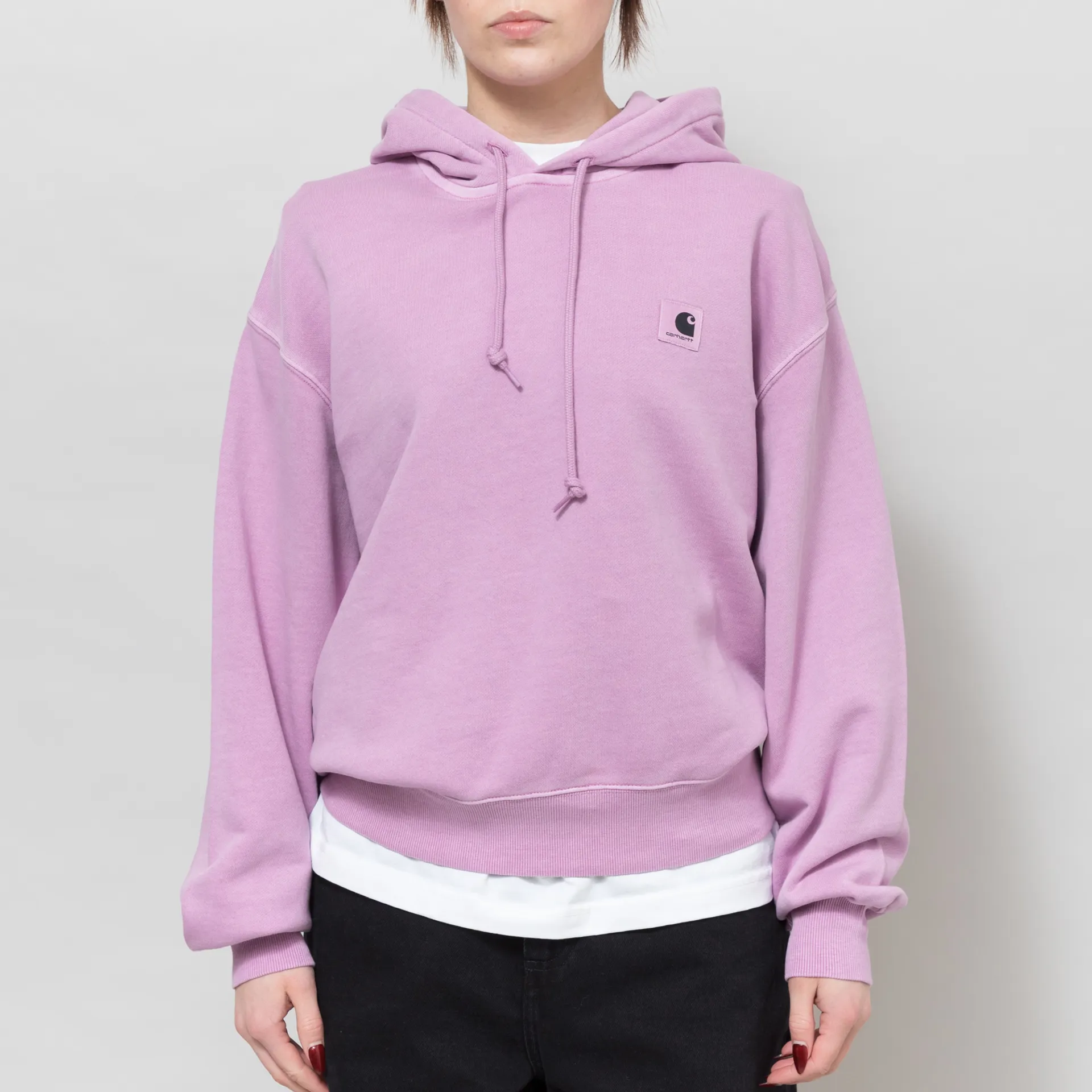 A pullover hoodie from Carhartt WIP's Womenswear collection, made from a comfortable heavyweight 100% cotton with a loopback lining, a ribbed hem and cuffs, and a drawstring hood. It has a woven logo patch on the chest and a casual pigment-dyed design.