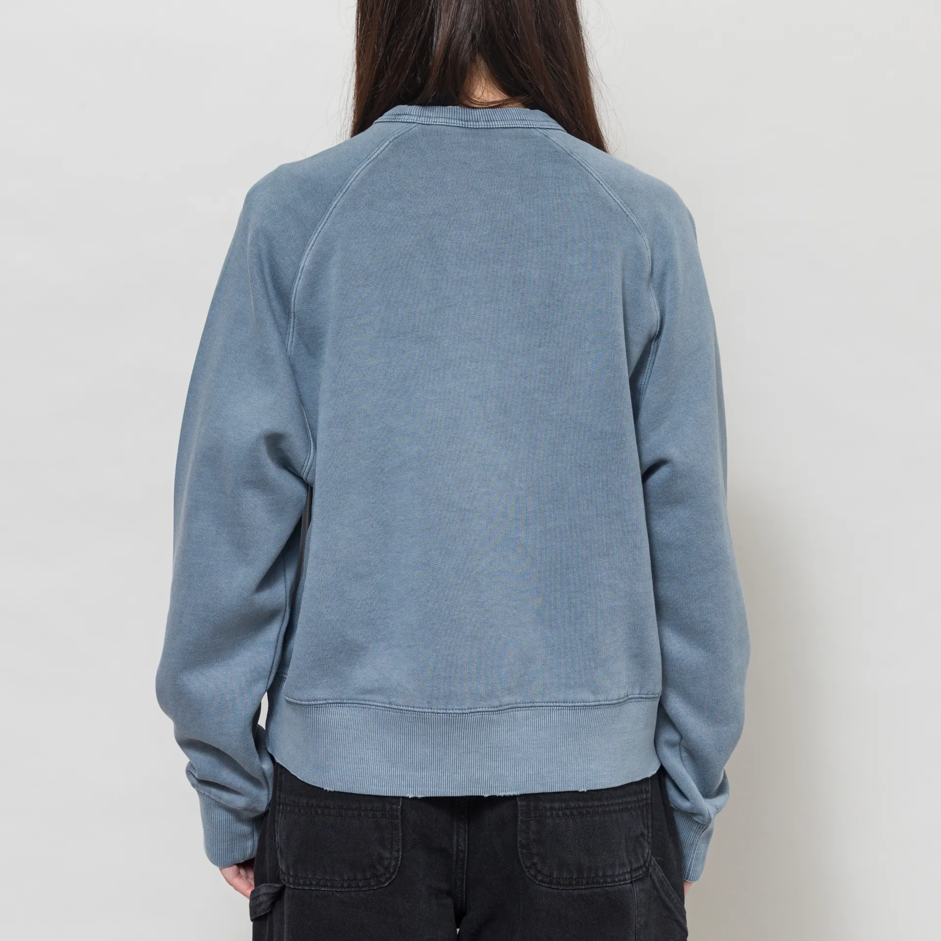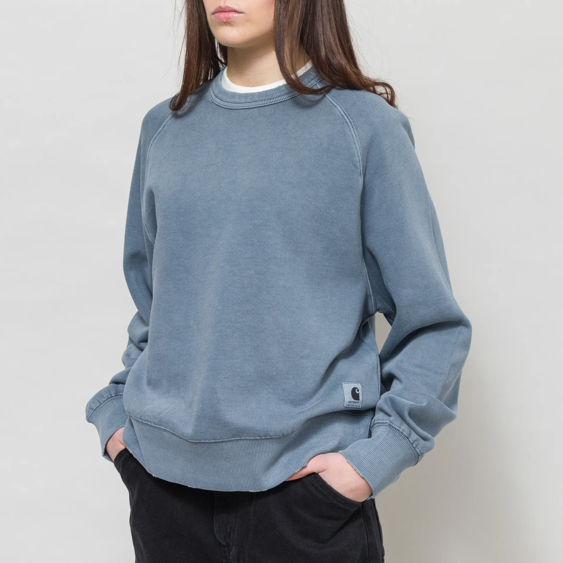 A crewneck from Carhartt WIP's womenswear collection, cut in a relaxed, boxy fit with a raglan sleeve construction for a casual silhouette. Constructed from heavyweight unbrushed cotton fabric that hasundergone a grind wash, a process which results in a slightly distressed, worn-in finish. It features a loopback lining for comfort, a ribbed hem and cuffs, with the signature Square Label sitting nicely at the bottom, rendered murky by the overdyeing process.