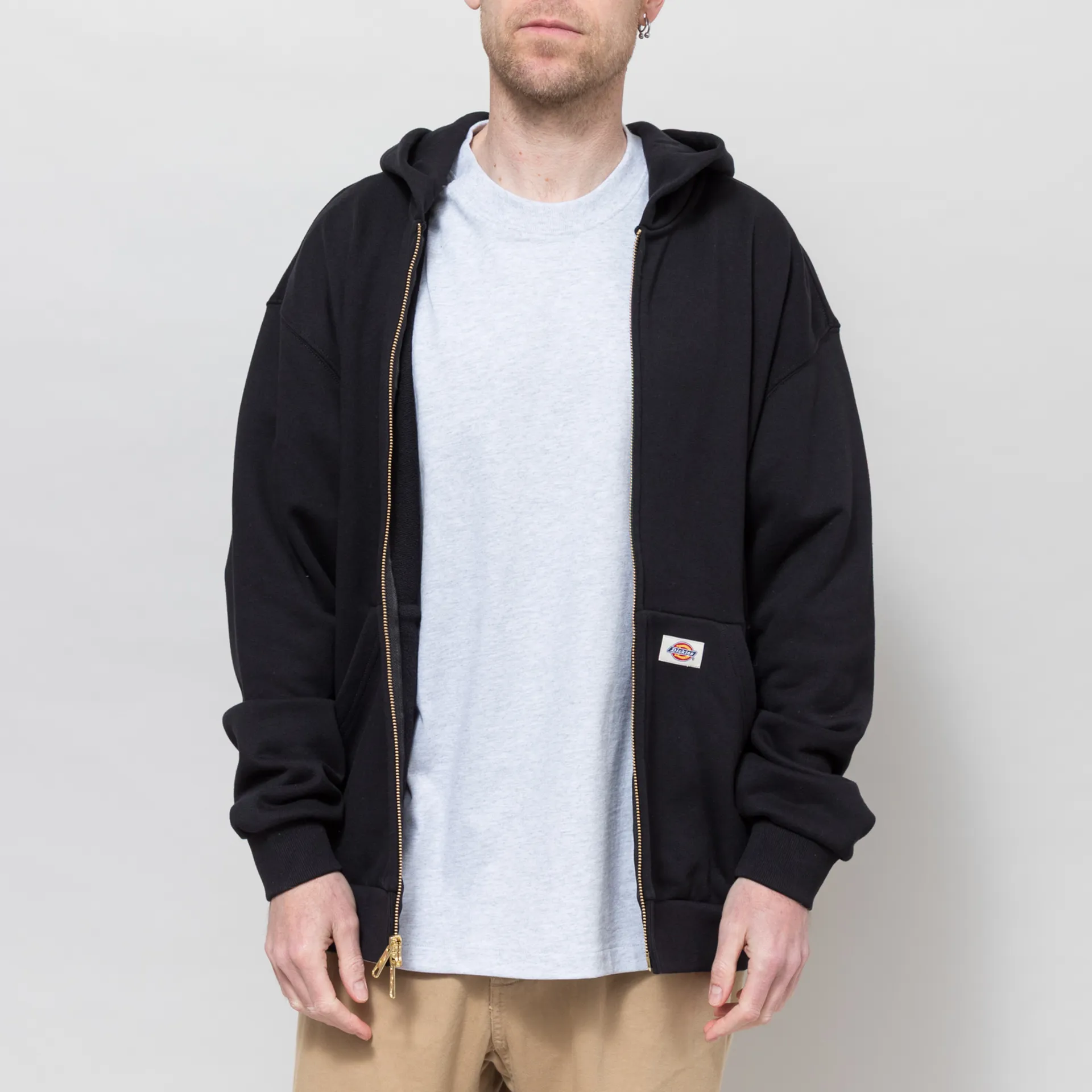 A zip-through hoodie from Dickies, constructed from durable 450gsm poly/cotton with a loopback lining for comfort. It's cut in a boxy fit for a casual silhouette and features a two-way centre zipper, a classic lined hood, with a ribbed hem and cuffs. The design is complete with two hand pockets, one with a woven Dickies patch.