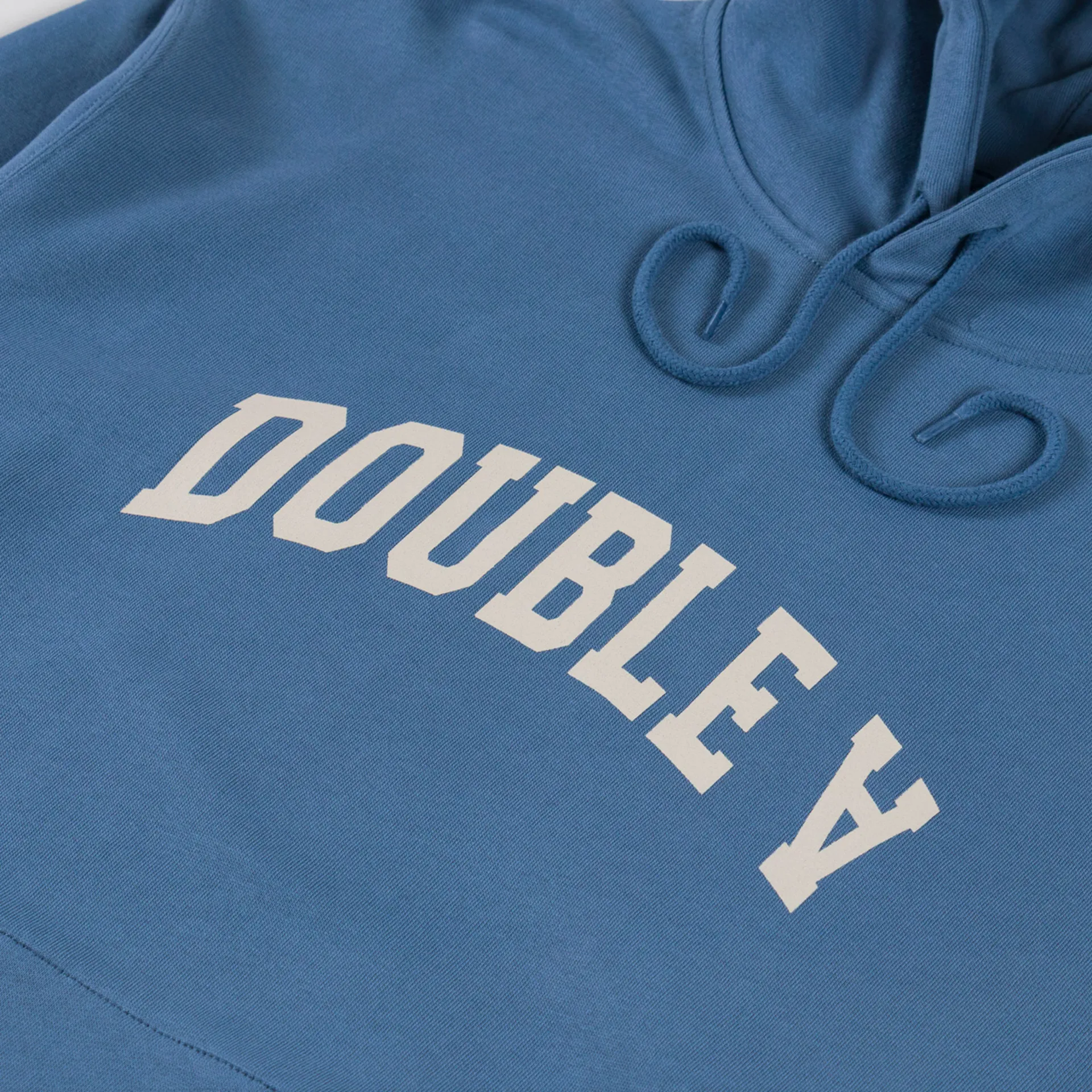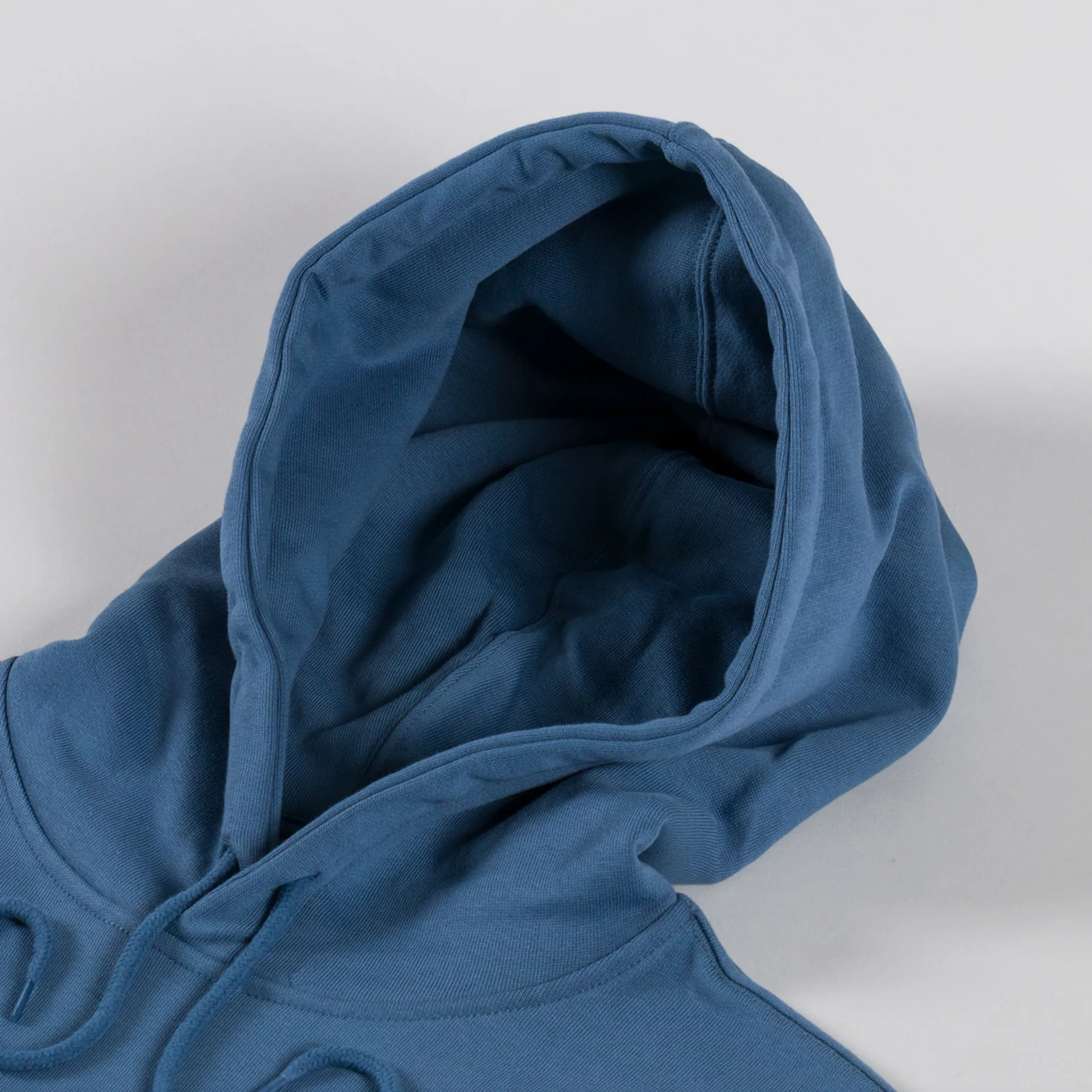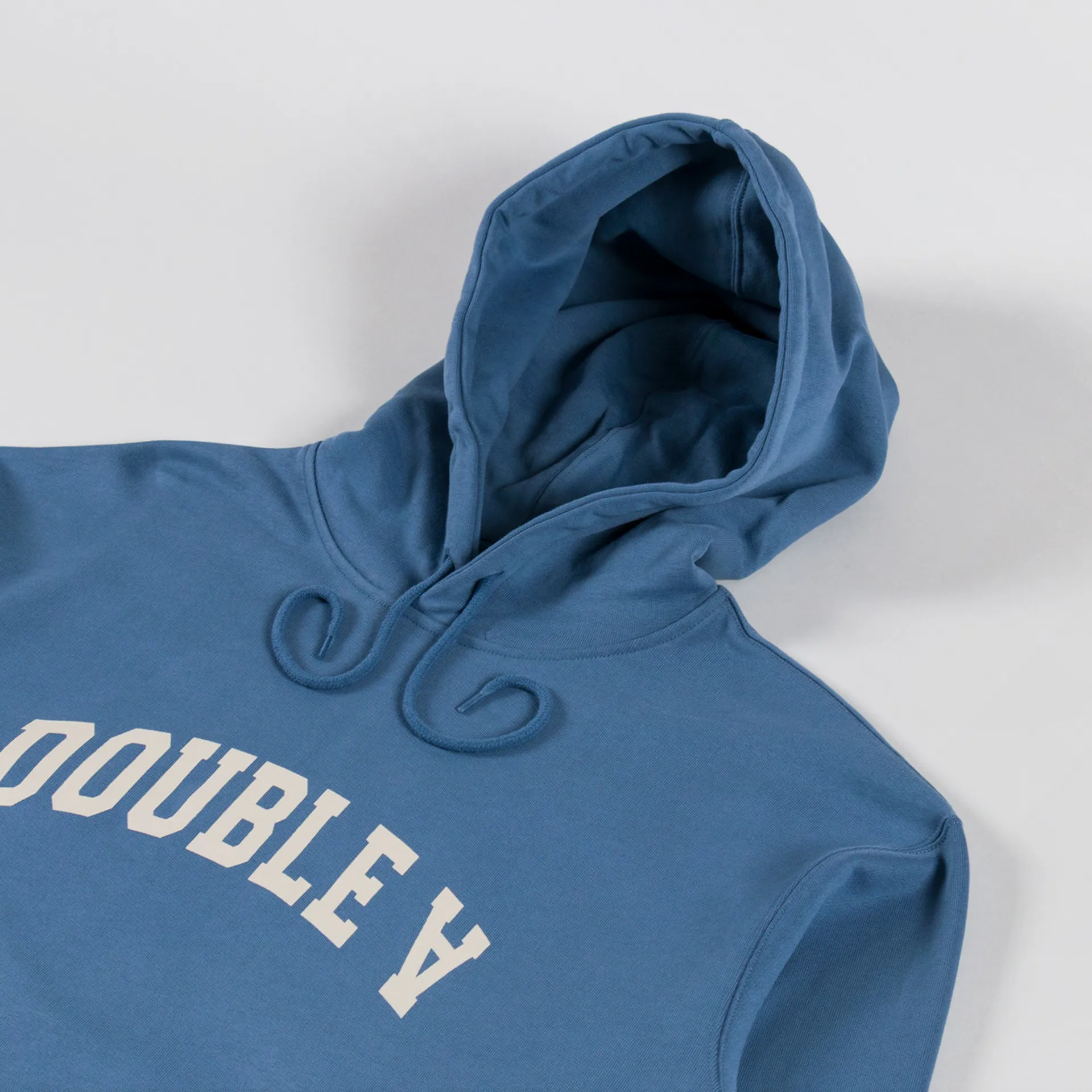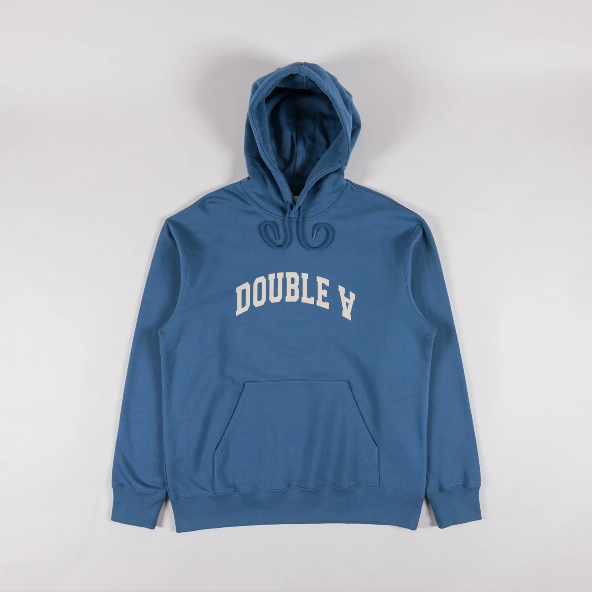 A loose fitting hoodie from Double A, constructed from 100% organic cotton with a fleece-back lining for comfort. It features a drawstring hood, a kangaroo pocket, with a ribbed hem and cuffs. Finished with a large Double A logo printed across the front.
