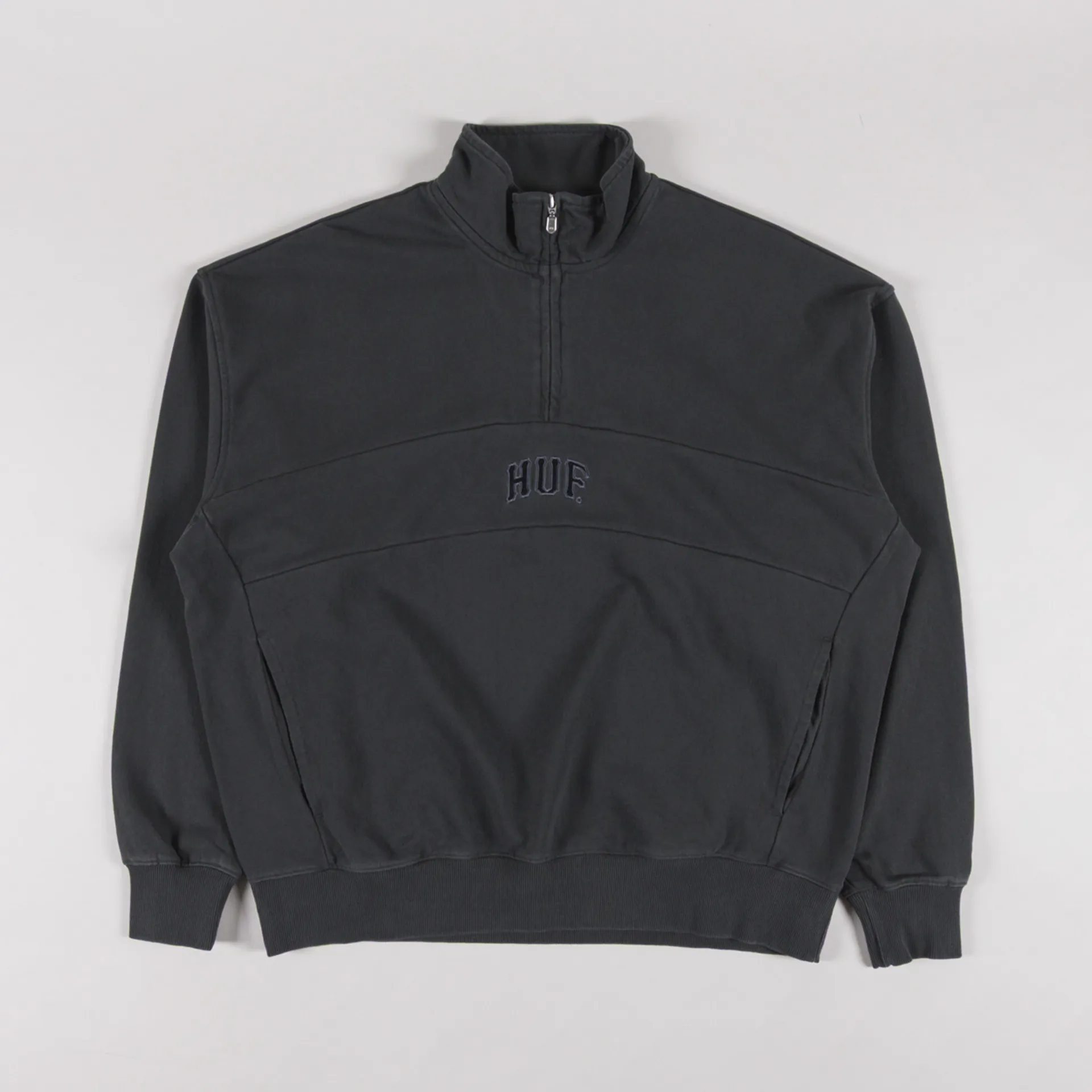 A funnel neck sweatshirt from Huf, constructed from premium French Terry fabric treated with rich, washed dyes for a worn-in look. It's cut in a boxy fit for a laidback silhouette and has a loopback lining for comfort. Featuring a quarter-zip placket, leading to a funnel neck, with a ribbed hem and cuffs. Finished off with two on-seam hand pockets and a tonal embroidered Huf logo to the centre front.