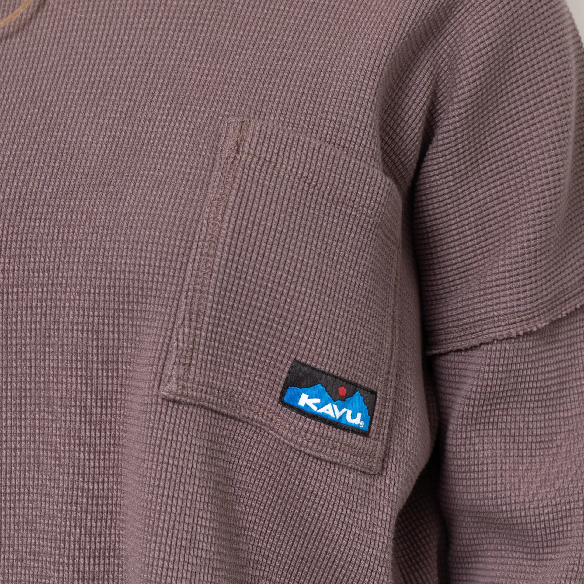 A waffle textured sweatshirt from Kavu, constructed from 100% cotton heavy thermal knit and cut in a relaxed fit with dropped shoulders. It features a ribbed crewneck and cuffs, with a deep curved hem and single patch pocket to the chest. Finished with the signature woven Kavu logo patch.