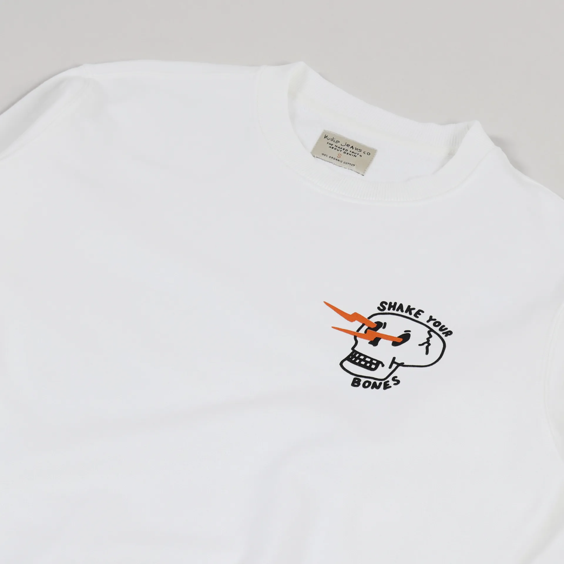 A sweatshirt from sustainable denim company Nudie Jeans, made from a super comfortable 100% organic cotton with a ribbed crew neck, hem and cuffs and a fleeceback lining. It has a graphic Shake Your Bones print to the chest.