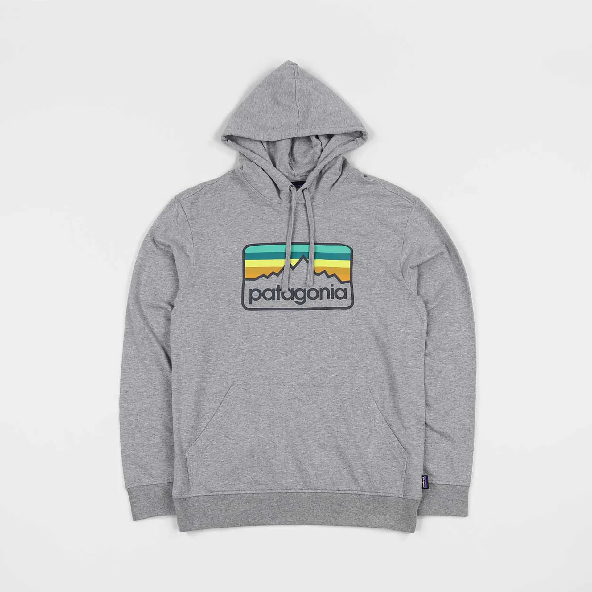 A lightweight hooded pullover sweater from Patagonia with their Line Logo Badge screen printed across the front of it made with Fair Trade sewing and some good vibes!