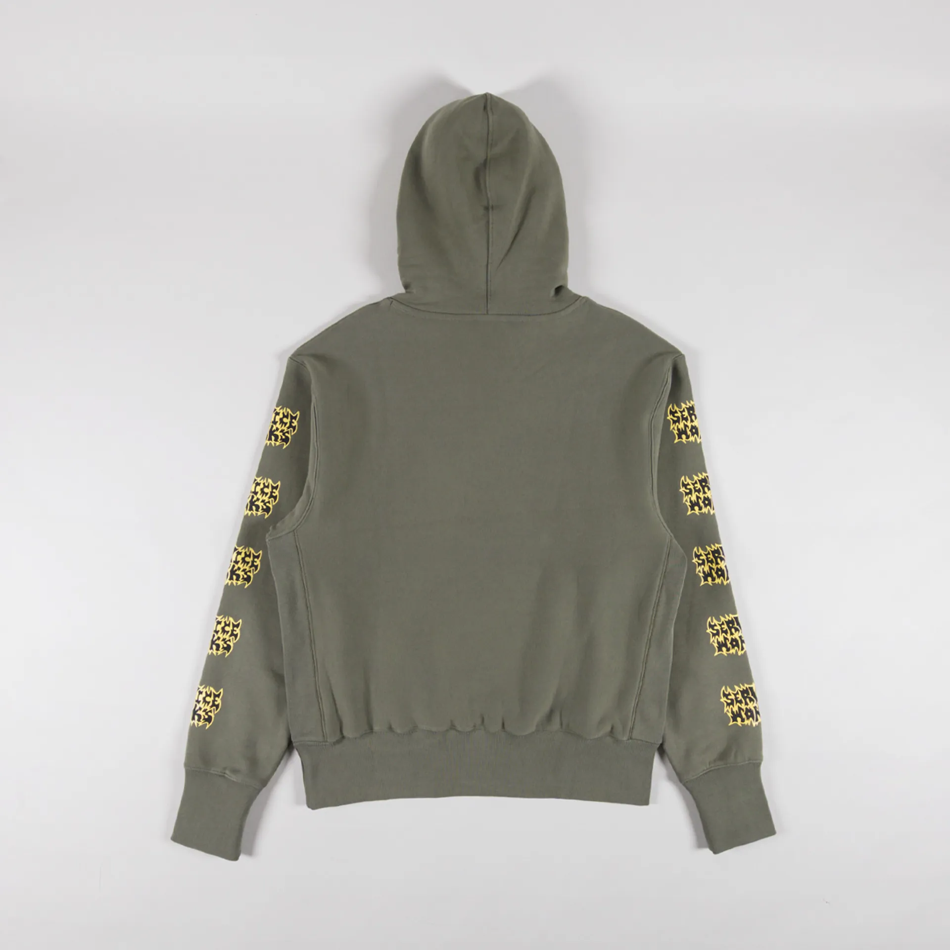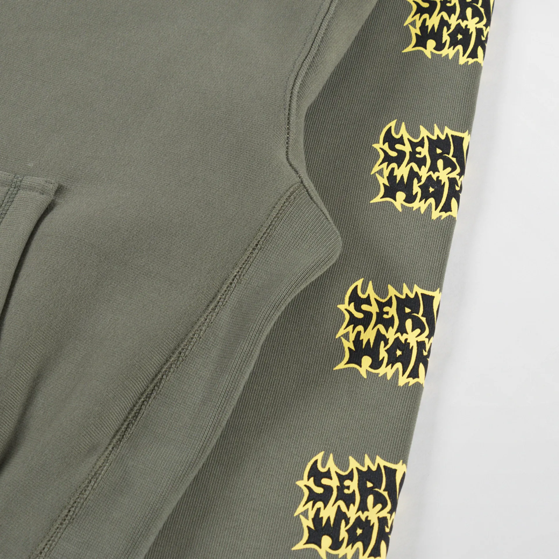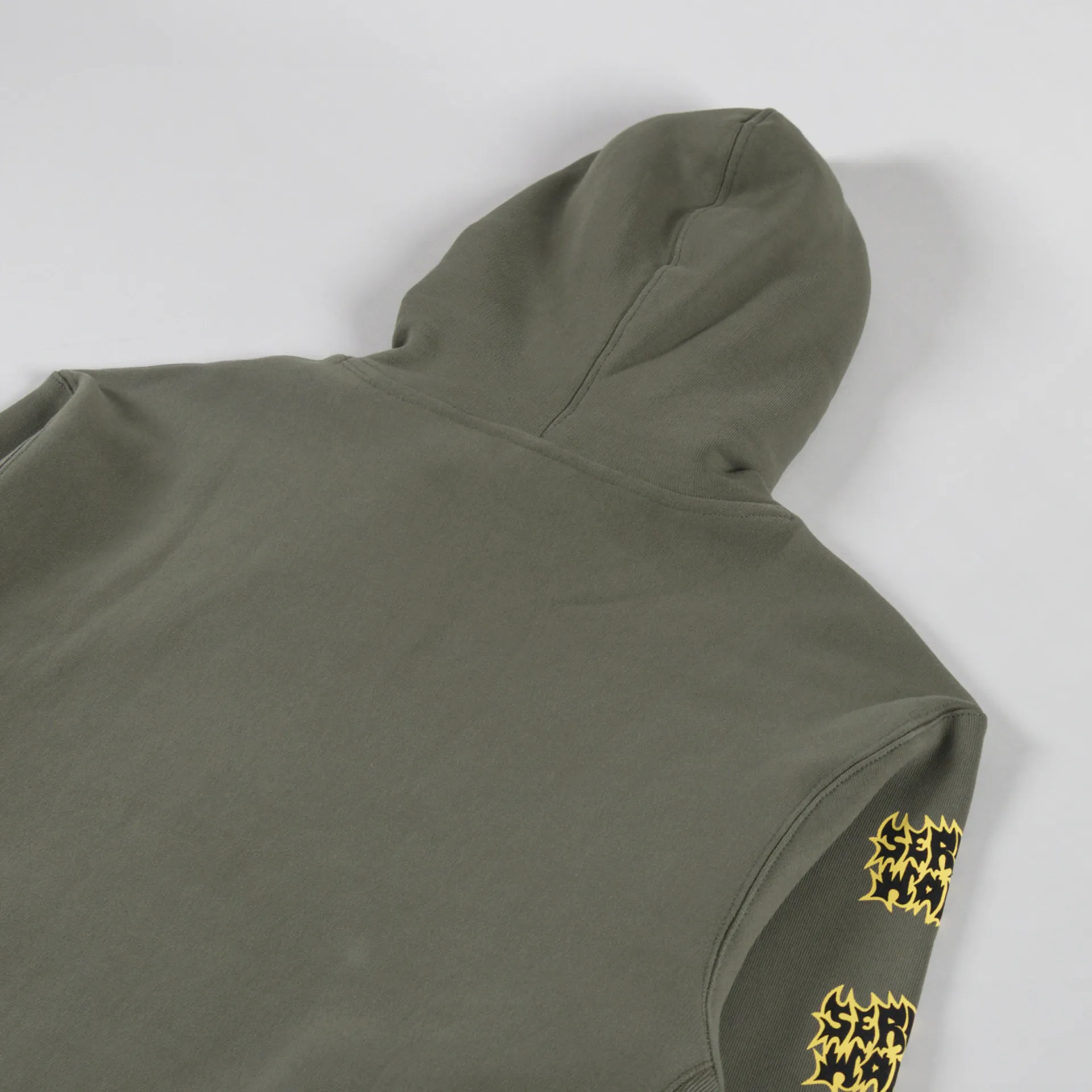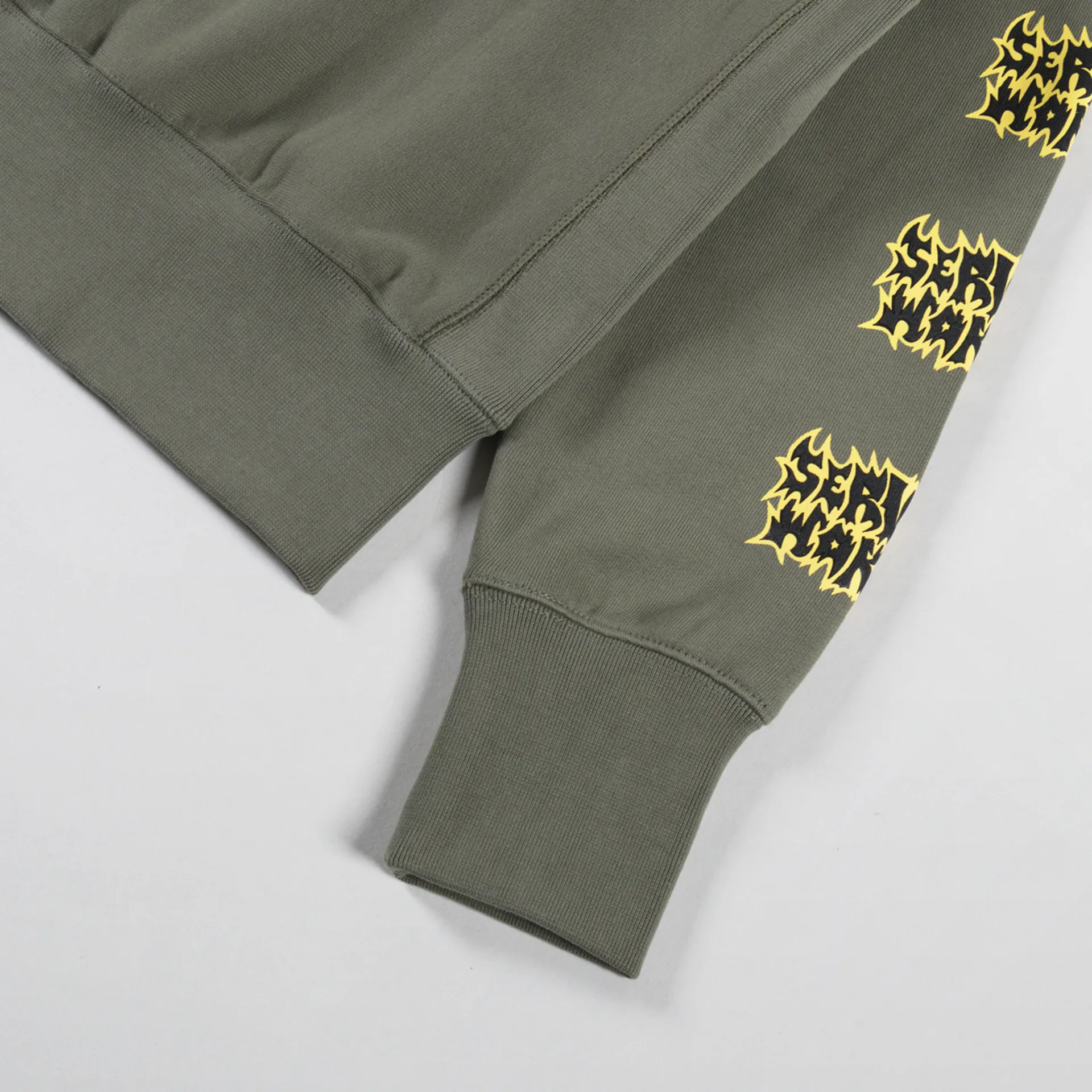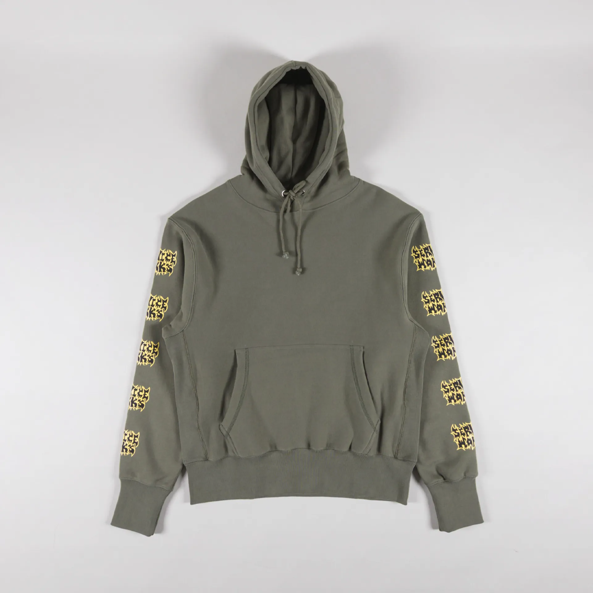 A heavyweight hoodie from Service Works constructed with 550GSM GOTS-Certified organic cotton and cut in a regular fit for everyday wear. It has a fleece-back lining for comfort, a drawstring hood, kangaroo pocket with a ribbed hem and cuffs. The design is complete with some cool screen-printed graphics down the sleeves.