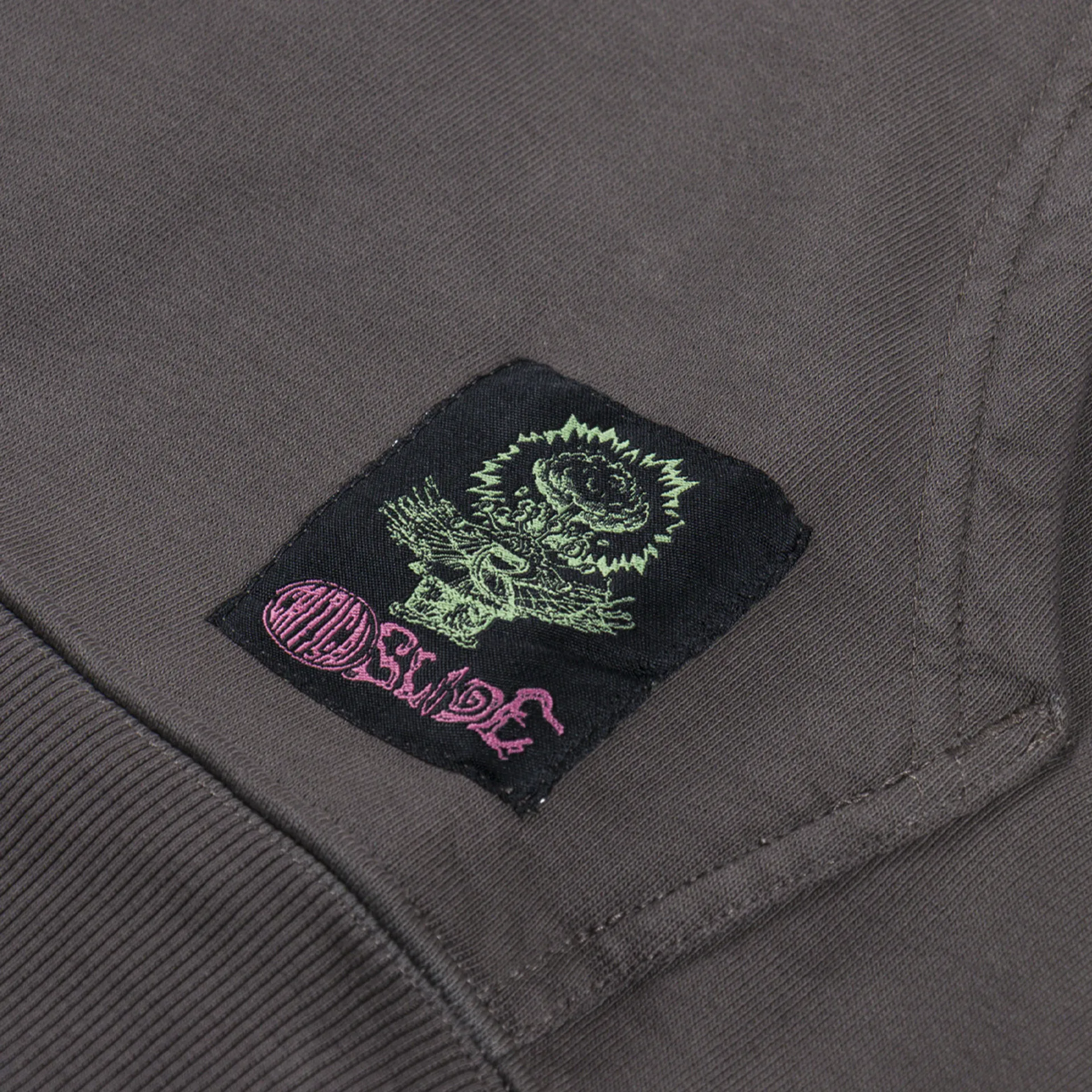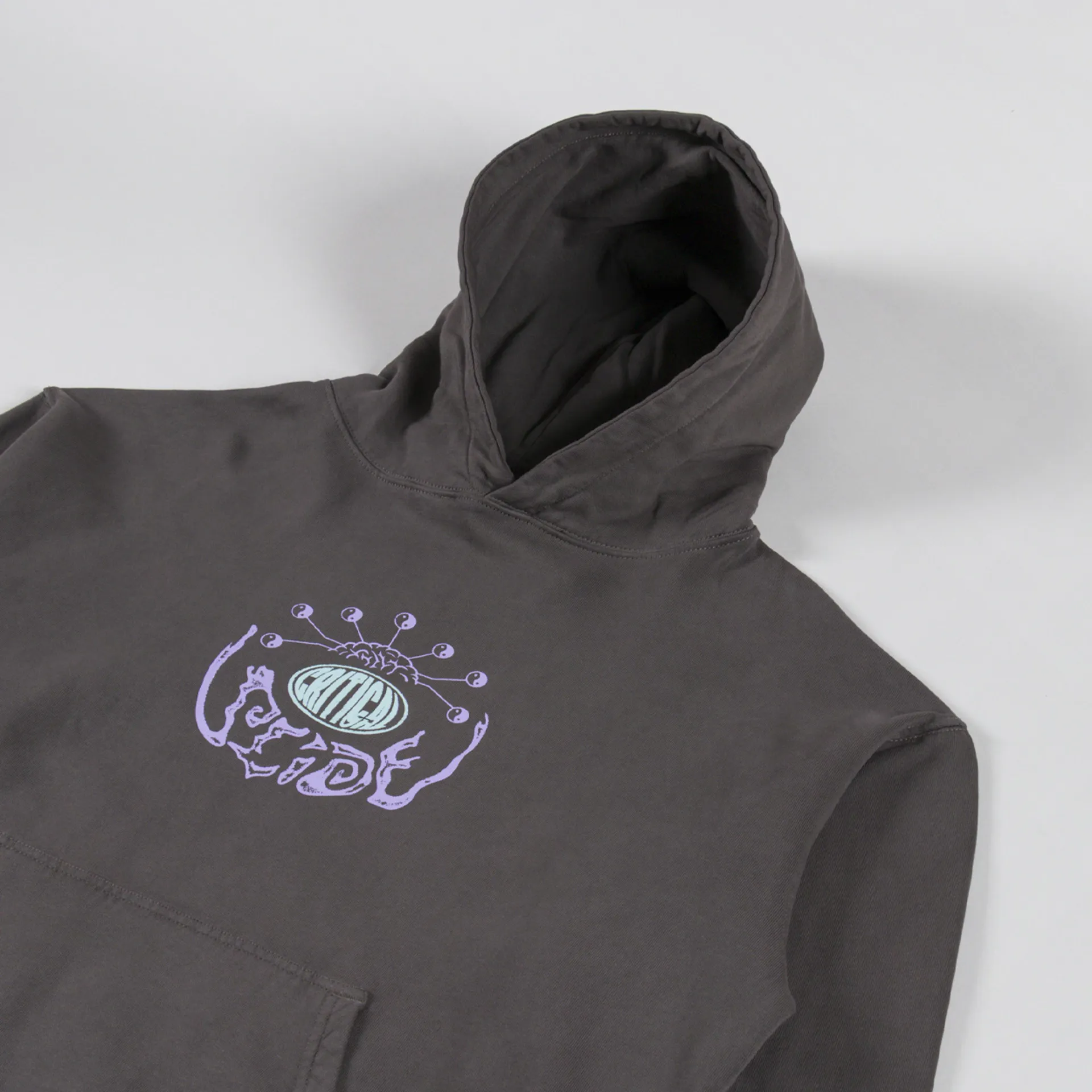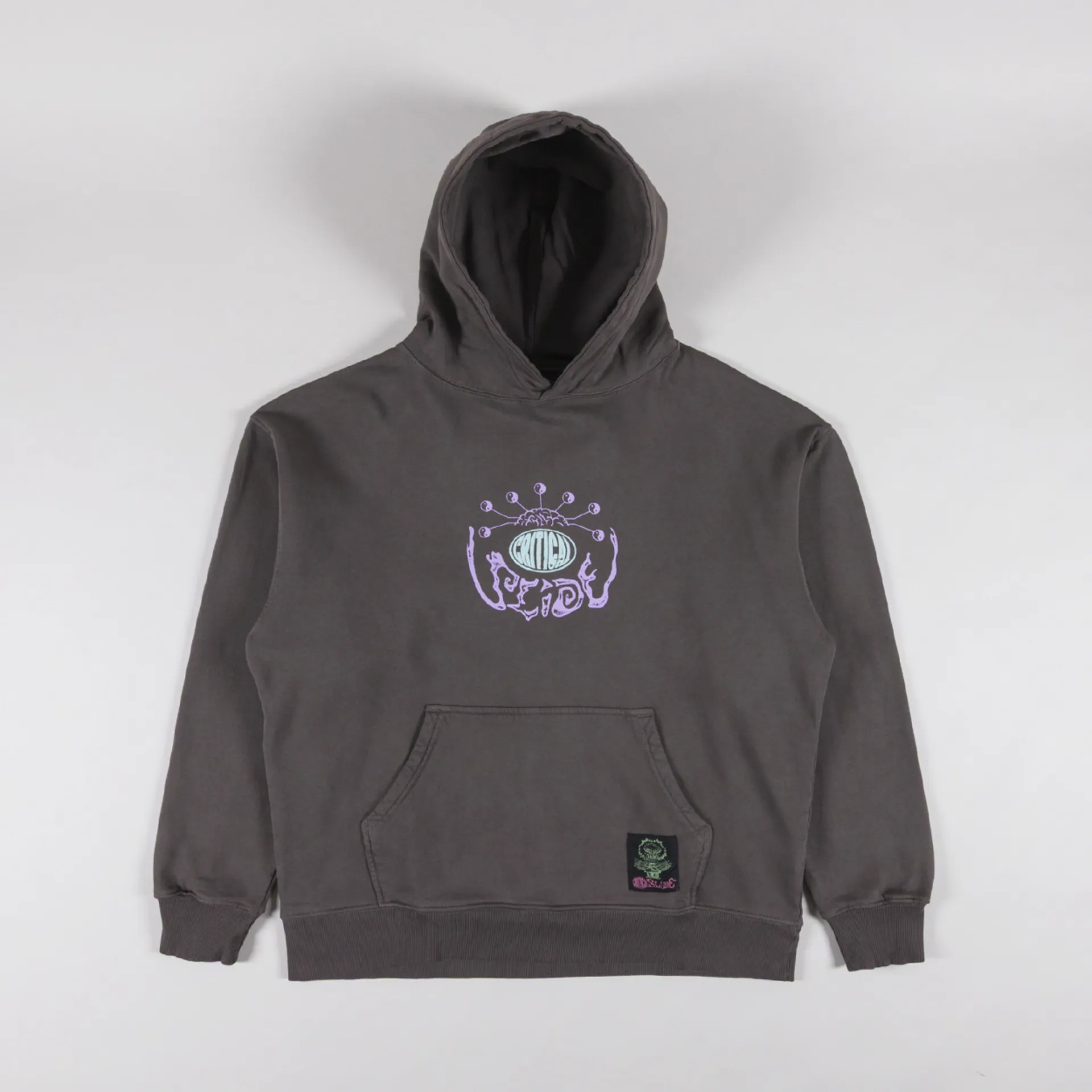 A loose, boxy hoodie from Critical Slide, constructed from 420gsm brushed cotton fleece and garment-dyed/washed for a softer hand feel and worn-in look. It features a ribbed hem and cuffs, with a large hood, kangaroo pocket and woven logo patch. Finished off with some cool graphic prints to the chest and back.
