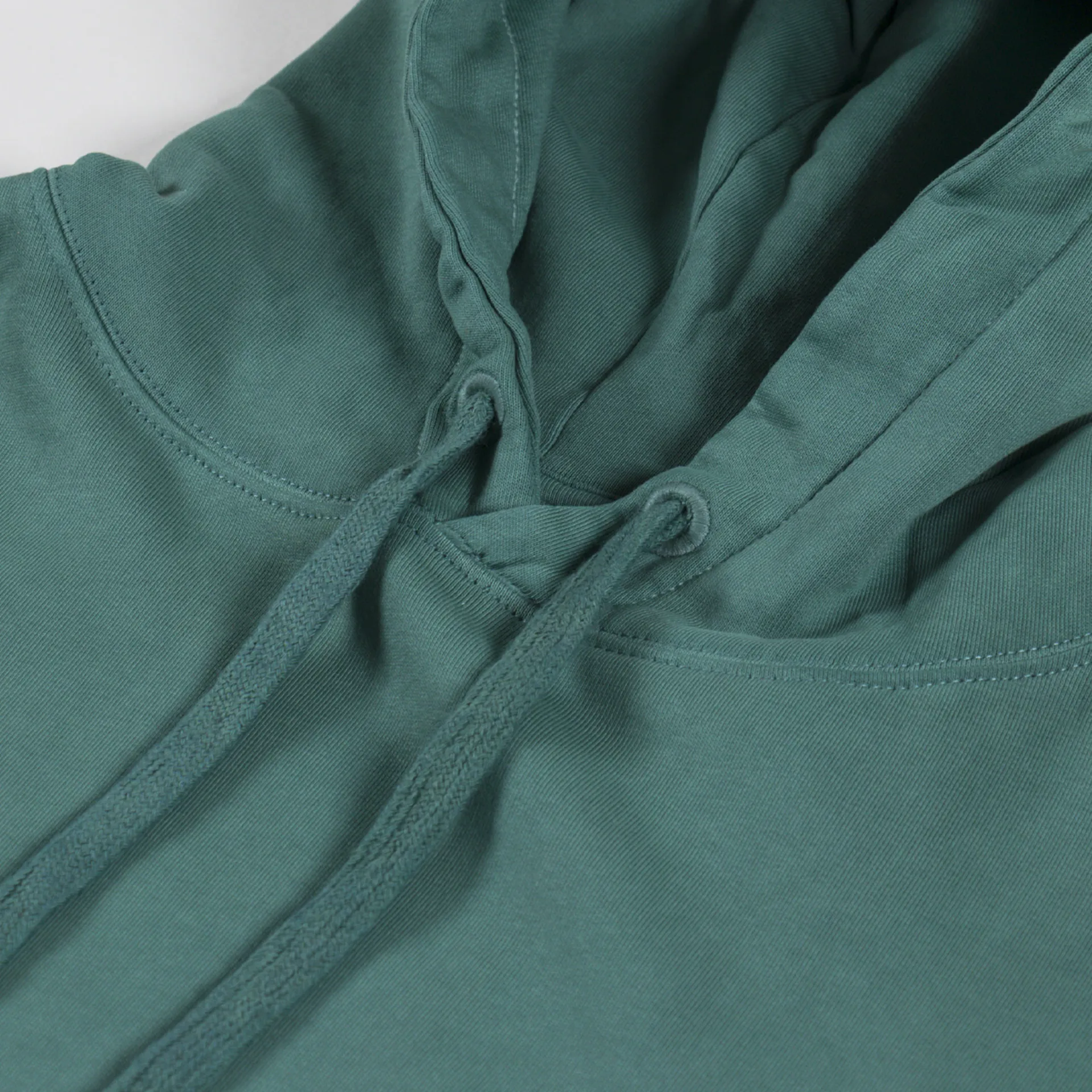 A loose hoodie from Critical Slide, constructed from 420gsm brushed cotton fleece and garment-dyed/washed for a softer hand feel and worn-in look.