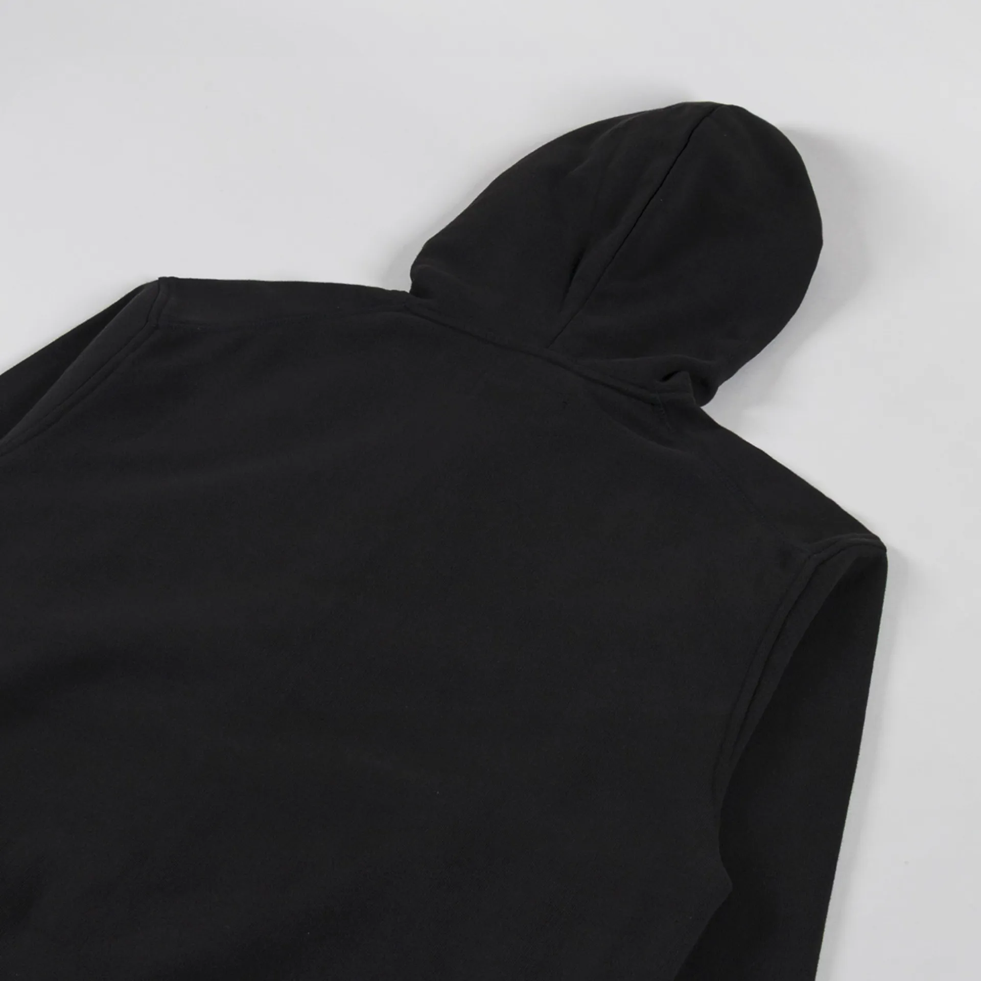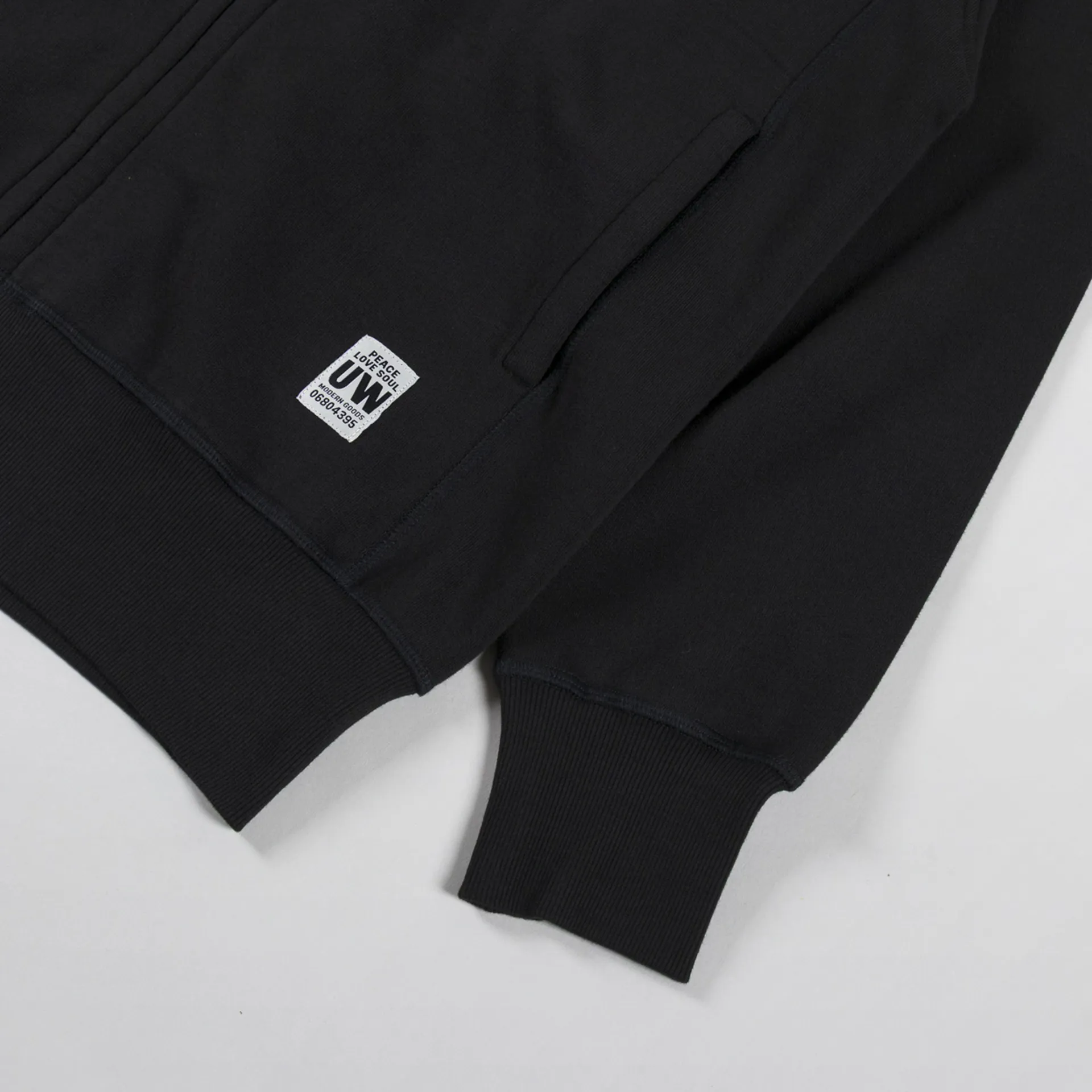 A zip-through hoodie from Universal Works, constructed from durable, mid-weight cotton jersey with a fleece-back lining for comfort. Cut in a relaxed fit with subtle dropped shoulders for a casual look. It features a classic drawstring hood, two front hand pockets, a ribbed hem and cuffs. The design is complete with a Universal Works 'Peace, love, soul' logo to the front.