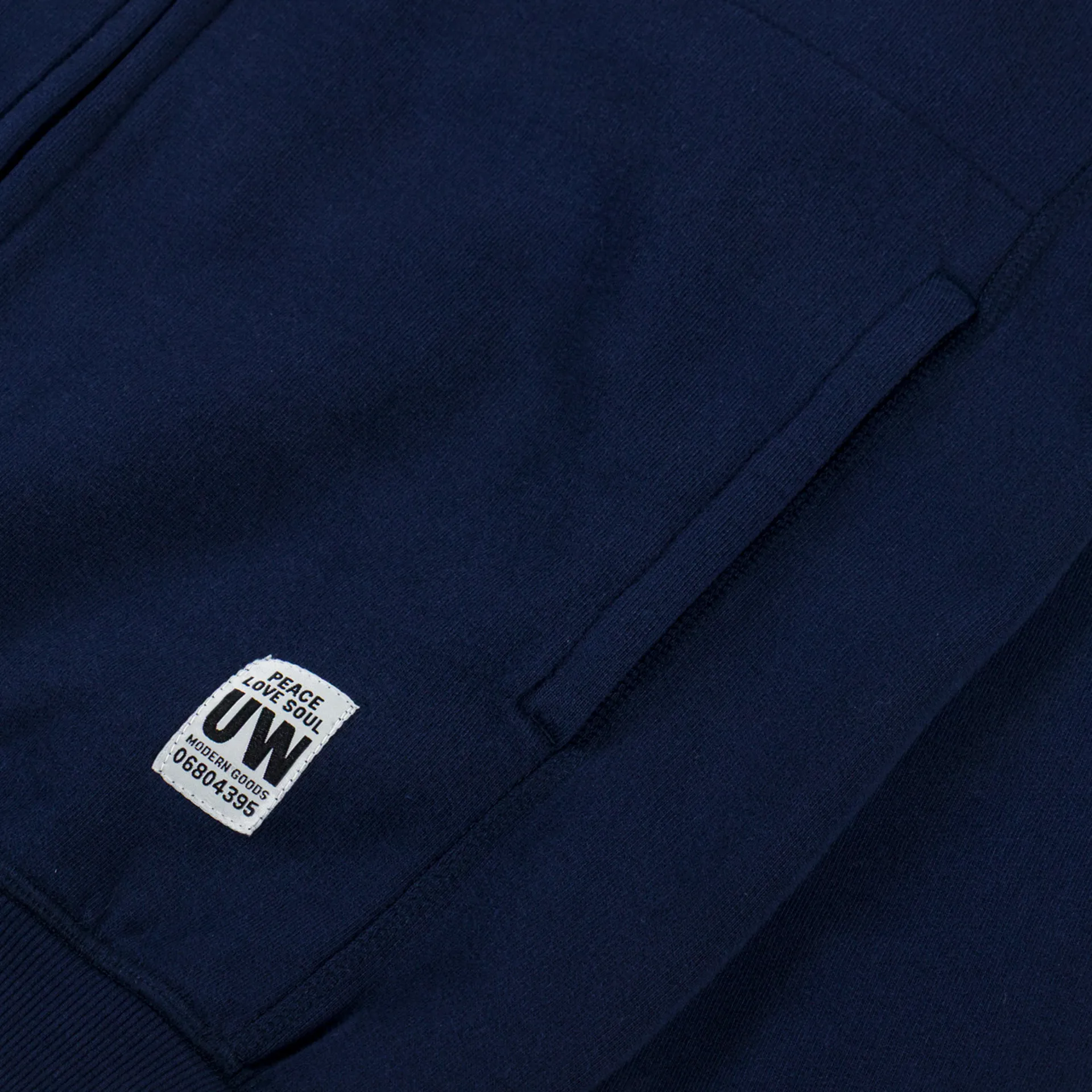 A zip-through hoodie from Universal Works, constructed from durable, mid-weight cotton jersey with a fleece-back lining for comfort. Cut in a relaxed fit with subtle dropped shoulders for a casual look. It features a classic drawstring hood, two front hand pockets, a ribbed hem and cuffs. The design is complete with a Universal Works 'Peace, love, soul' logo to the front.