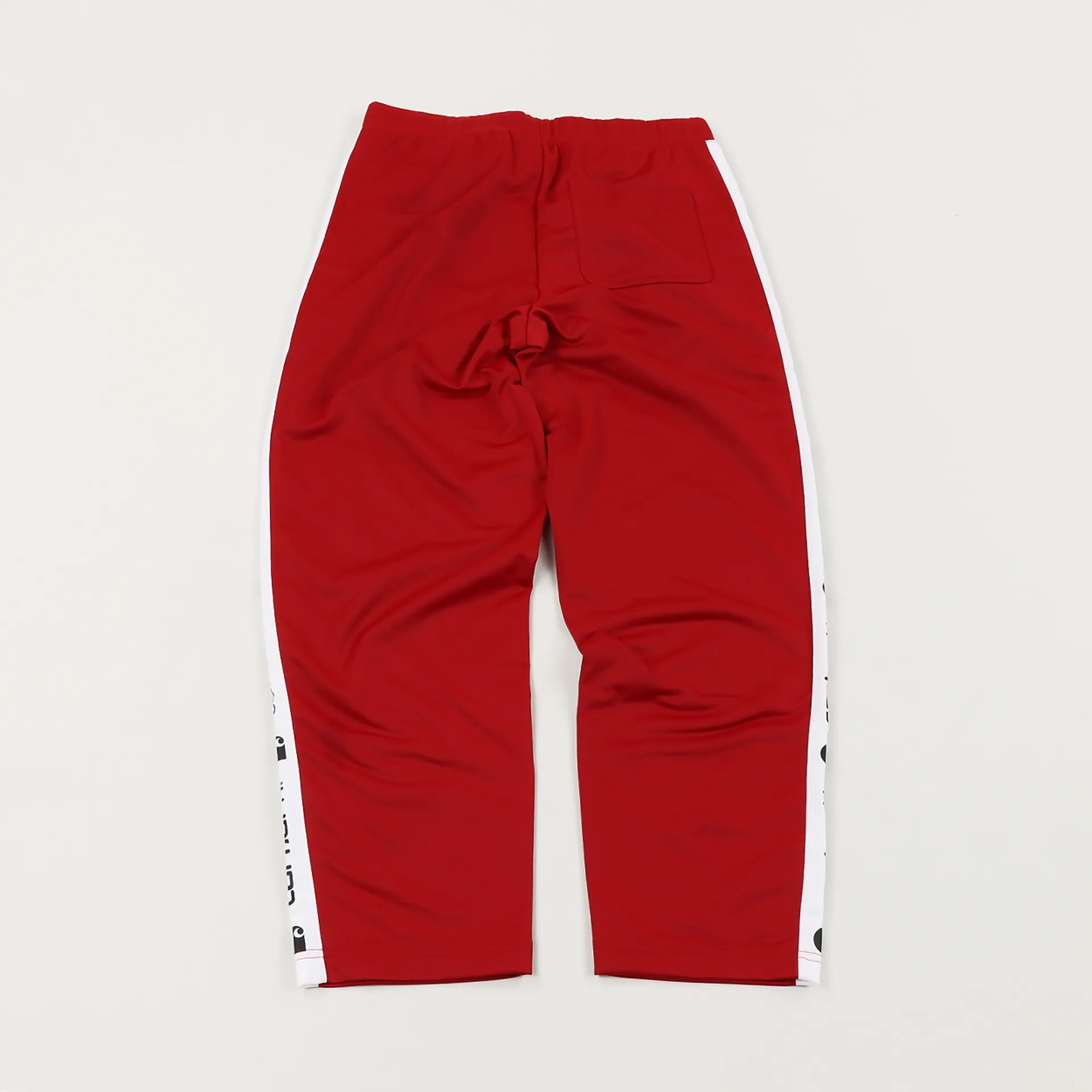 A pair of tracksuit pants from Carhartt WIP made from 100% polyester with a tricot lining and a graphic logo tape running down the legs. It has three pockets and an elasticated waist.