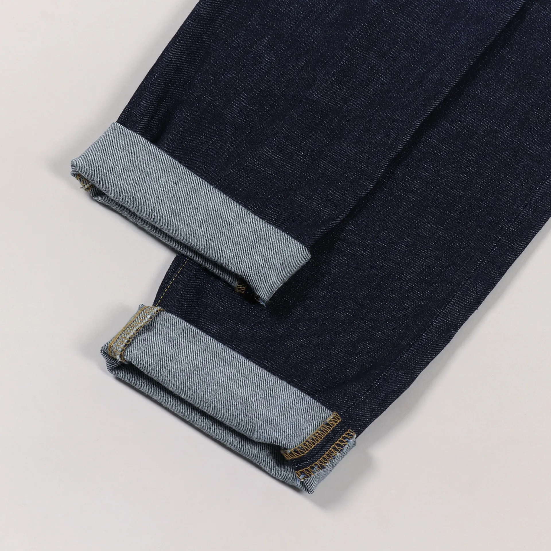 A pair of jeans from Carhartt WIP made from 100% cotton 'Edgewood' denim with a leather logo patch and metal rivets or bartack stitching at high-stress points.