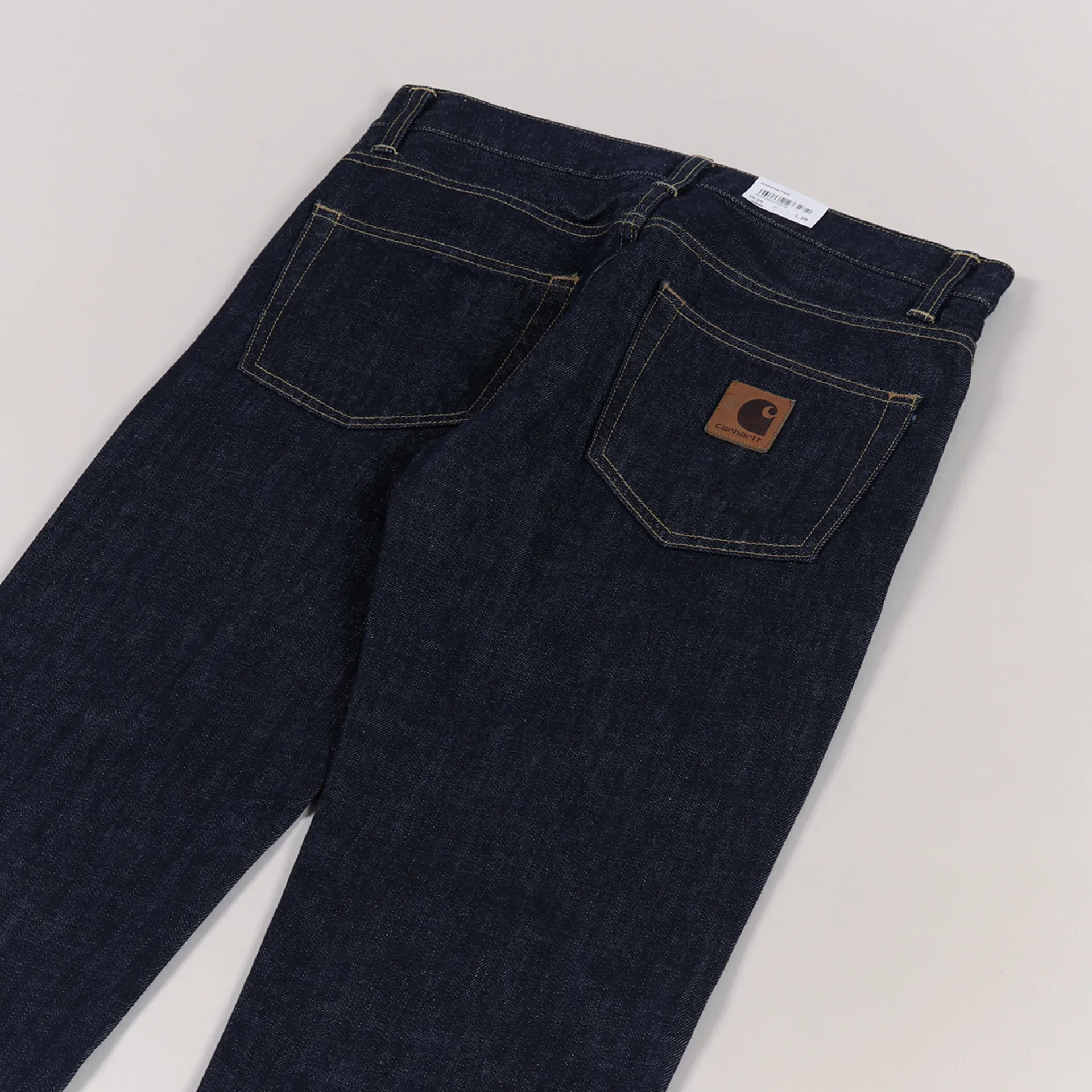 A pair of jeans from Carhartt's European streetwear collection 'Work In Progress', made from a durable yet comfortable 100% cotton 'Edgewood' denim with a leather logo patch andmetal rivets or bartack stitching at high-stress points. The jeans have a five pocket design, a button-up fly and a back yoke.