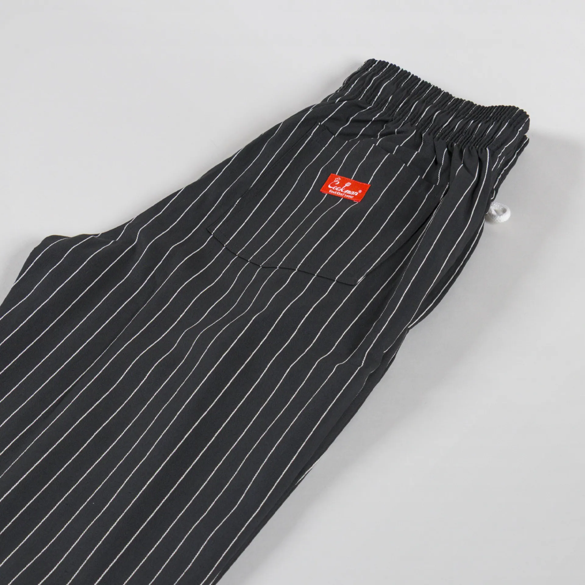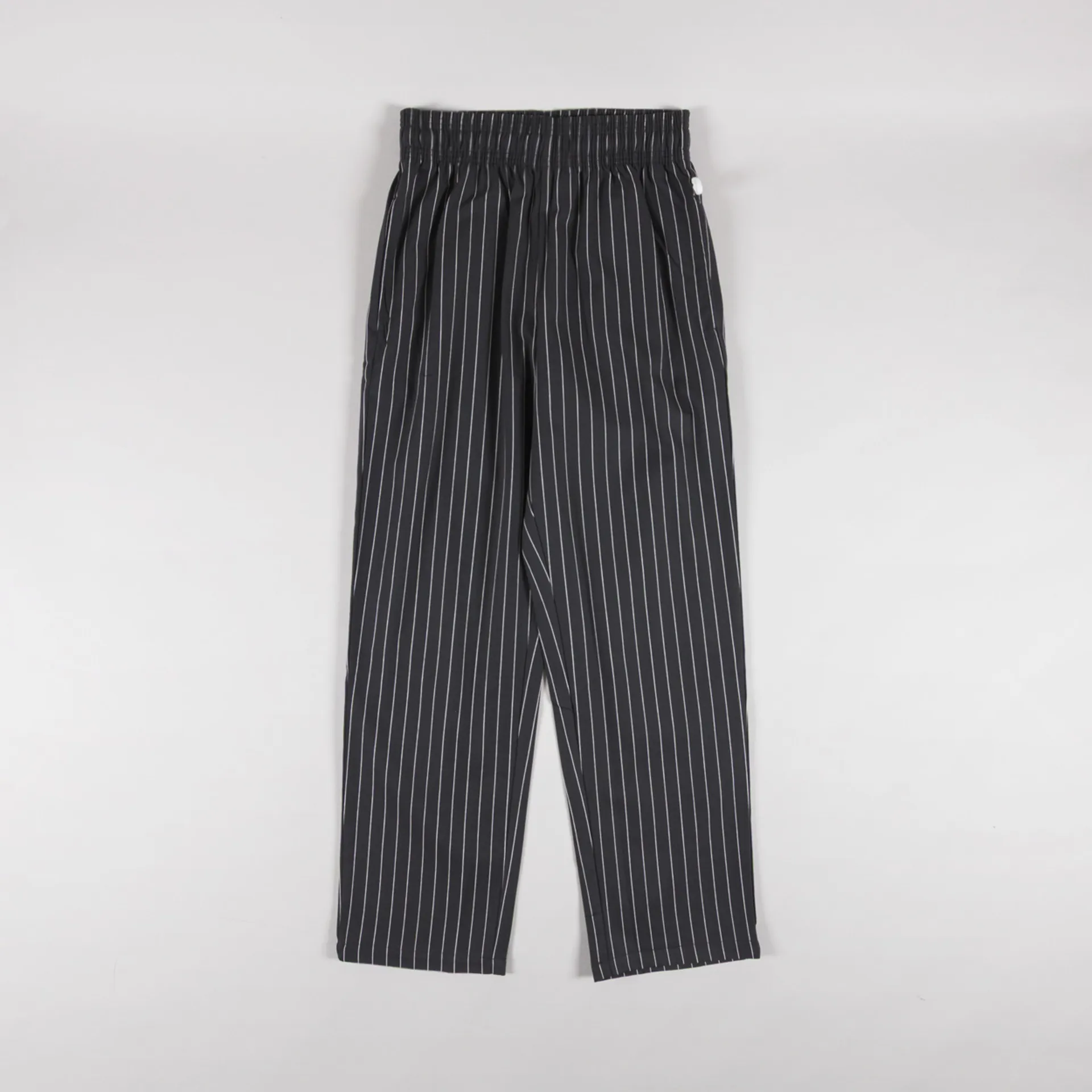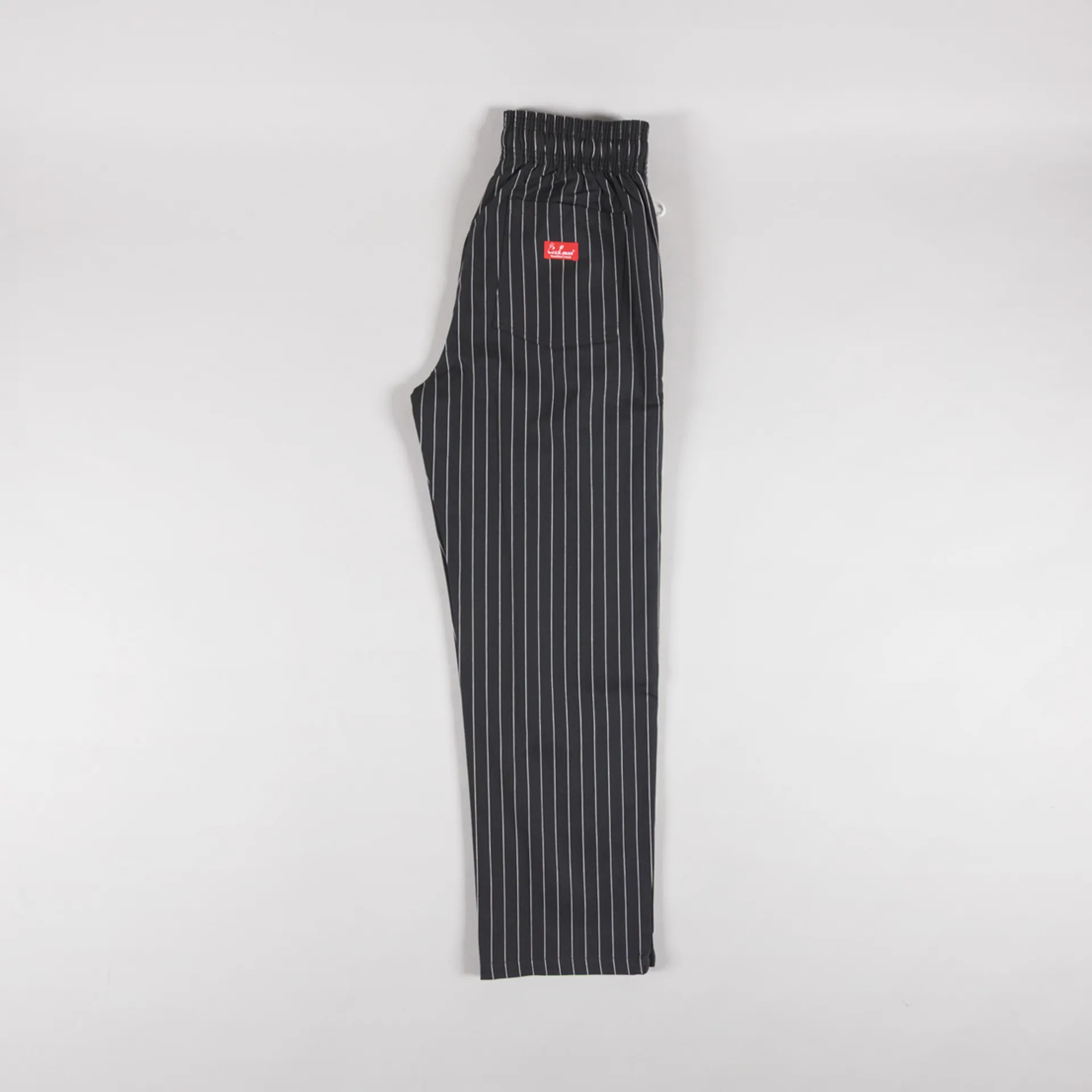 A pair of striped trousers from Cookman, the semi-wide version has a relaxed straight leg and is slightly shorter in length compared to the regular chef pant.