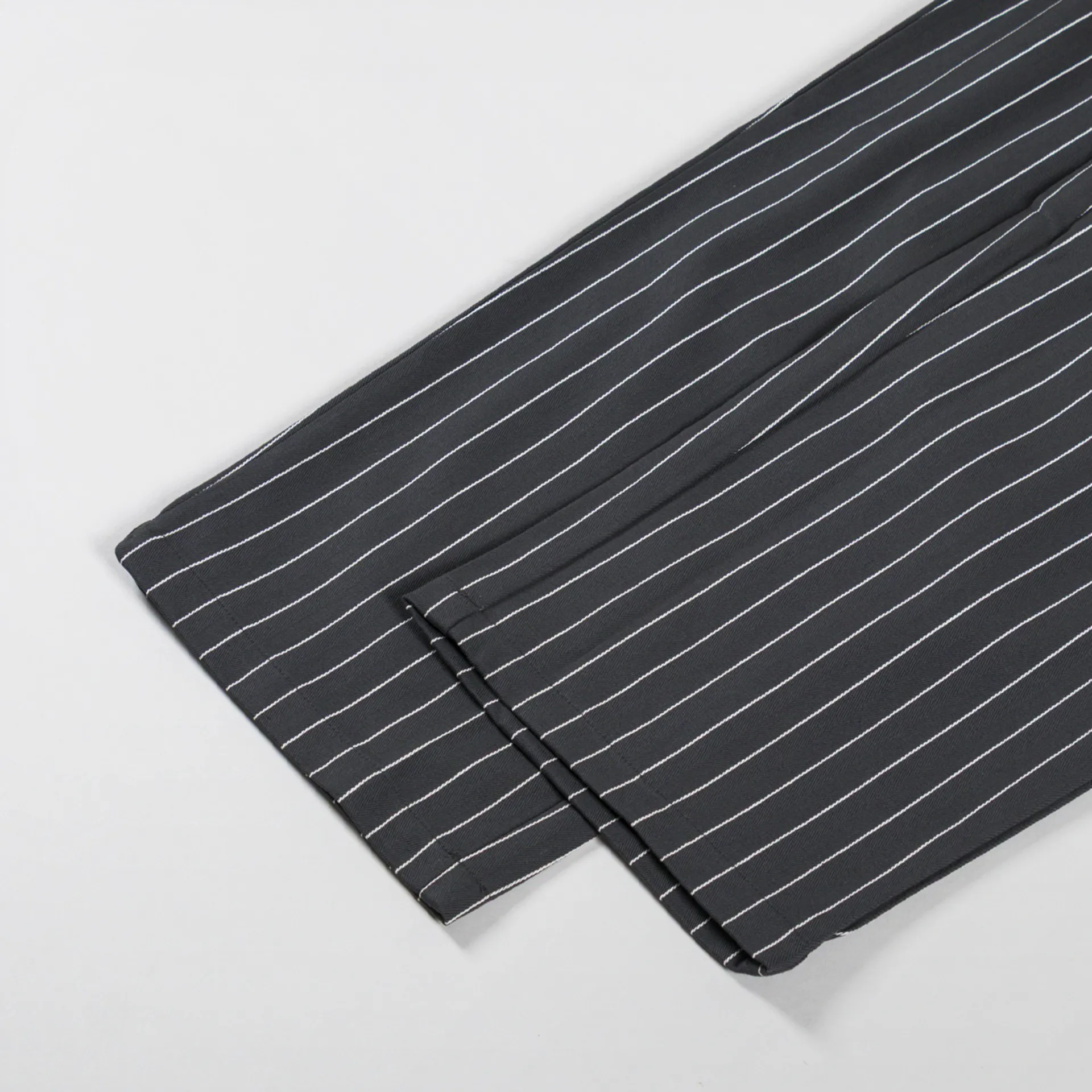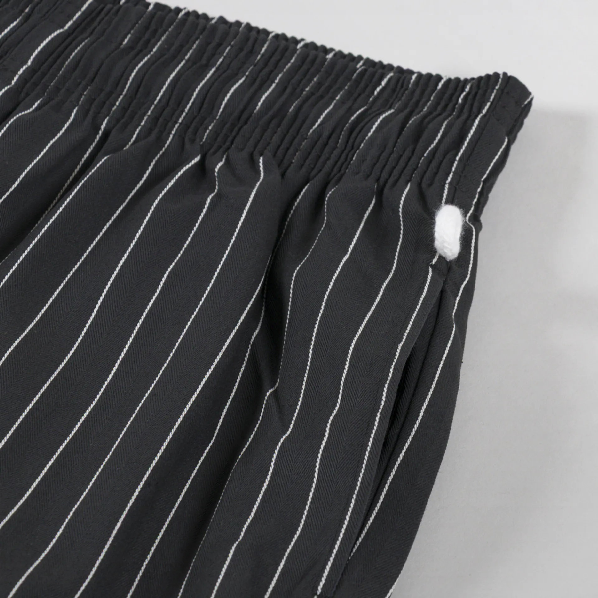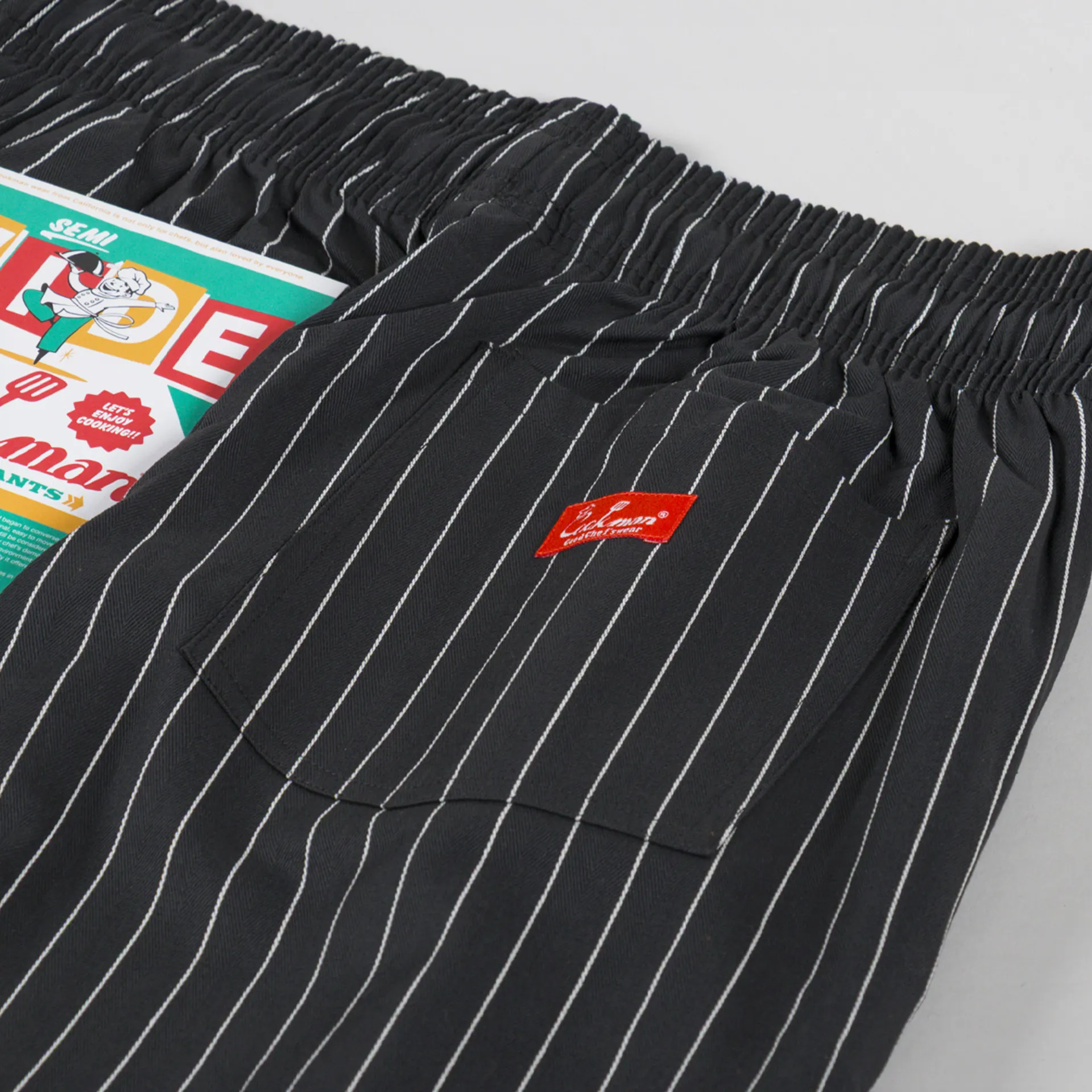 A pair of striped trousers from Cookman, the semi-wide version has a relaxed straight leg and is slightly shorter in length compared to the regular chef pant.
