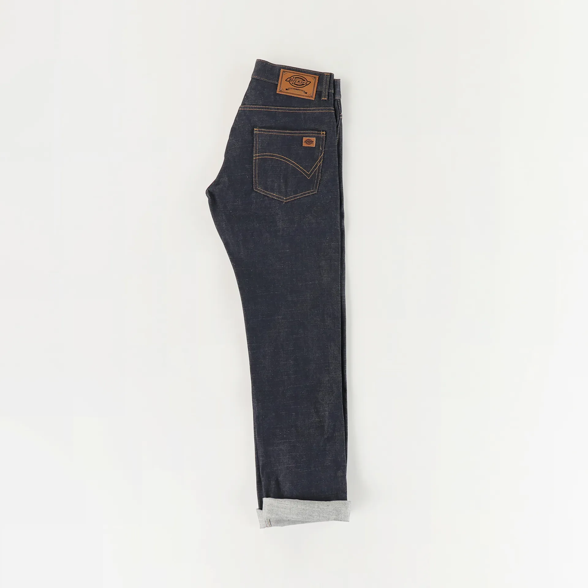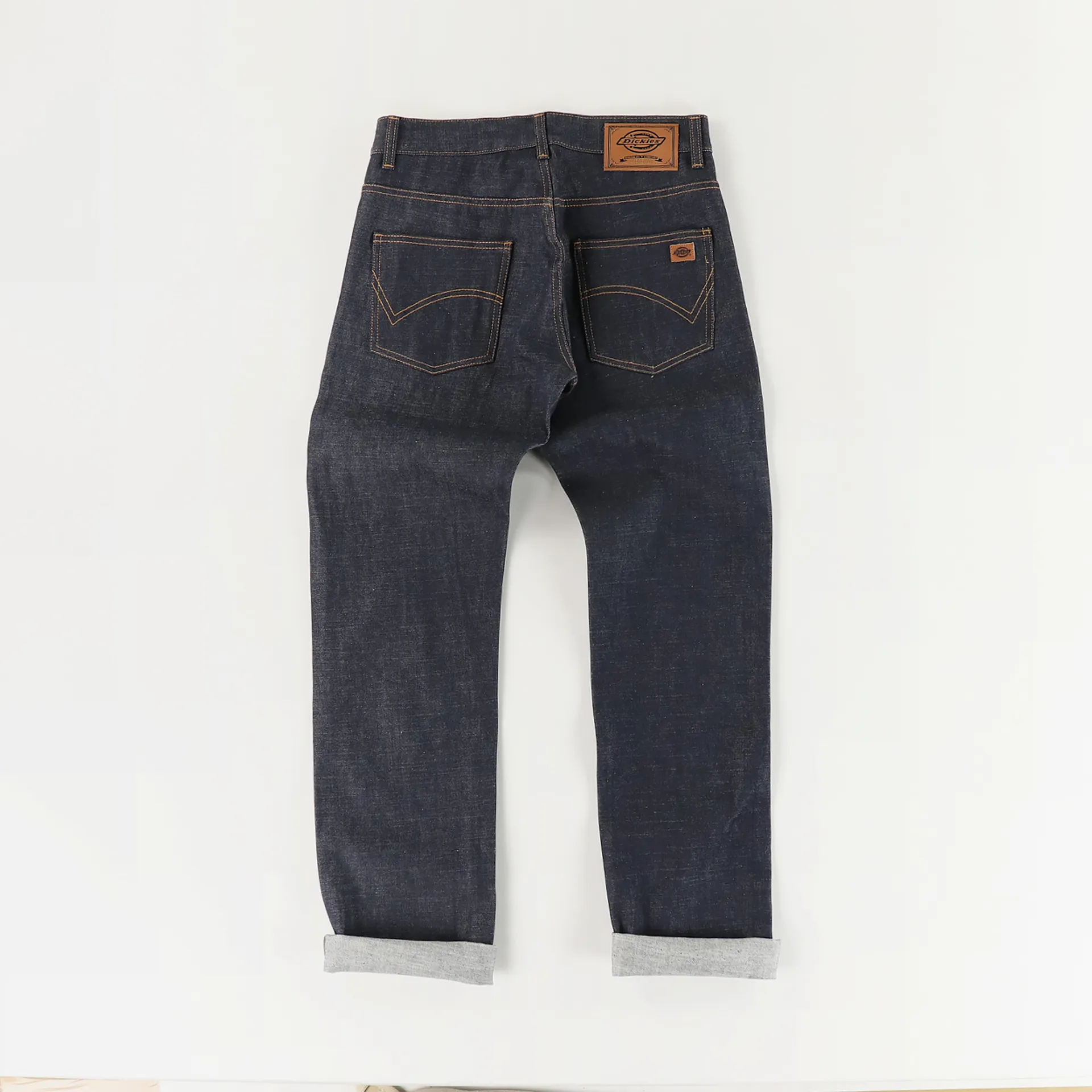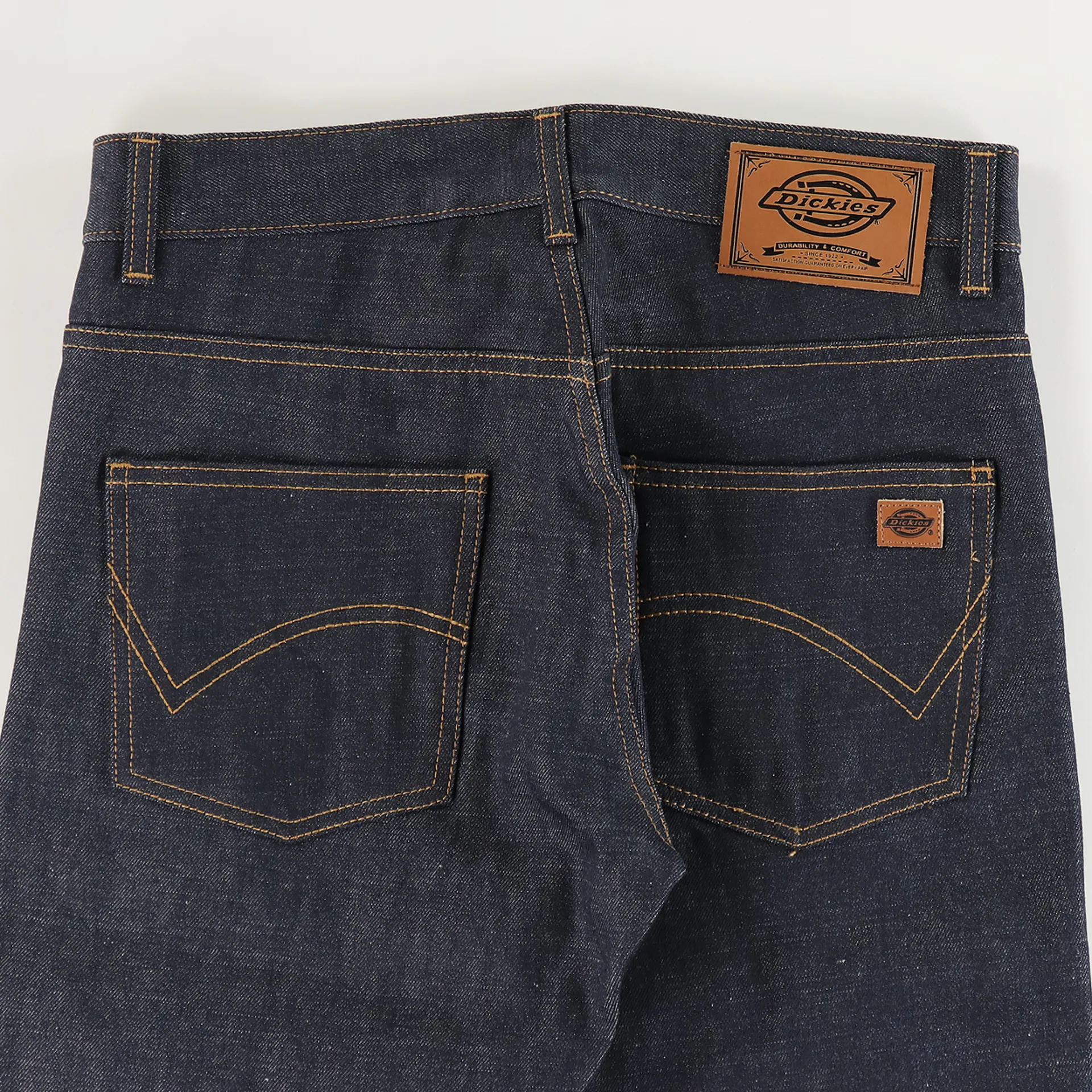 A pair of jeans from Dickies Lifestyle made from 100% cotton with leather detailing and a selvedge leg. It's a regular straight fit with a five pocket design.