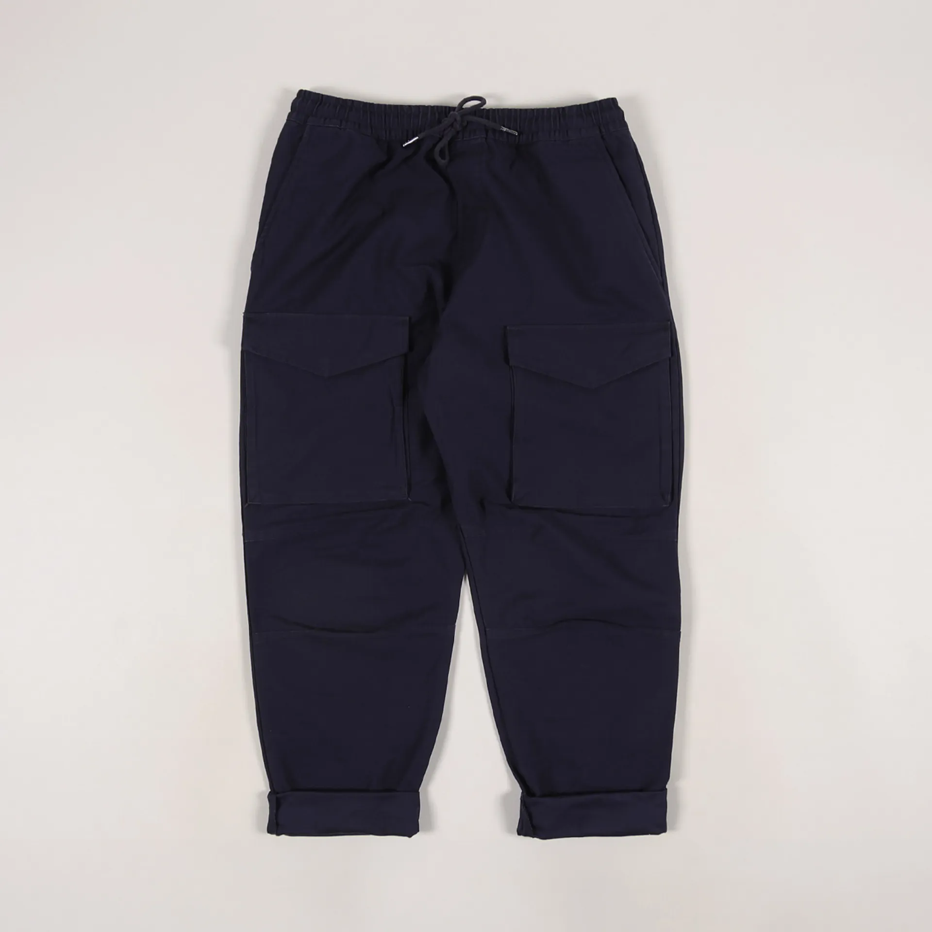 A pair of cargo pants from Edwin made from a comfortable yet durable 100% cotton sateen, with an elasticated and drawstring waist, a six pocket pargo design with patch pockets to the front, and a woven logo patch to the rear.