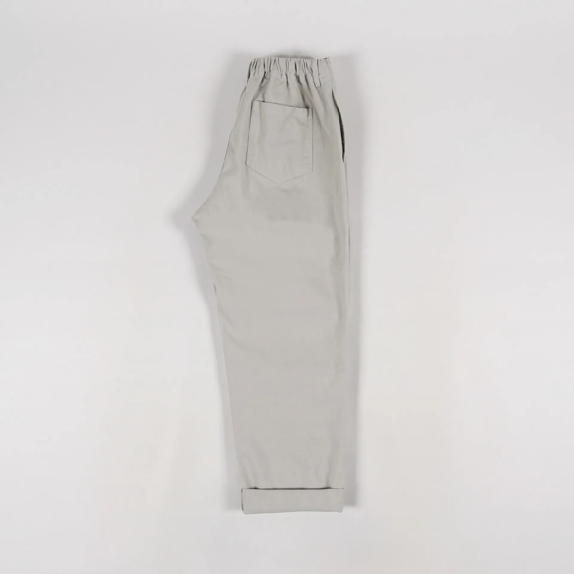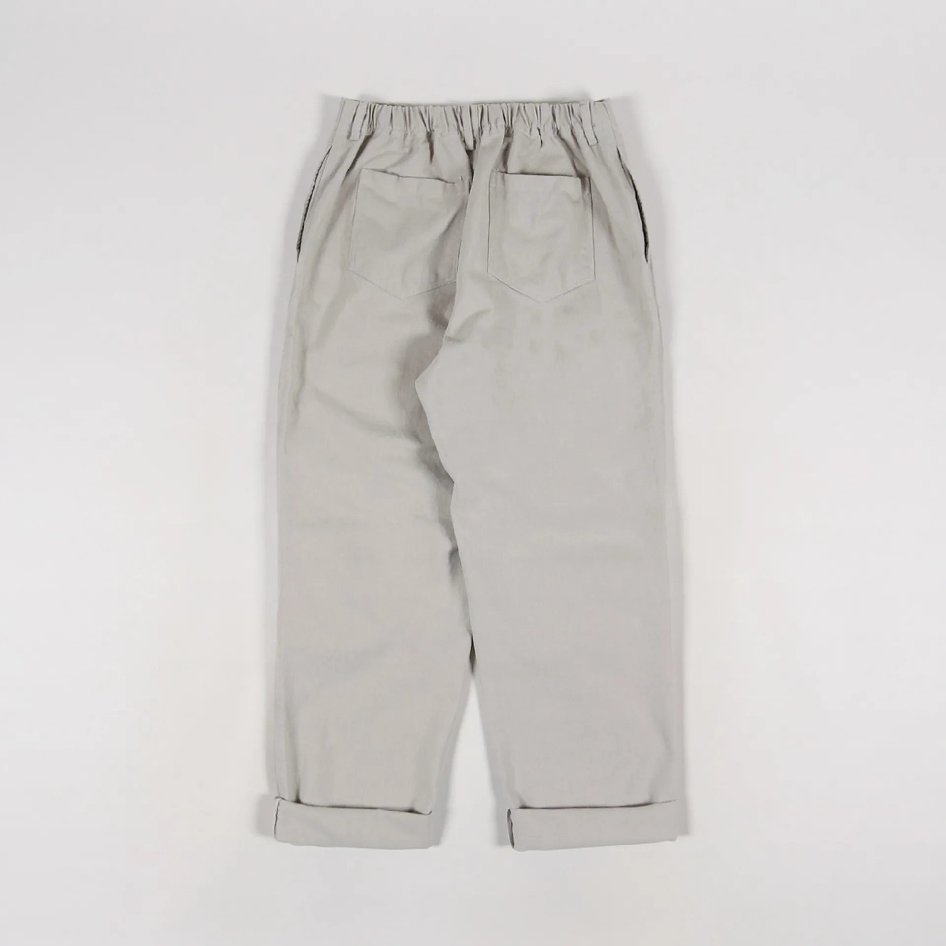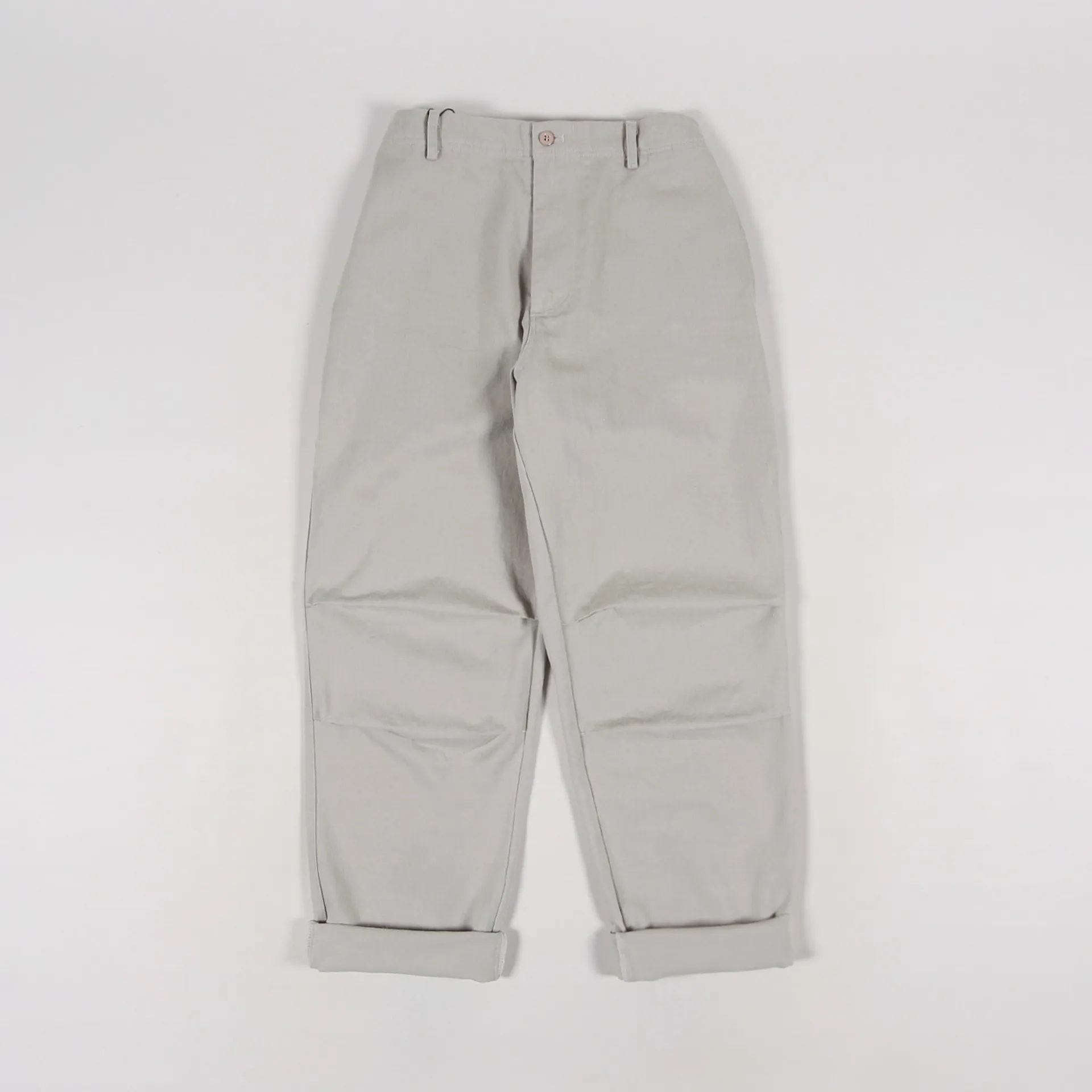 A pair of trousers from Korean clothing label FrizmWORKS made from a comfortable 100% cotton twill with a soft garment wash, a zip and button fly, a four pocket design and a half-elasticated waist.