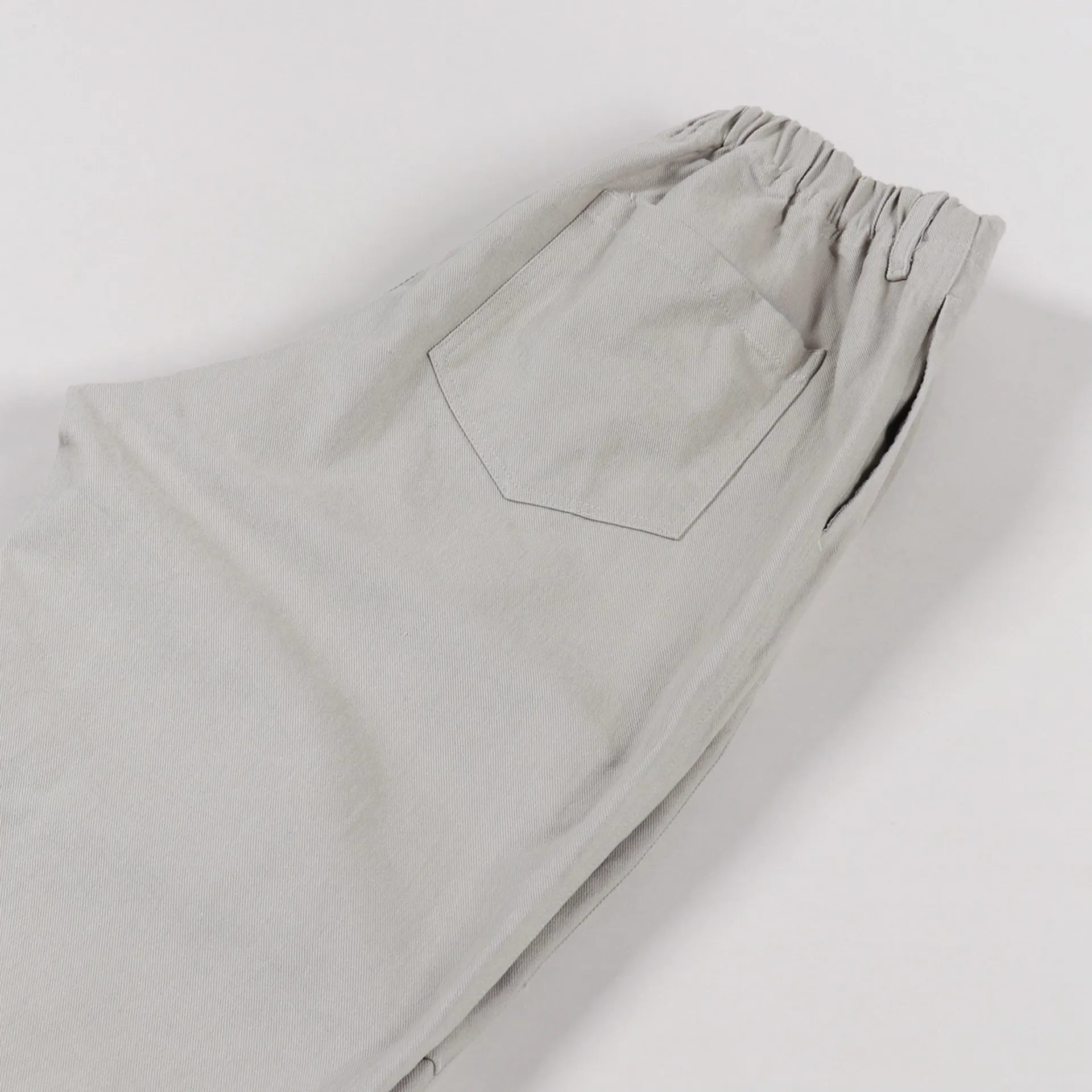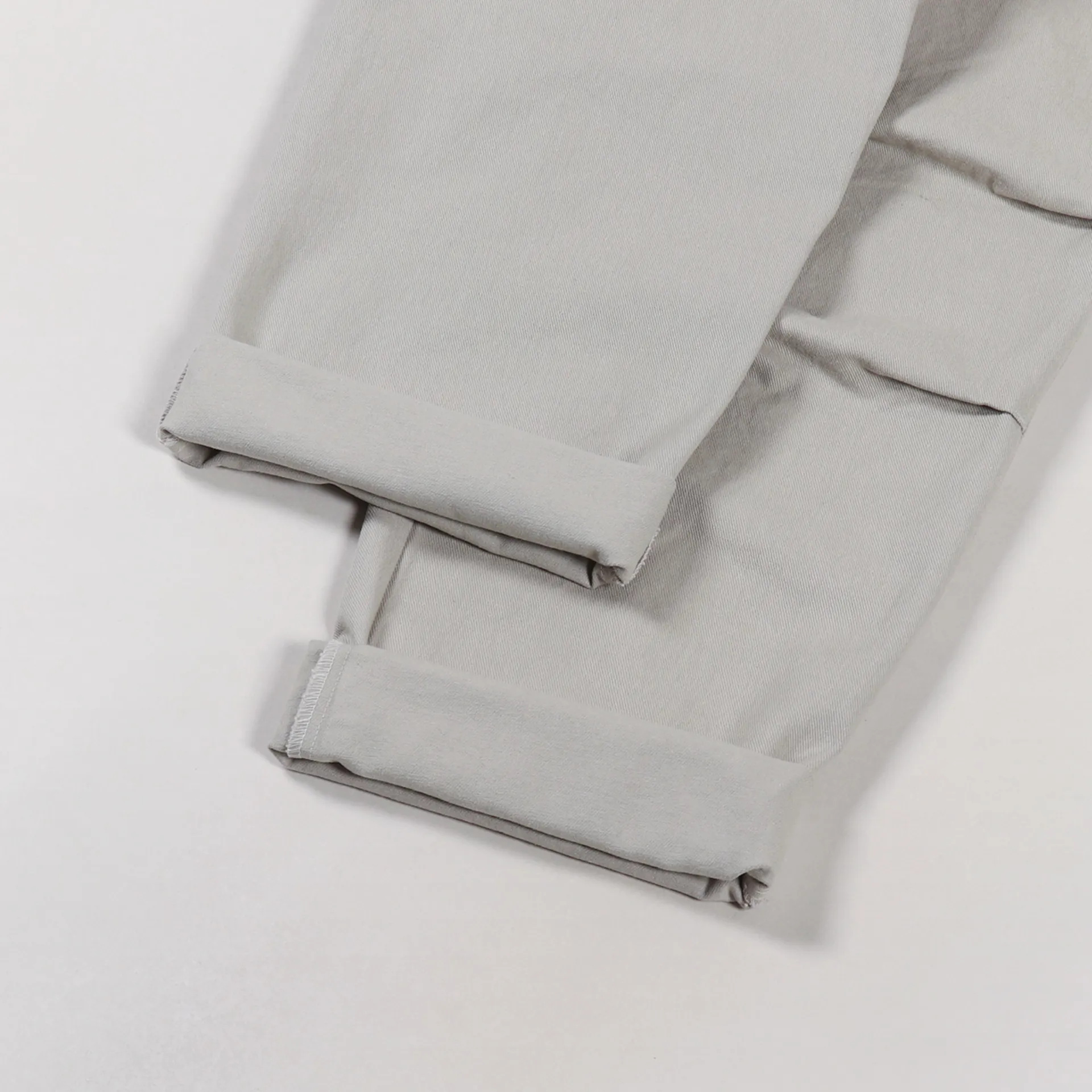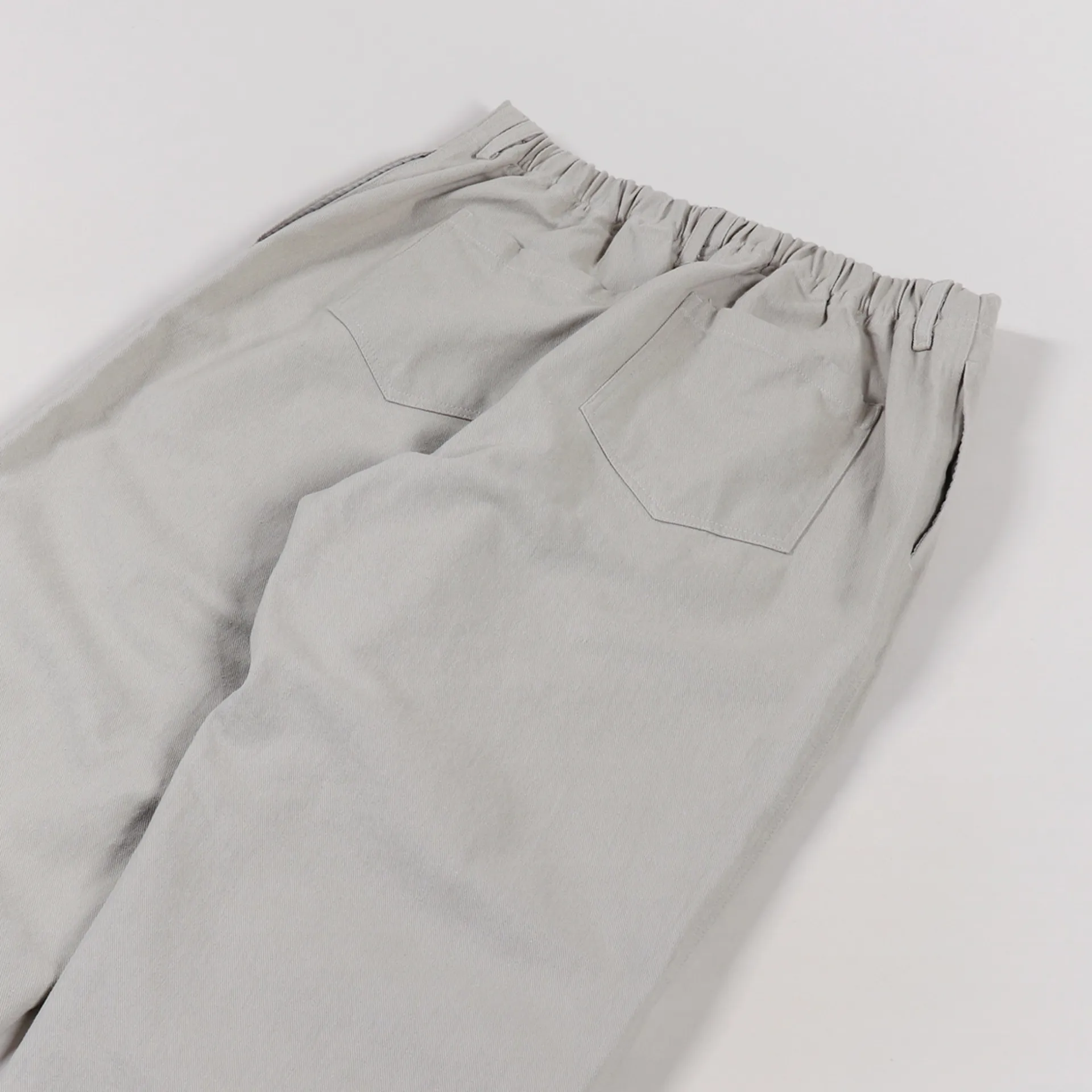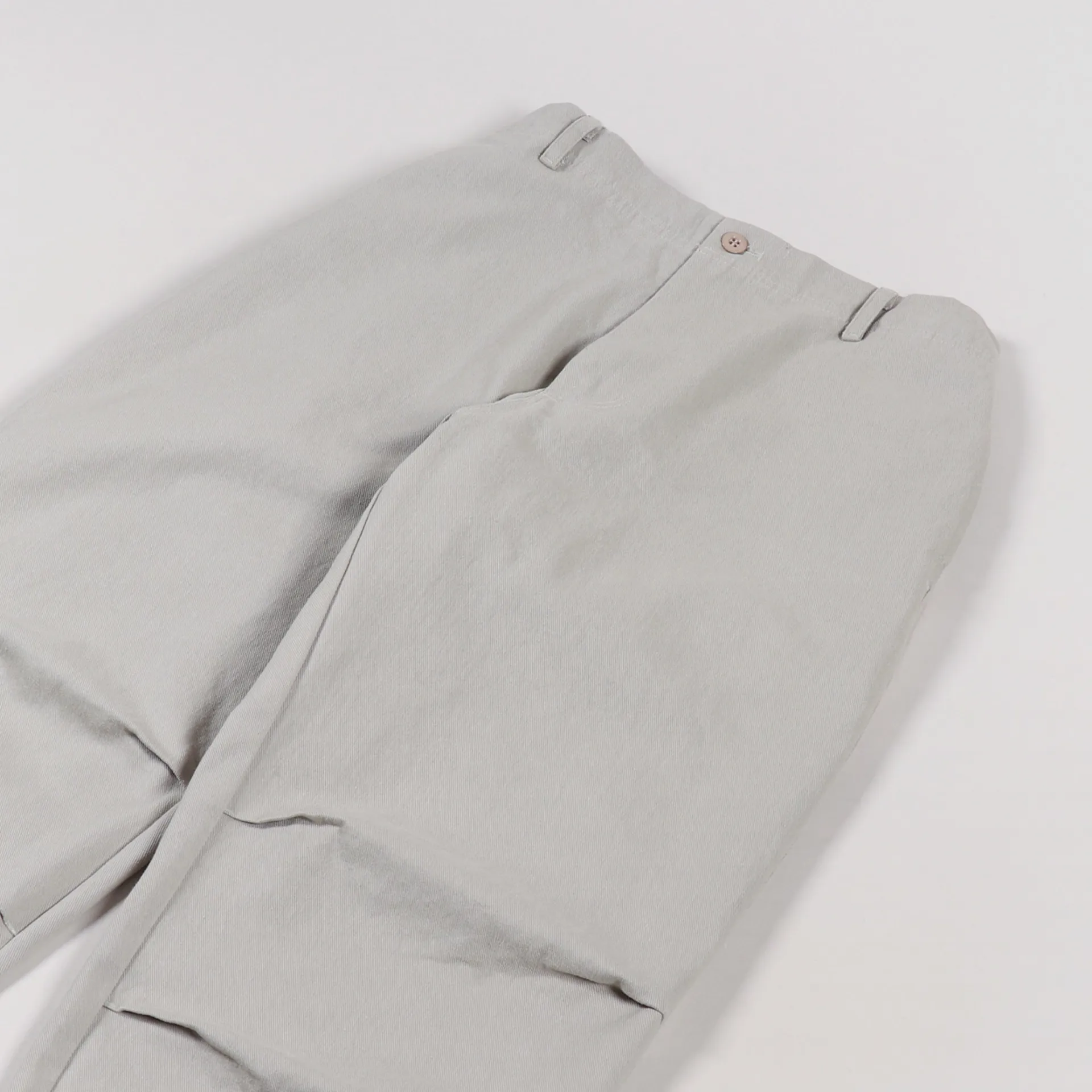 A pair of trousers from Korean clothing label FrizmWORKS made from a comfortable 100% cotton twill with a soft garment wash, a zip and button fly, a four pocket design and a half-elasticated waist.