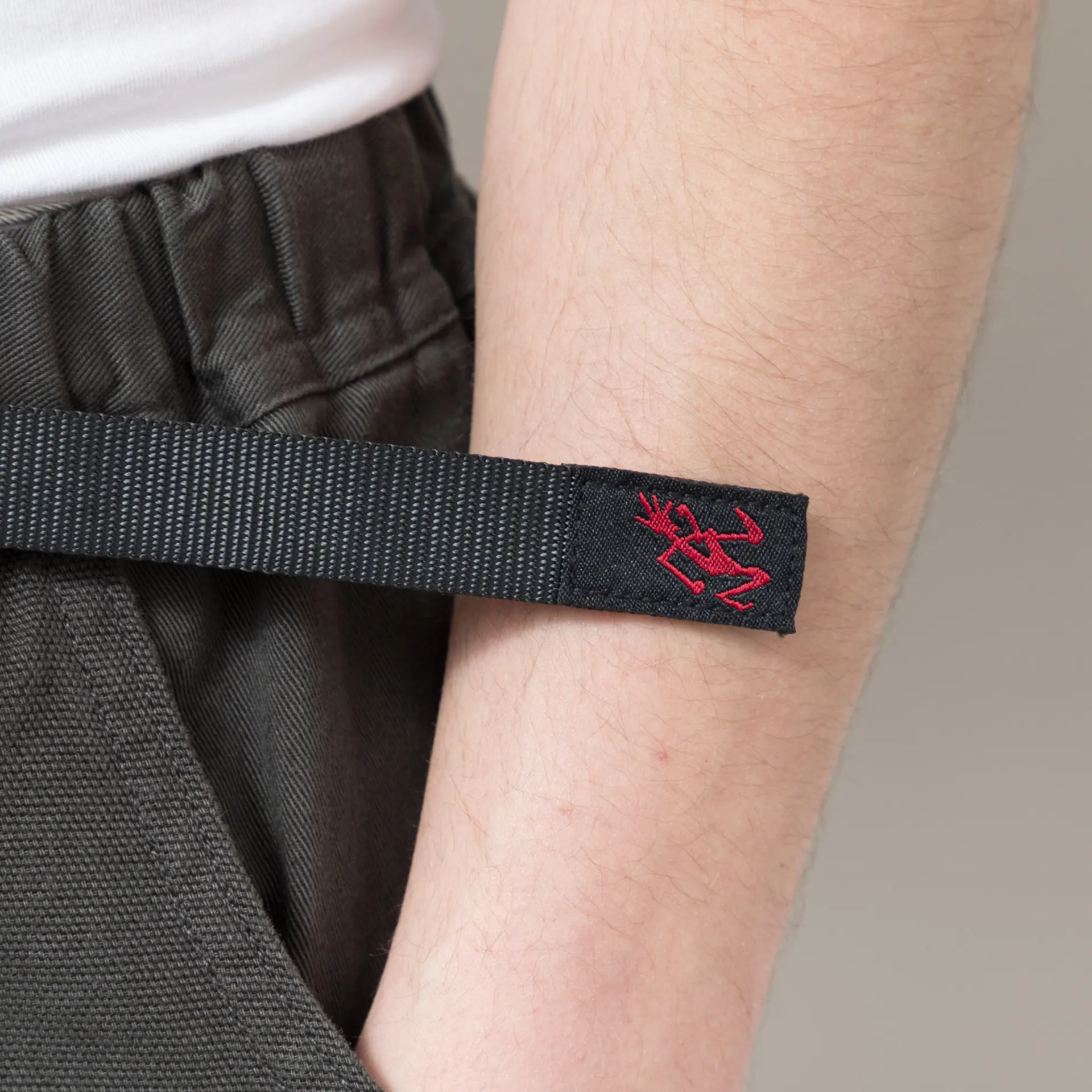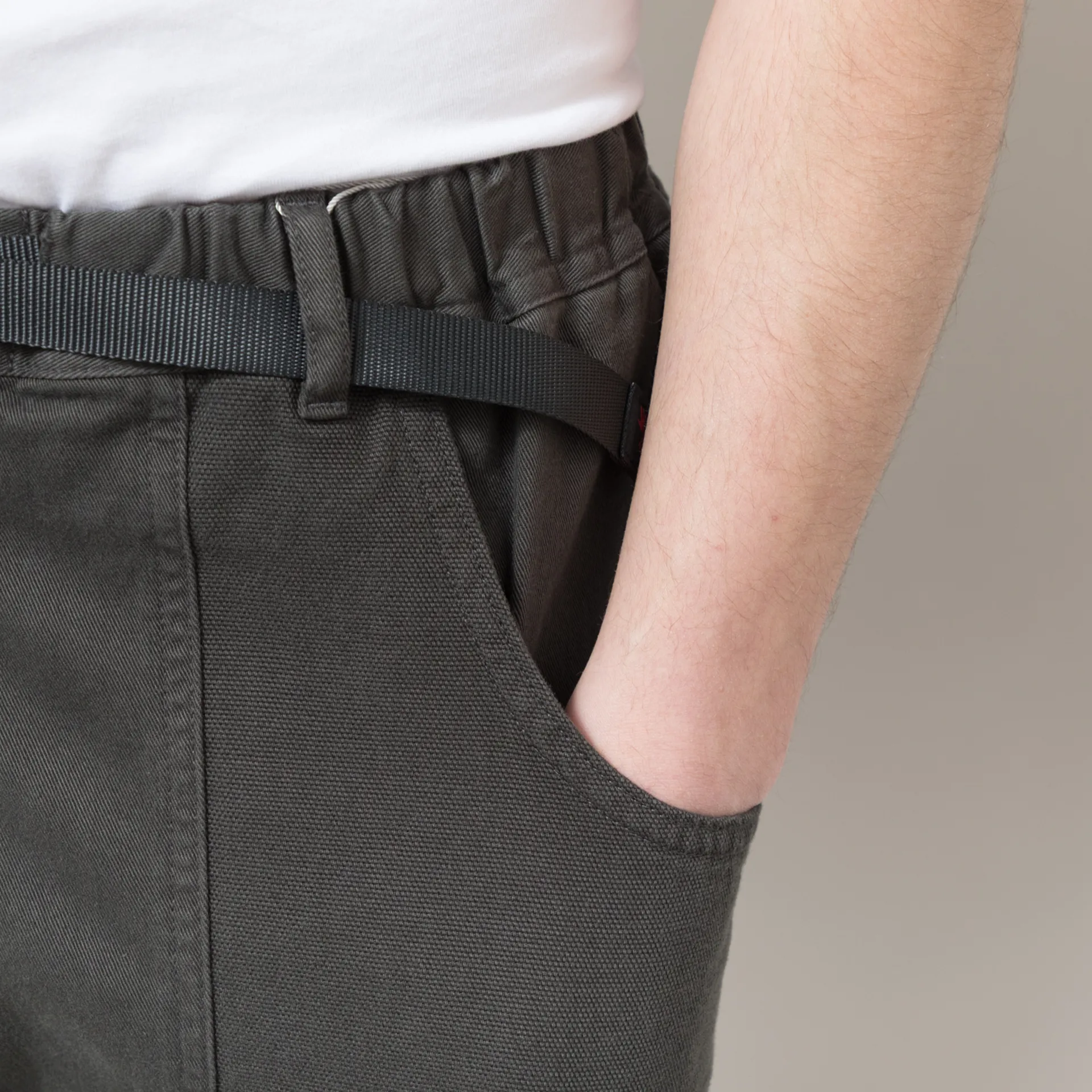A pair of climbing pants from Gramicci, made from a comfortable yet durable 100% organic cotton twill with large canvas pockets and a woven climbing belt to the elasticated waist.