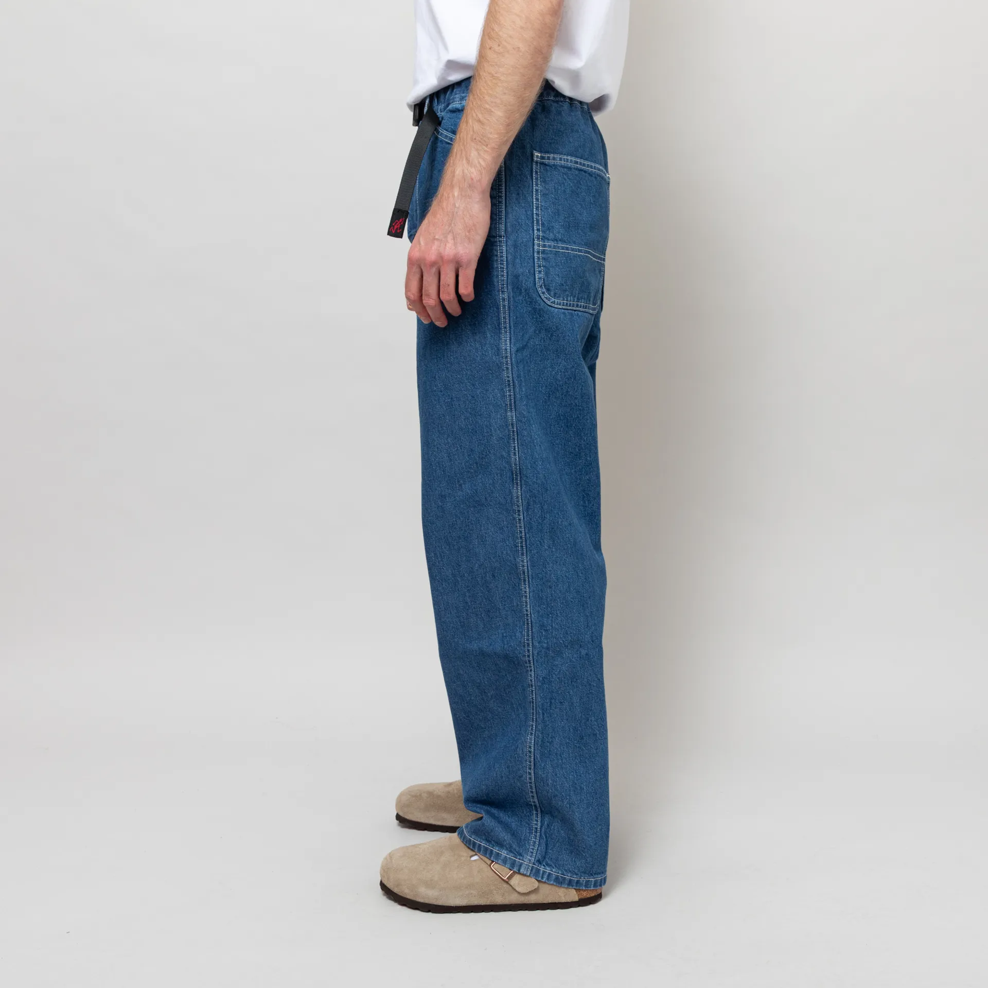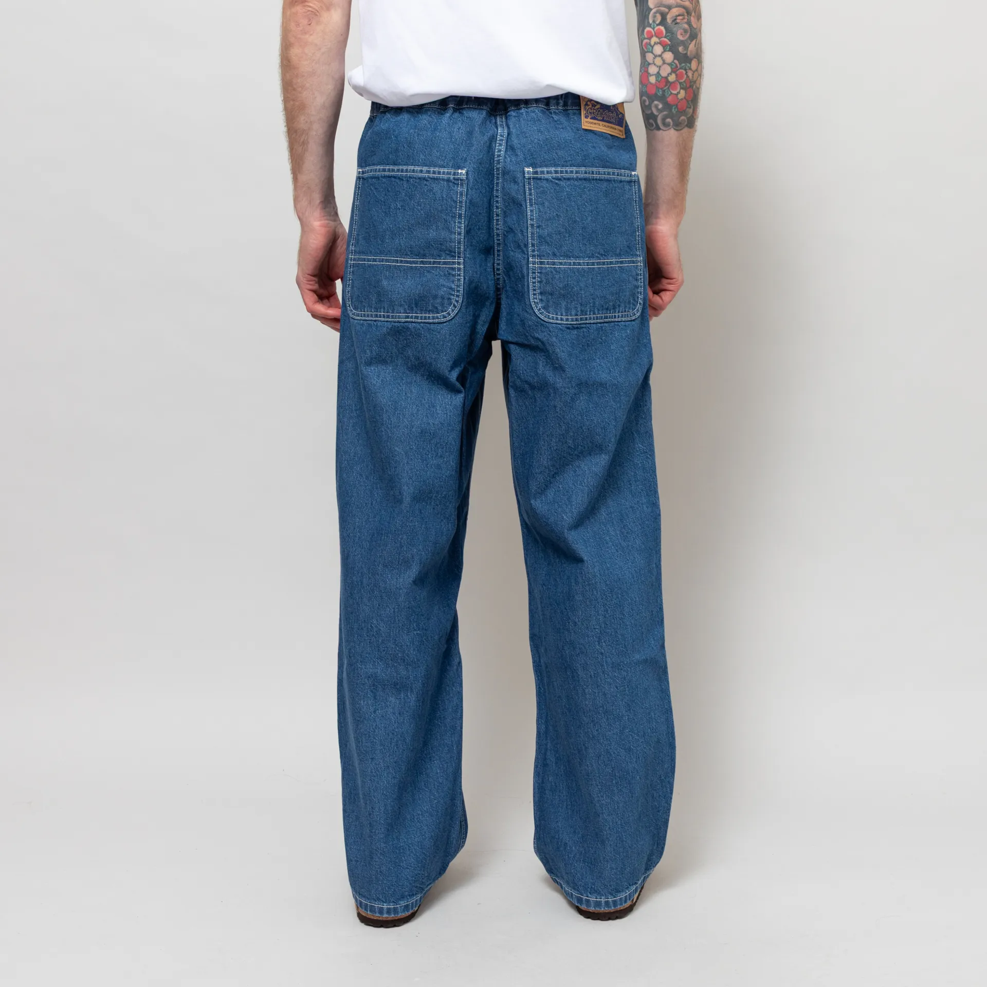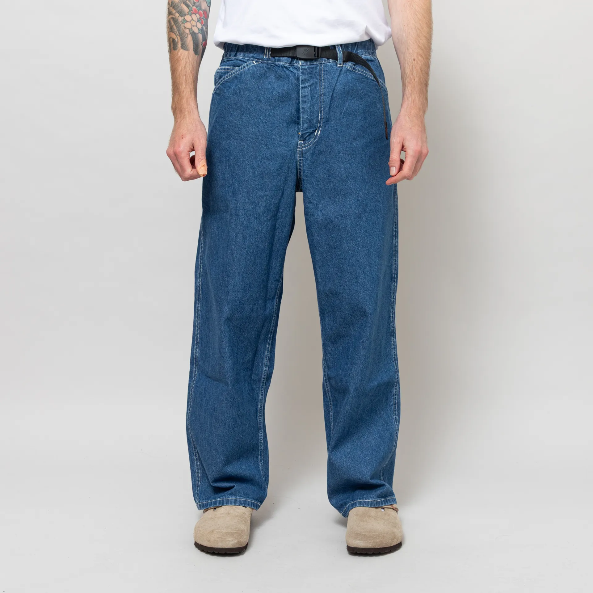 A pair of jeans from Gramicci, constructed from 11oz eco cotton denim with contrast white stitching throughout. They have a relaxed, straight leg and feature an elasticated waistband with an integrated belt to adjust the fit. Featuring two front slash pockets, one with a smaller inside pocket, two back patch pockets and Gramicci patch to the rear waistband.
