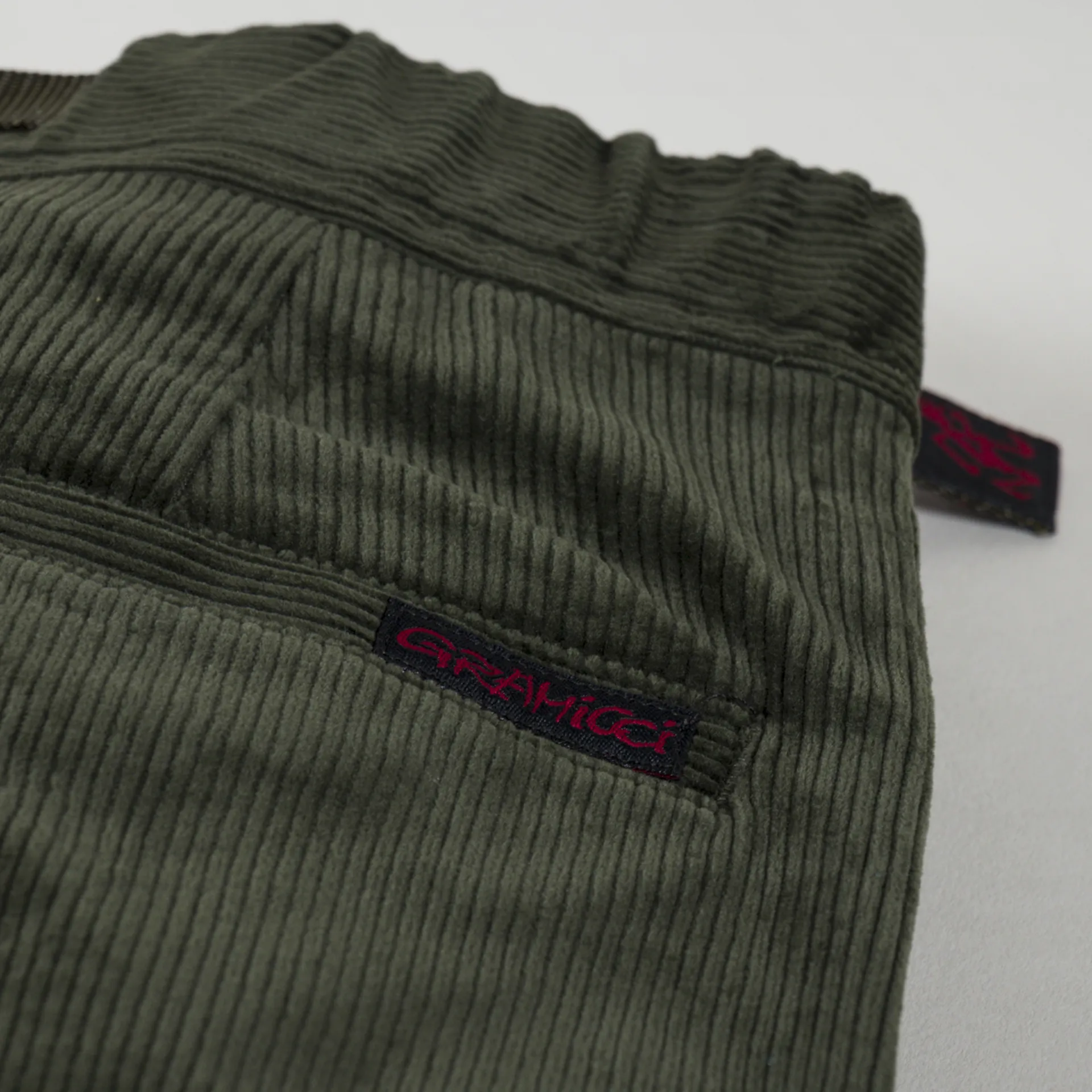 A pair of trousers from American climbing label Gramicci, made from a comfortable cotton stretch corduroy with a zip and button fly, pleated in the front, a woven clip belt and two pockets on the back