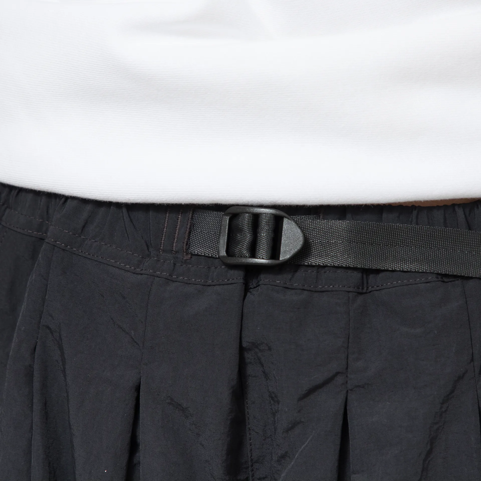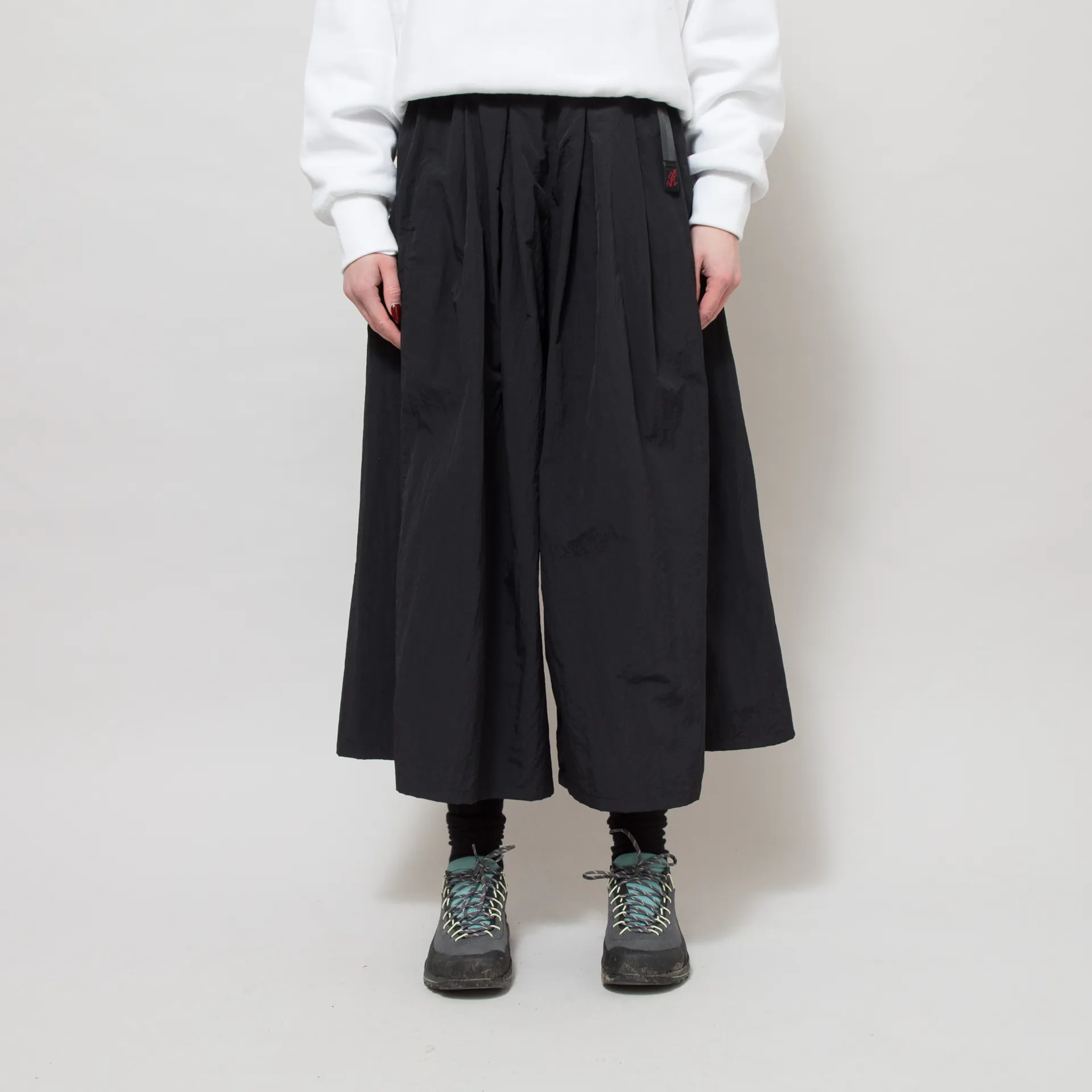 The Nyon Flare Pants from Gramicci have been cut with a super wide leg, almost skirt-like with deep tucks and drapes in the front. Crafted from Gramicci Durable Nylon which has a dry touch and a washed feeling. Featuring two slant pockets to the front and the iconic Gramicci adjustable, integrated nylon belt with a woven logo patch to the end.
