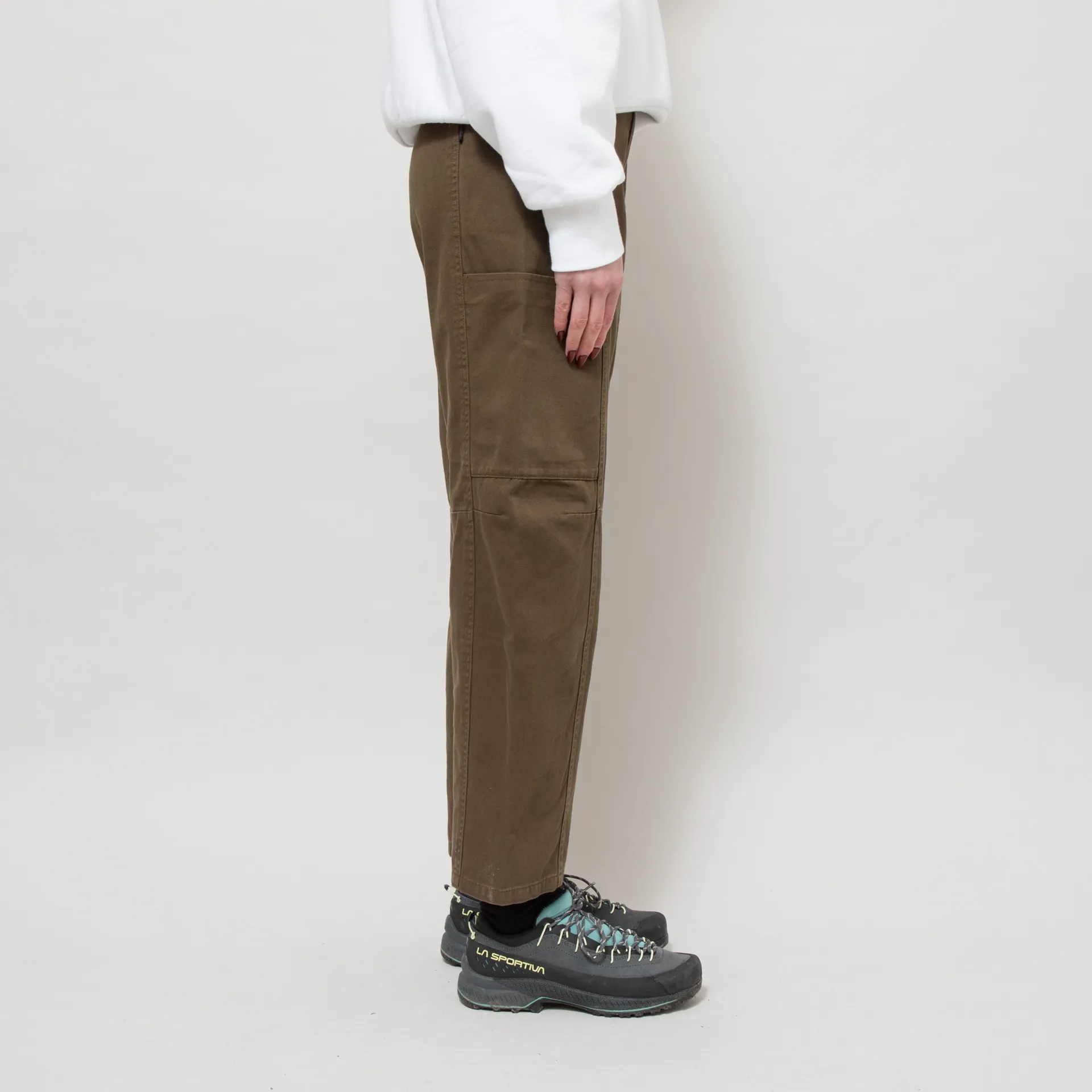 The Voyager Pants from Gramicci's womenswear collection are cut with a relaxed, slightly tapered/cropped leg and constructed from hardy cotton twill. They feature the classic Gramicci integrated belt, with a zip and button-fly, and a diamond-shaped crotch gusset for ease of movement. This style has plenty of pocket space, with large wrap-around pockets at the top and two spacious pockets at the thighs. The design is complete with a logo to the belt and a flag label at the side seam.
