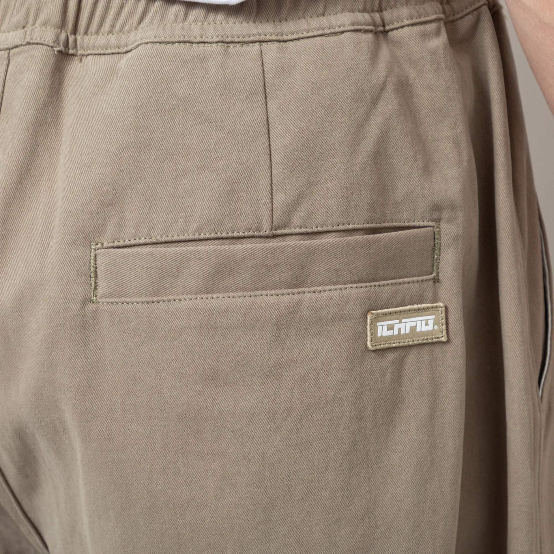 A pair of cotton twill balloon pants from ICHPIG, featuring an elasticated waistband with drawstrings to adjust the fit, two front pockets, two back welt pockets and a rubber ICHPIG logo. Finished with ties at the leg openings to taper in or widen the leg.