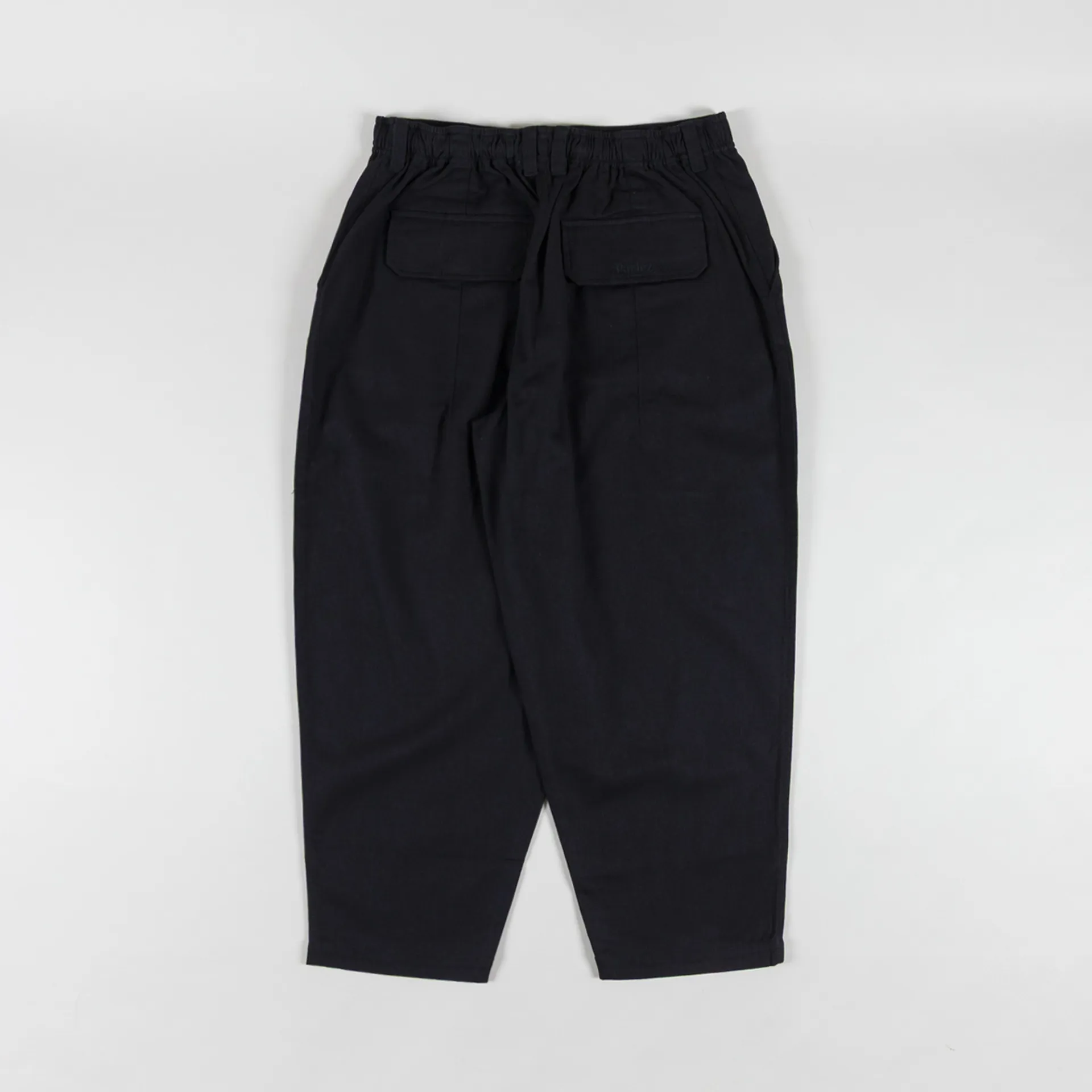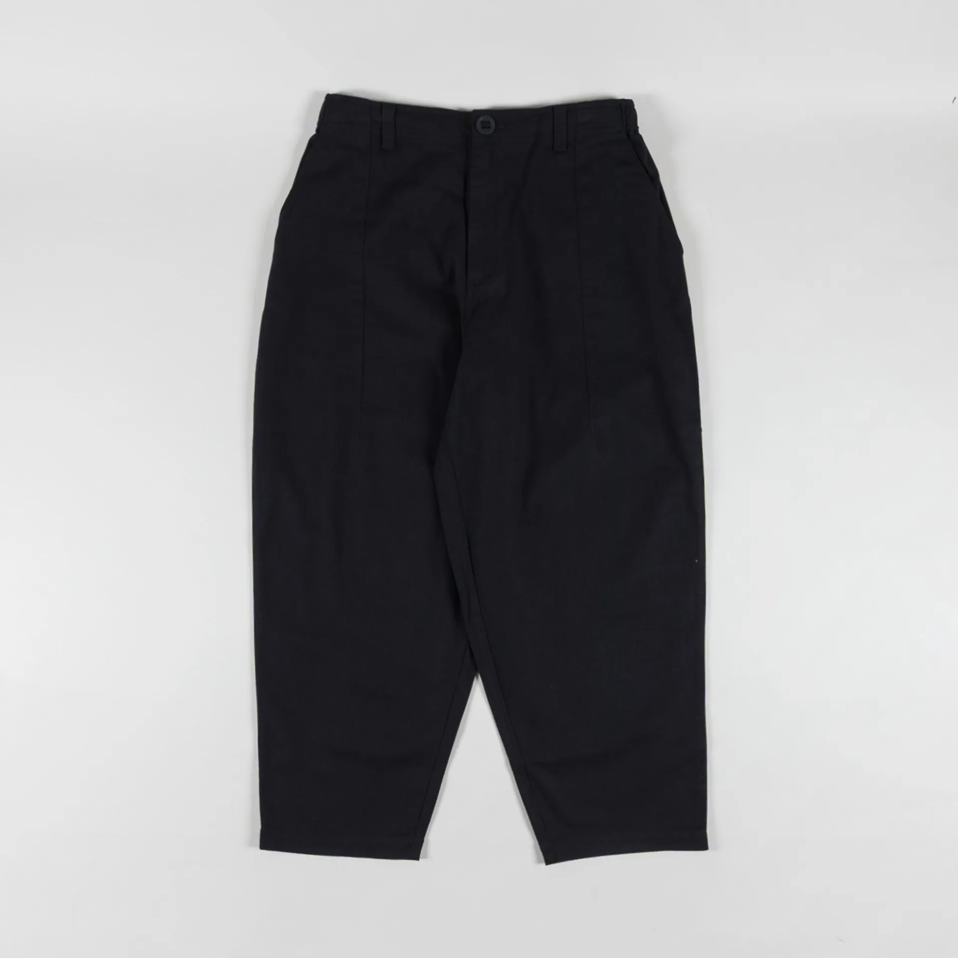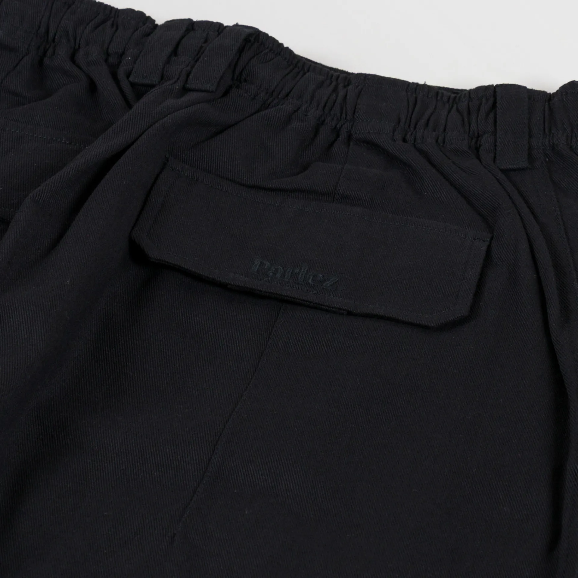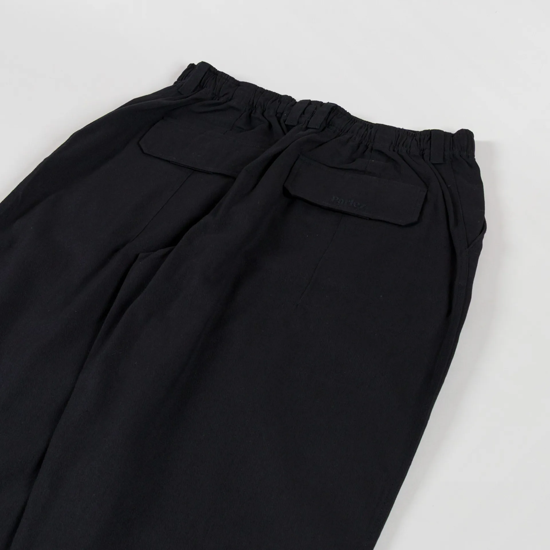 A pair of darted balloon pants from Parlez, constructed from durable cotton twill. They have a partially elasticated waistband with a zip and button fly, two classic front pockets and two back patch pockets. A standard balloon pant is categorised by a wide, voluminous leg that tapers and gathers at the ankle, giving it a rounded, balloon shape.