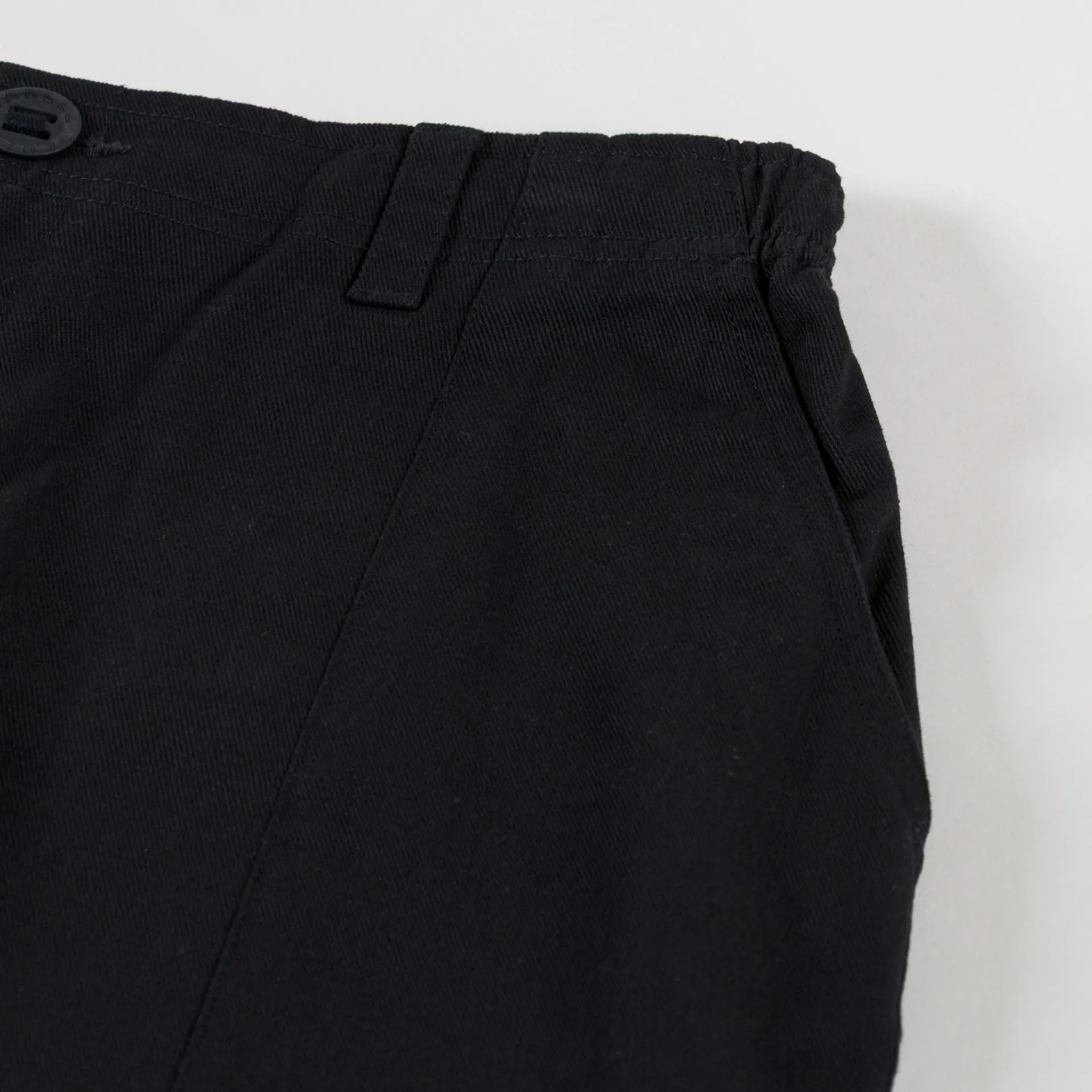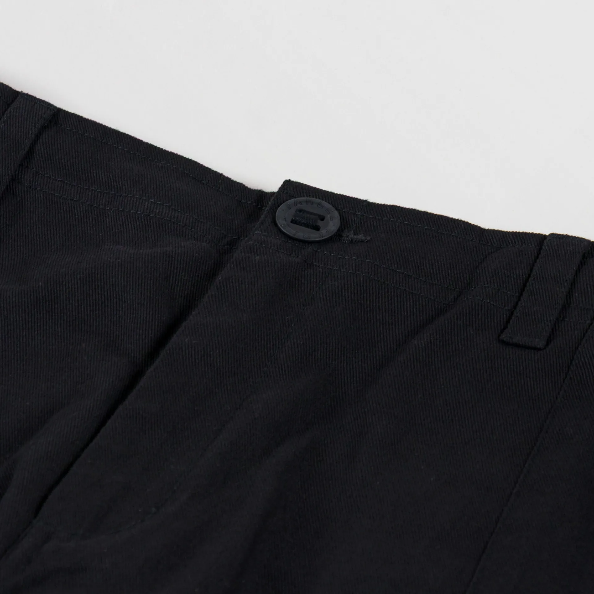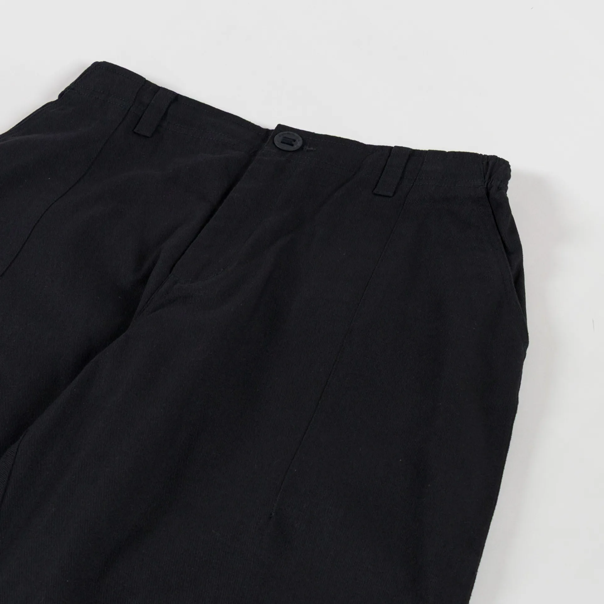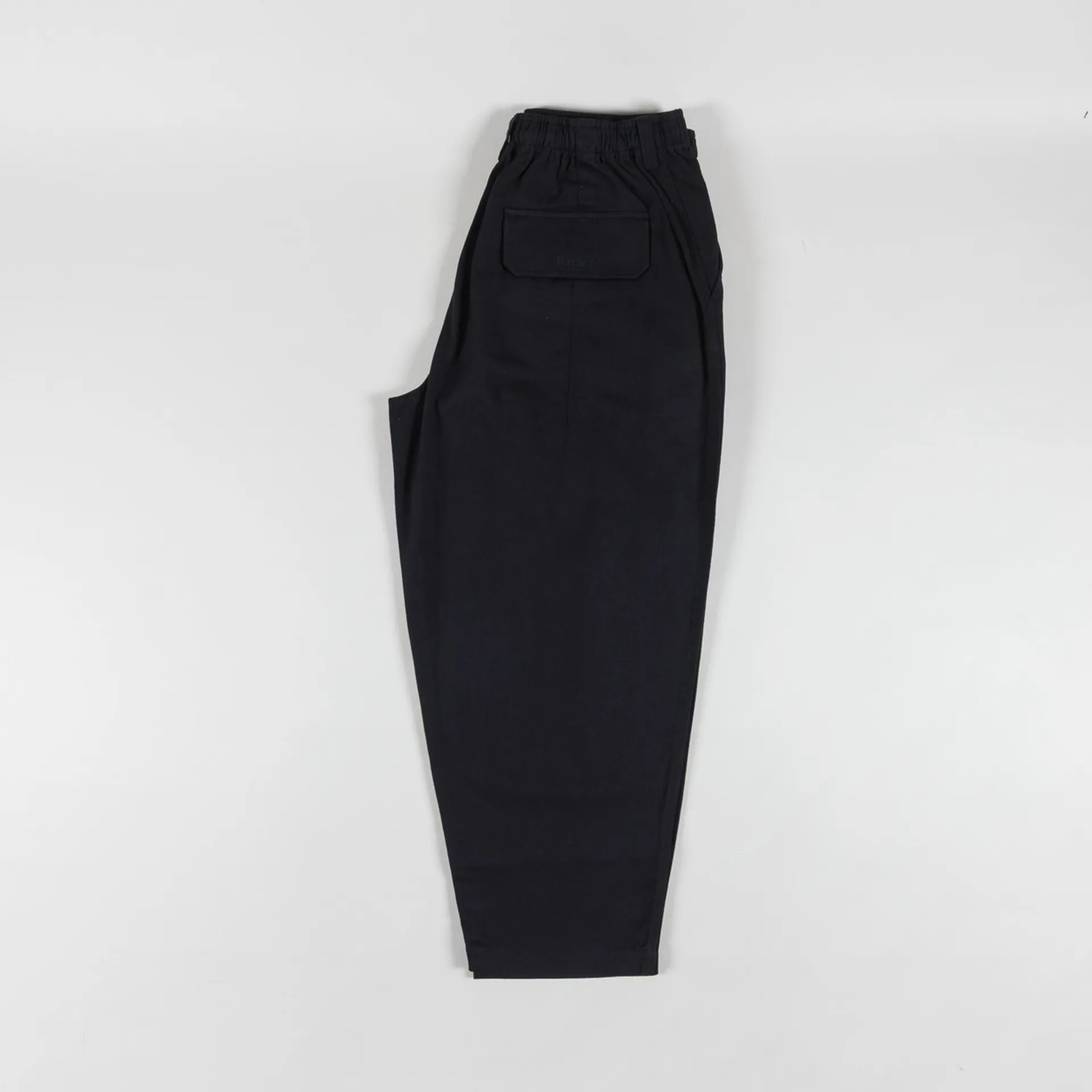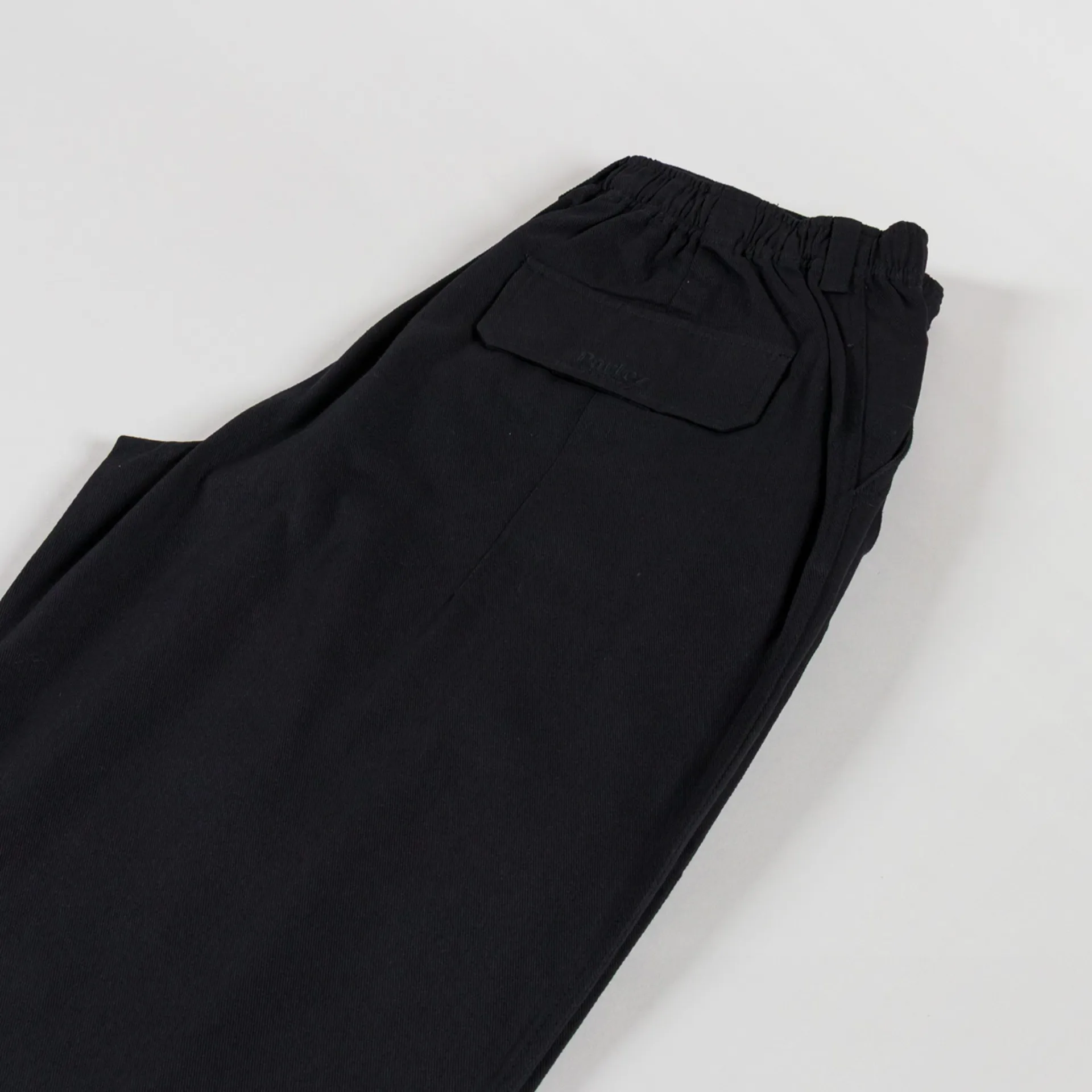 A pair of darted balloon pants from Parlez, constructed from durable cotton twill. They have a partially elasticated waistband with a zip and button fly, two classic front pockets and two back patch pockets. A standard balloon pant is categorised by a wide, voluminous leg that tapers and gathers at the ankle, giving it a rounded, balloon shape.