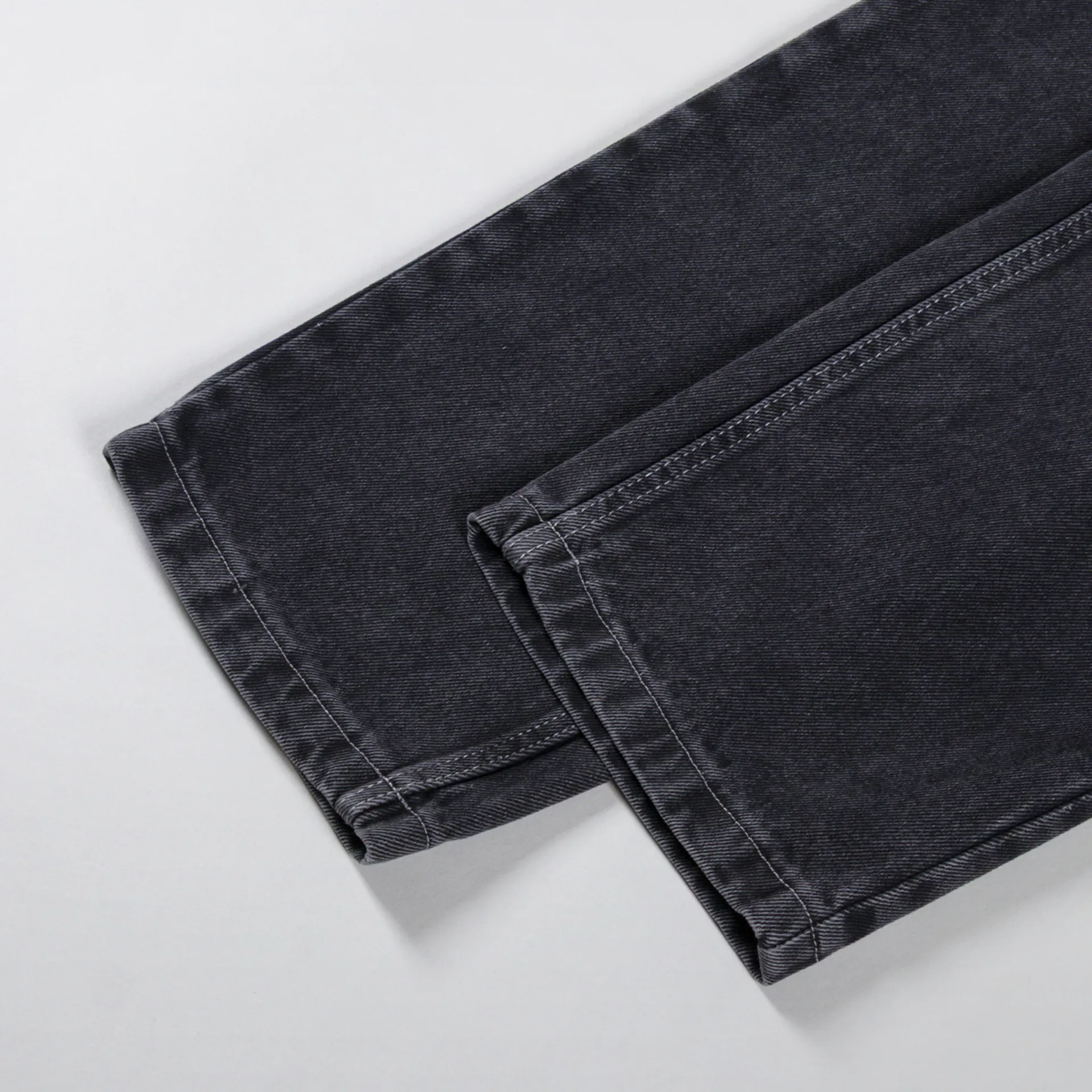 A pair of jeans from Polar, constructed from 100% cotton denim and cut in a semi baggy fit with straight legs. They have a zip and button fly, leading to a classic belt loop waist, with three pockets at the front, two to the back and finished with a woven label at the waistband.