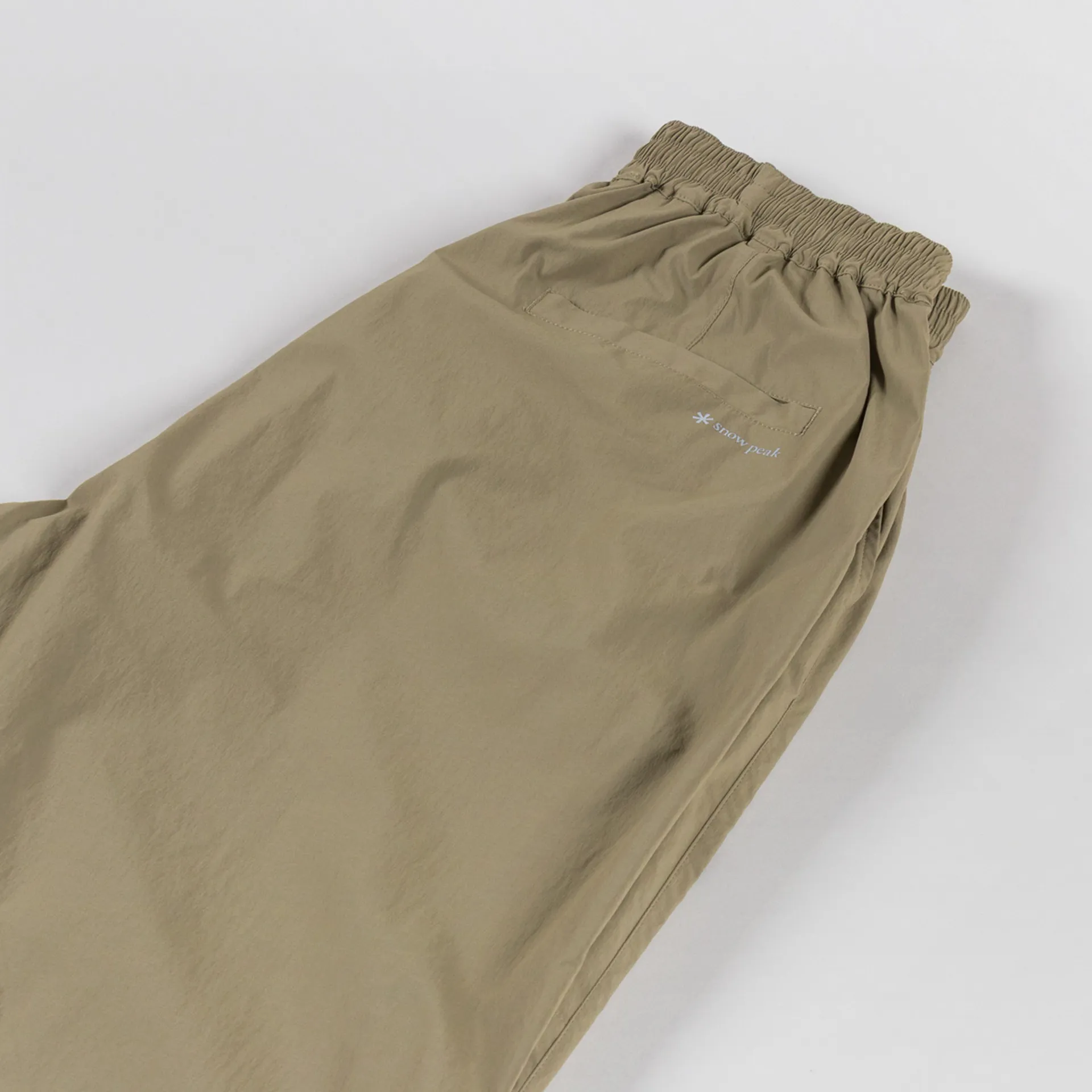 A pair of lightweight nylon trousers from Snow Peak, constructed with a durable water resistant finish for protection against light rainfall. They have an elasticated waistband with internal drawstrings for adjustability and a wide-cut leg for freedom of movement. There's two hand pockets at the front, two back welt pockets and a reflective Snow Peak logo at the back.
