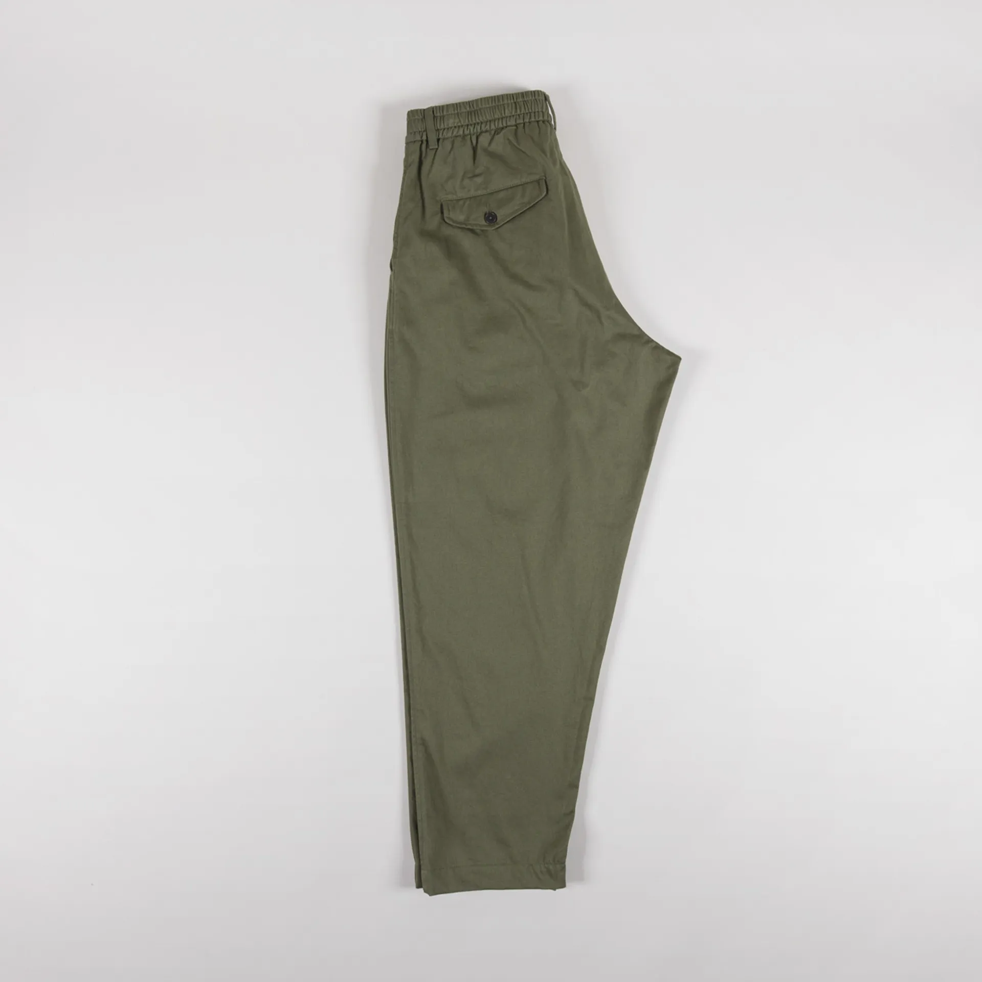 The Pleated Track Pant from Universal Works has been cut in a loose fit through the legs and hips, tapered through to the hem and a mid-rise waist. Crafted from soft, 100% cotton twill. It features a buttoned fly, leading up to an elasticated waistband with belt loops, two front pockets and two rear pockets, one with a button flap.