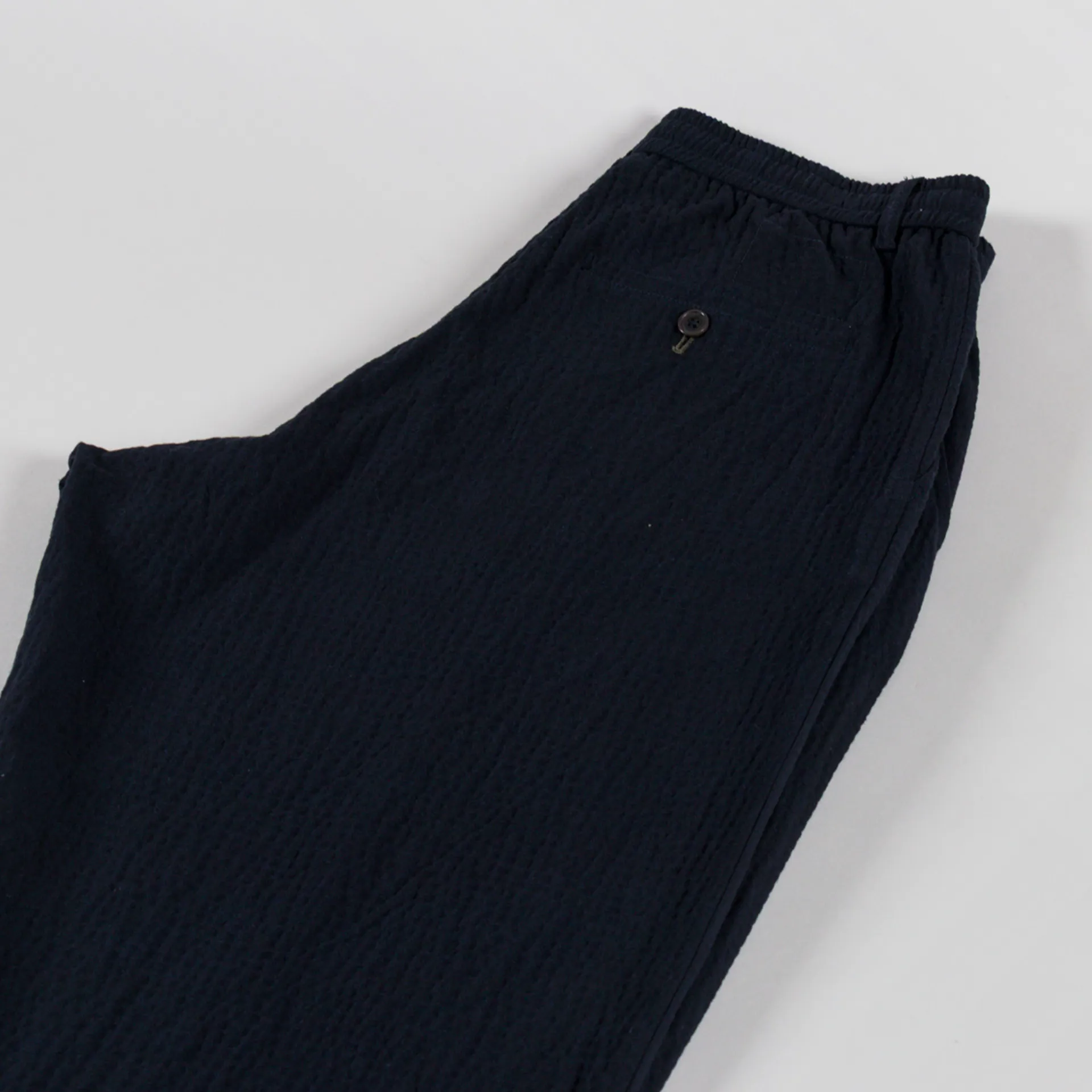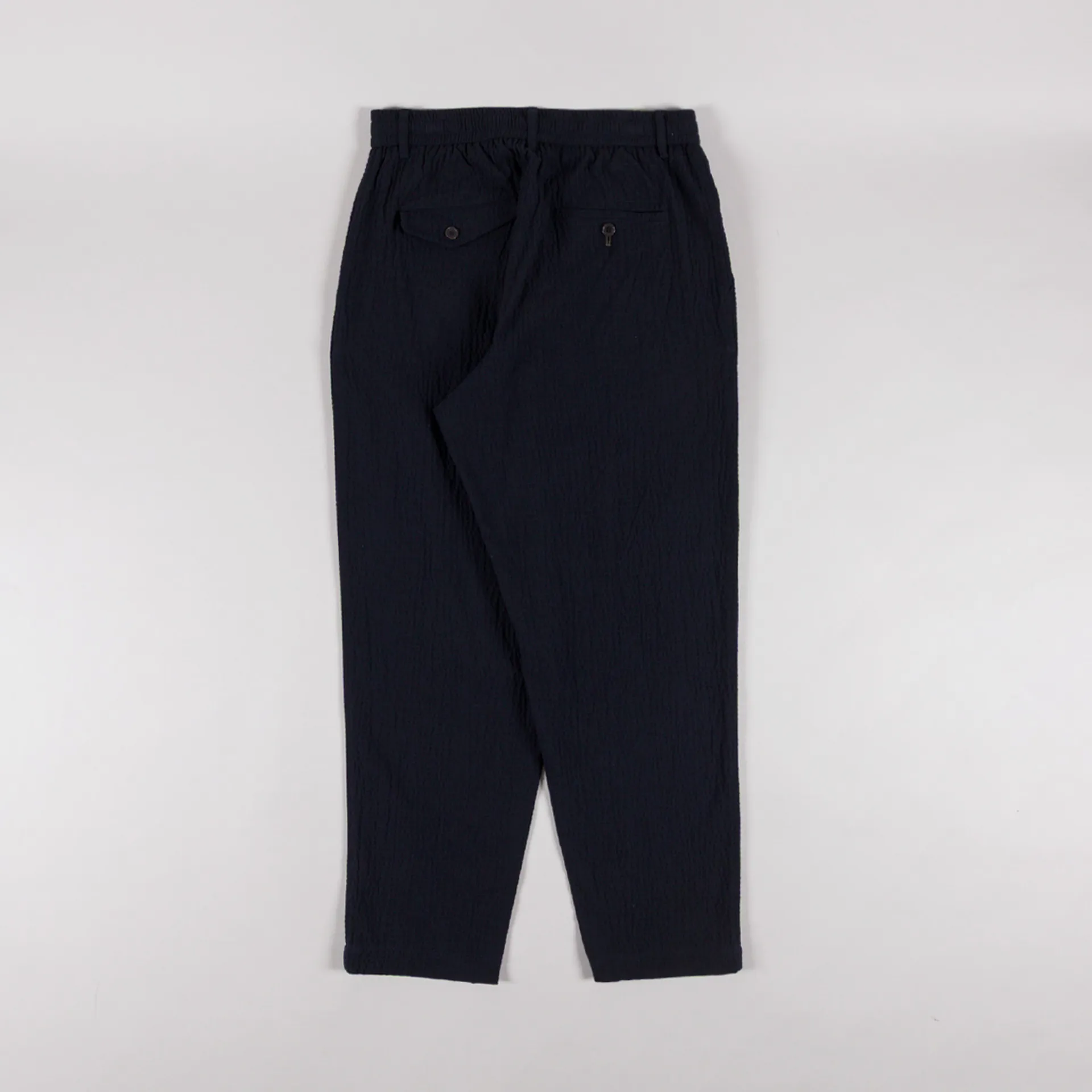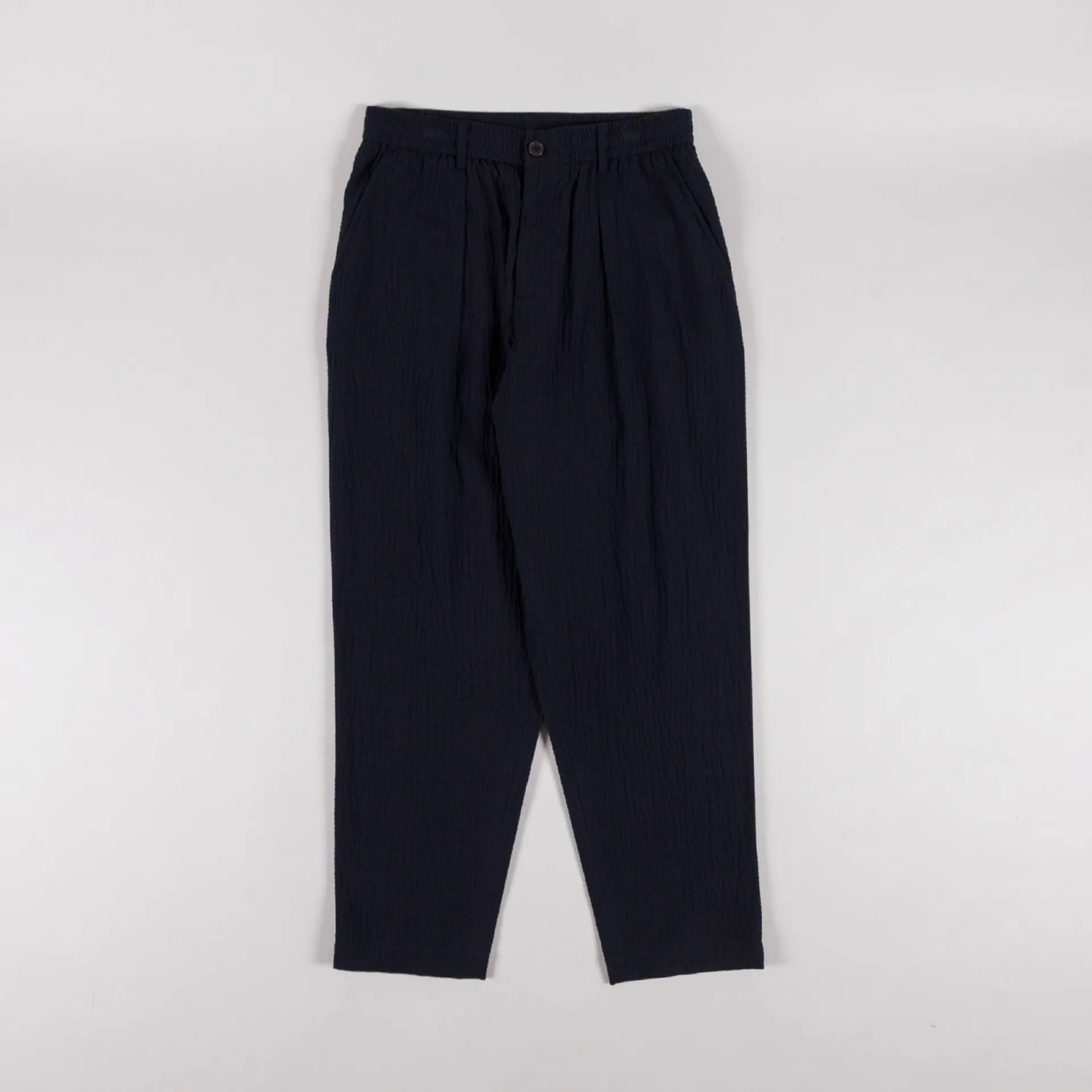 A pair of loose, tapered trousers from Universal Works, constructed from Ospina Cotton, a loosely woven seersucker in a blend of upcycled fibres