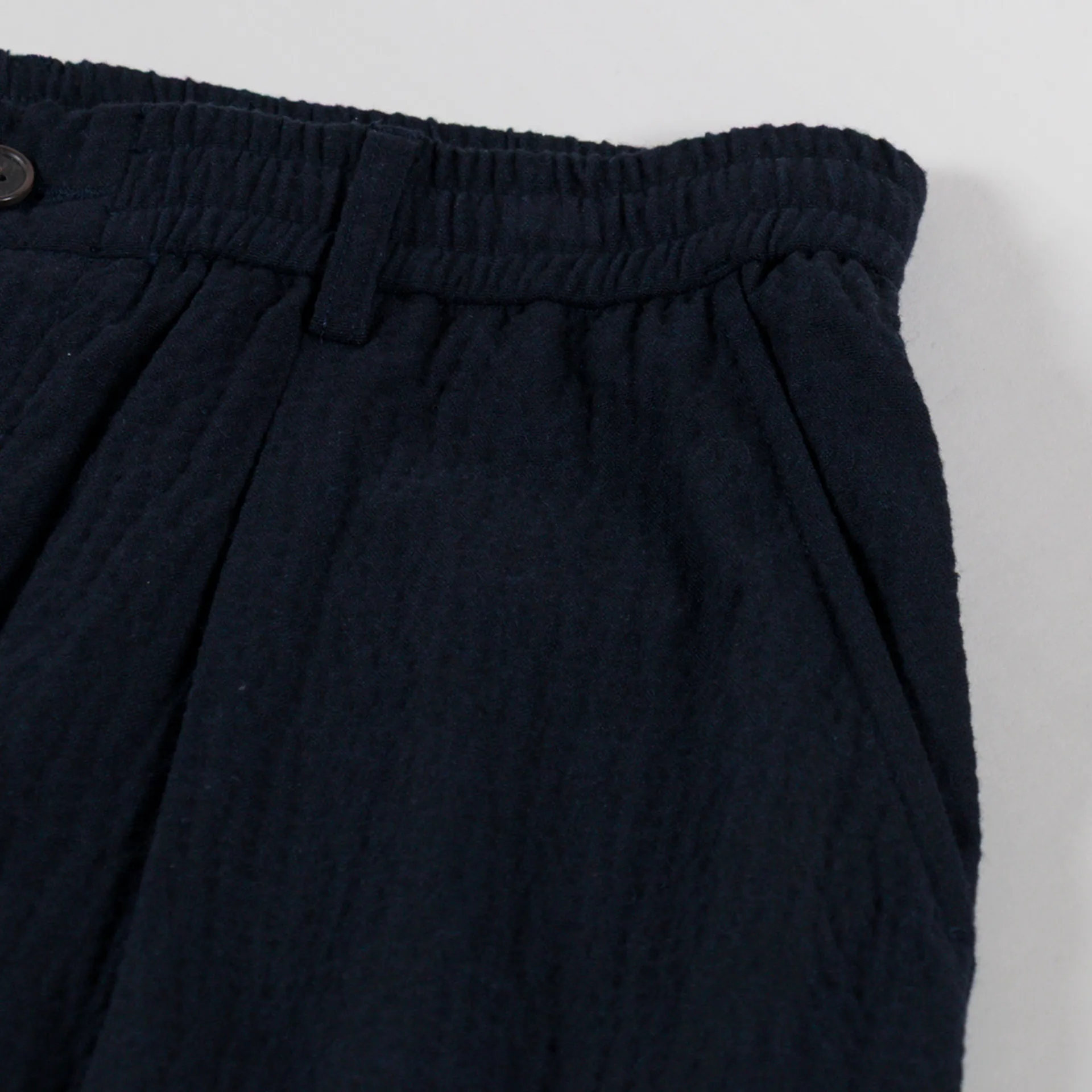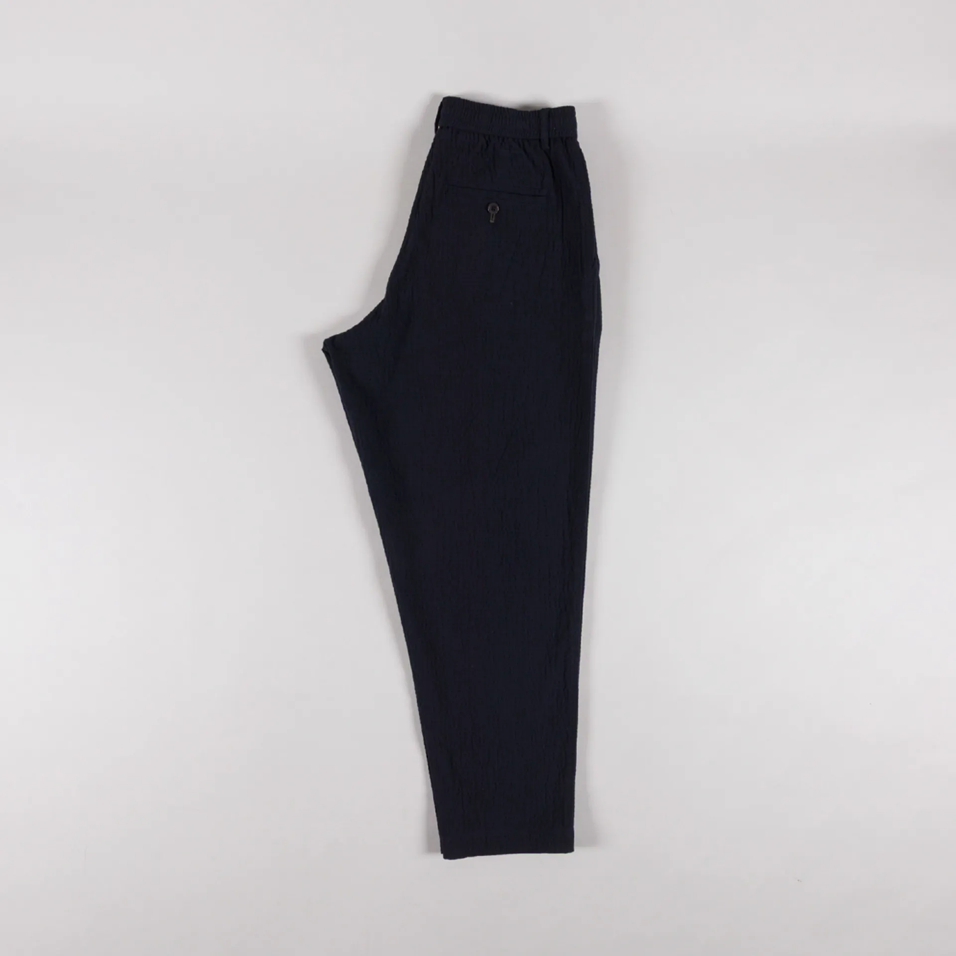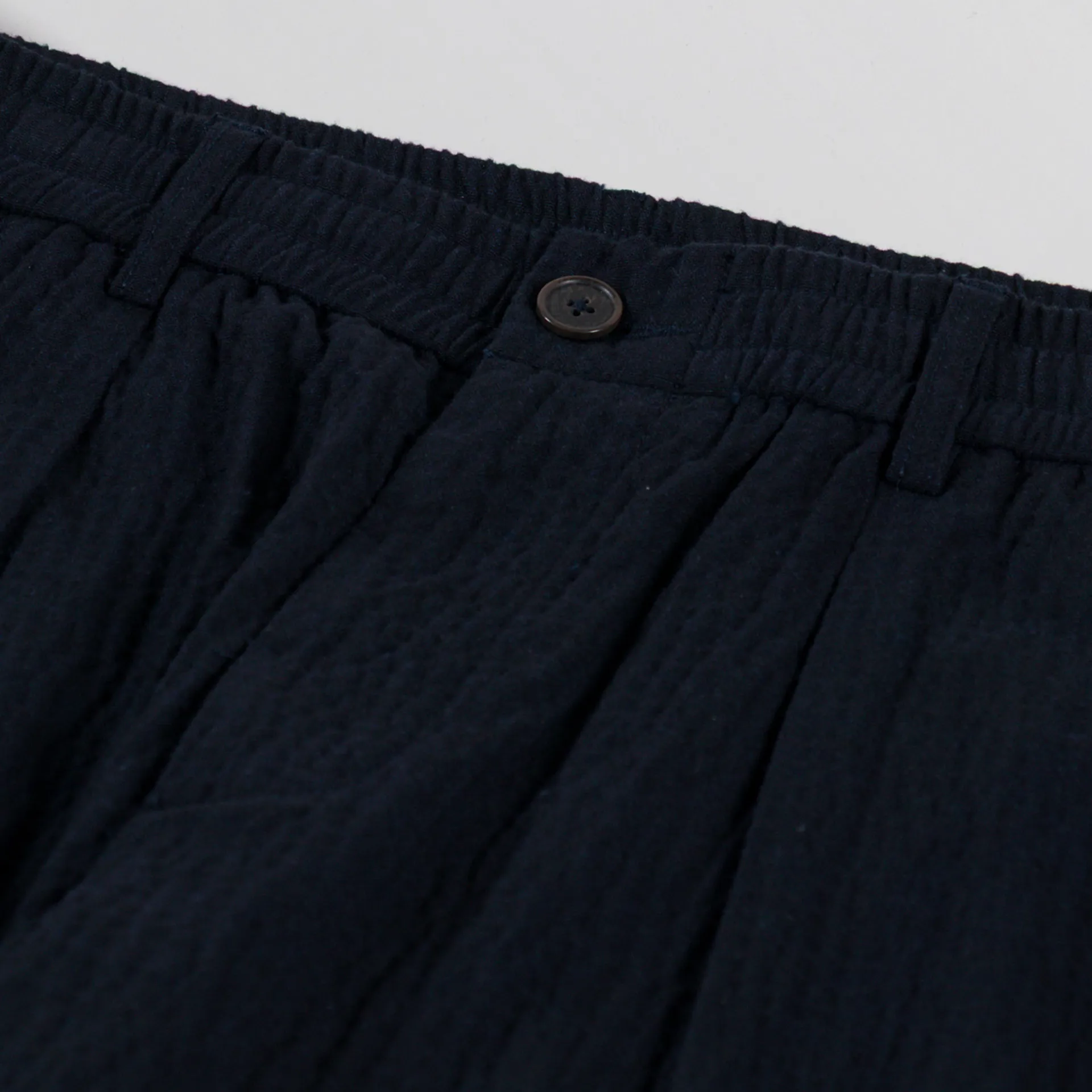 A pair of loose, tapered trousers from Universal Works, constructed from Ospina Cotton, a loosely woven seersucker in a blend of upcycled fibres