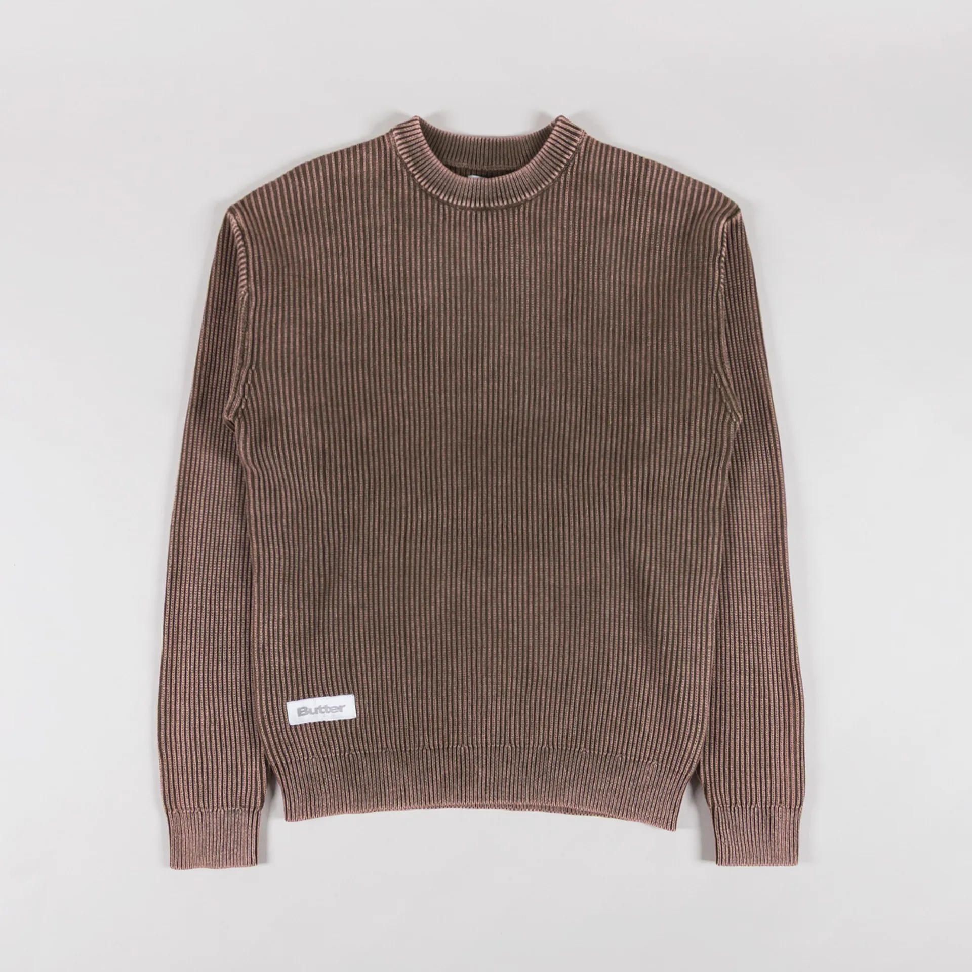 A knitted sweater from Butter Goods, constructed from soft cotton and cut in a regular fit for everyday comfort. It features a ribbed crewneck, hem and cuffs, with a woven logo patch and a bleach wash throughout.