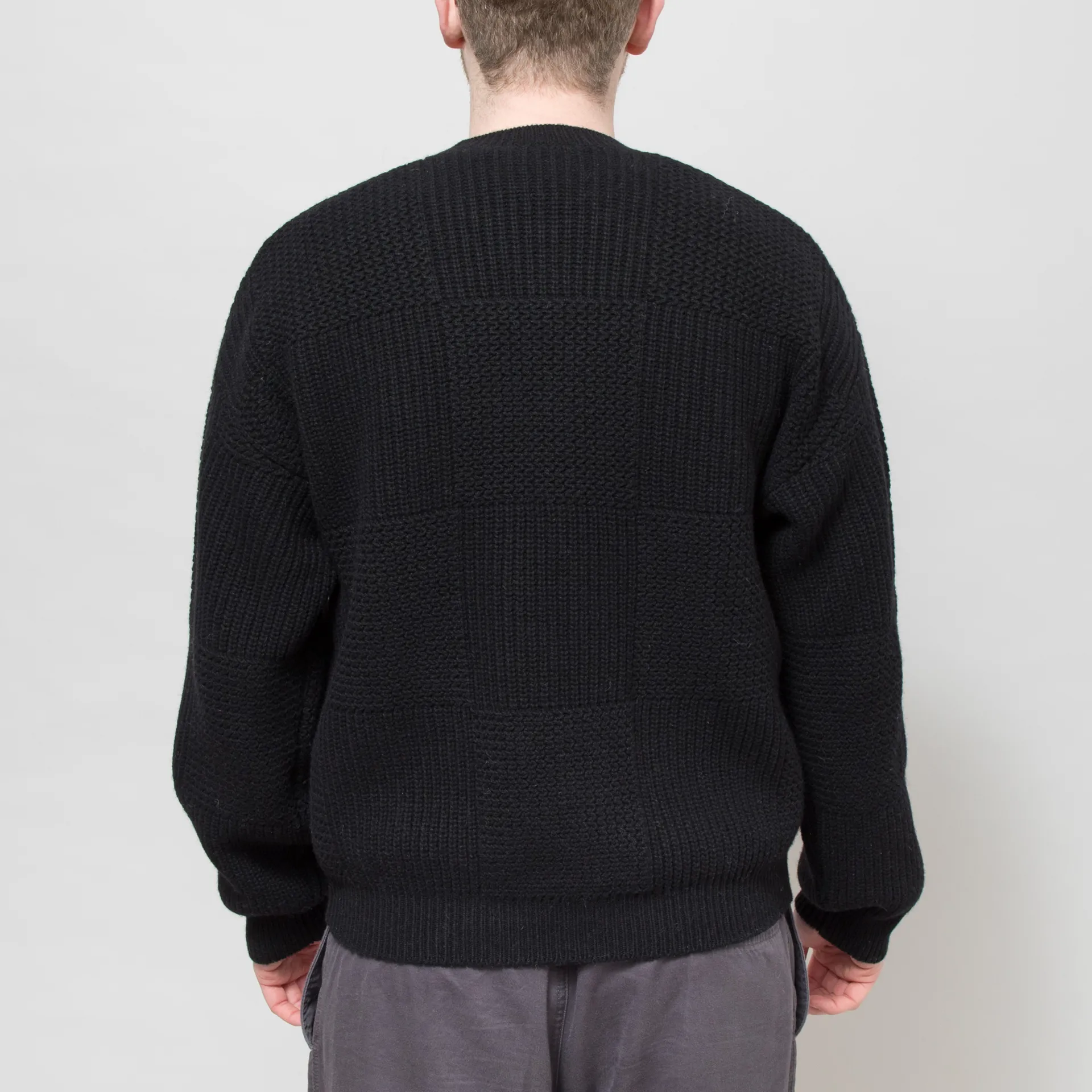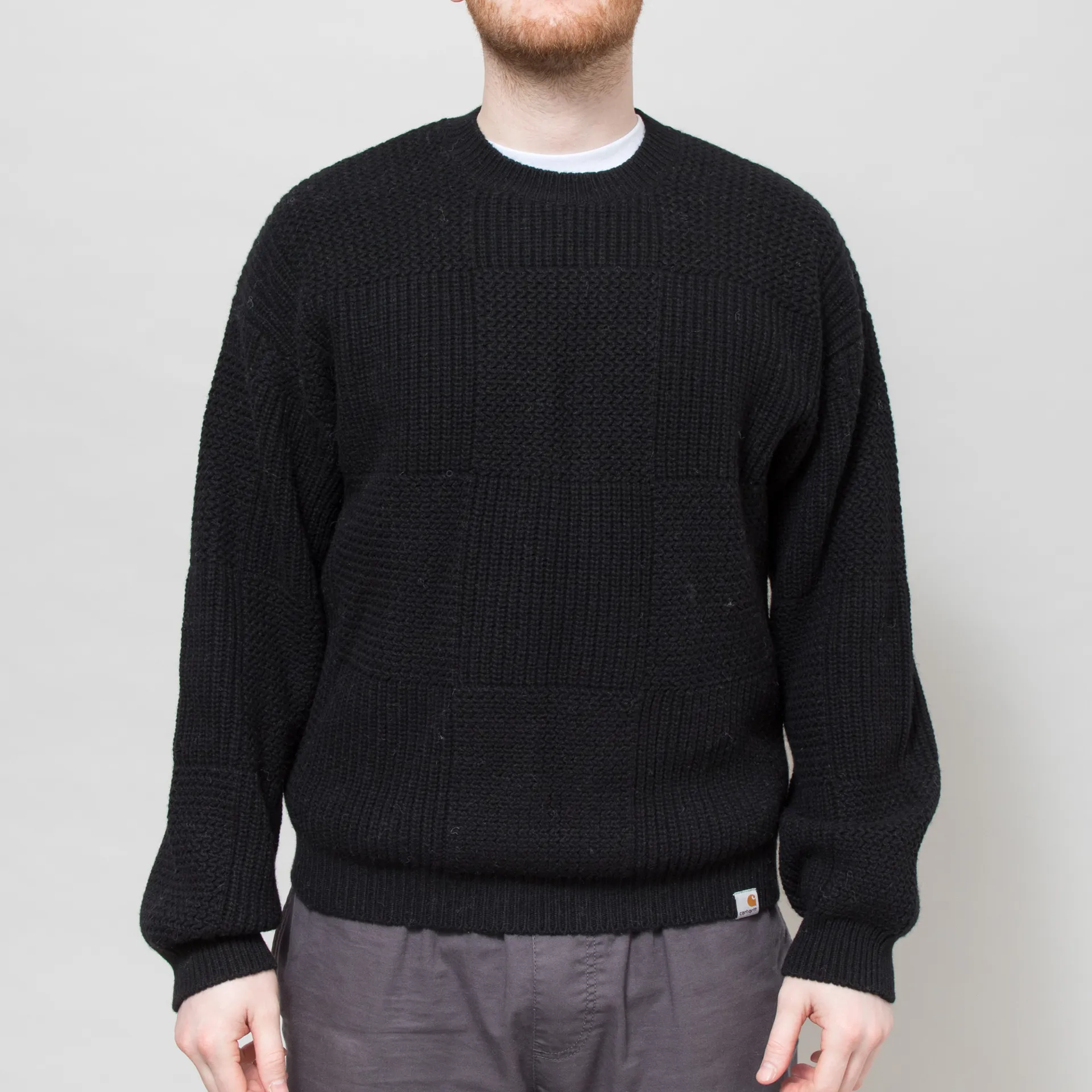 A knitted sweater from Carhartt WIP, constructed from a heavyweight wool-rich blend with an all-over tonal checkerboard pattern. It's cut in a loose fit for a laidback silhouette and features a ribbed crewneck, hem and cuffs. Finished off with a small woven flag label at the bottom.