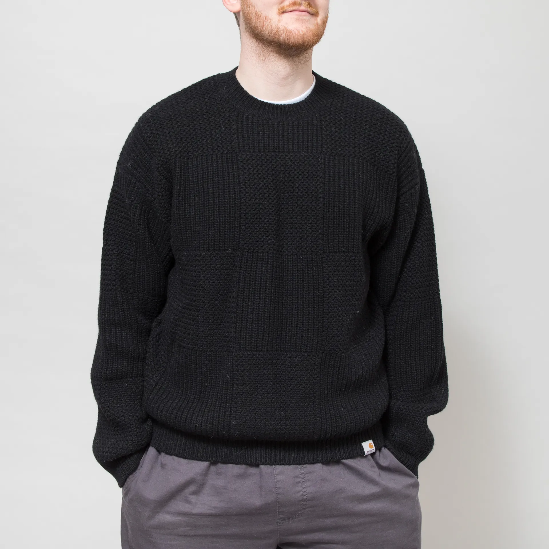 A knitted sweater from Carhartt WIP, constructed from a heavyweight wool-rich blend with an all-over tonal checkerboard pattern.
