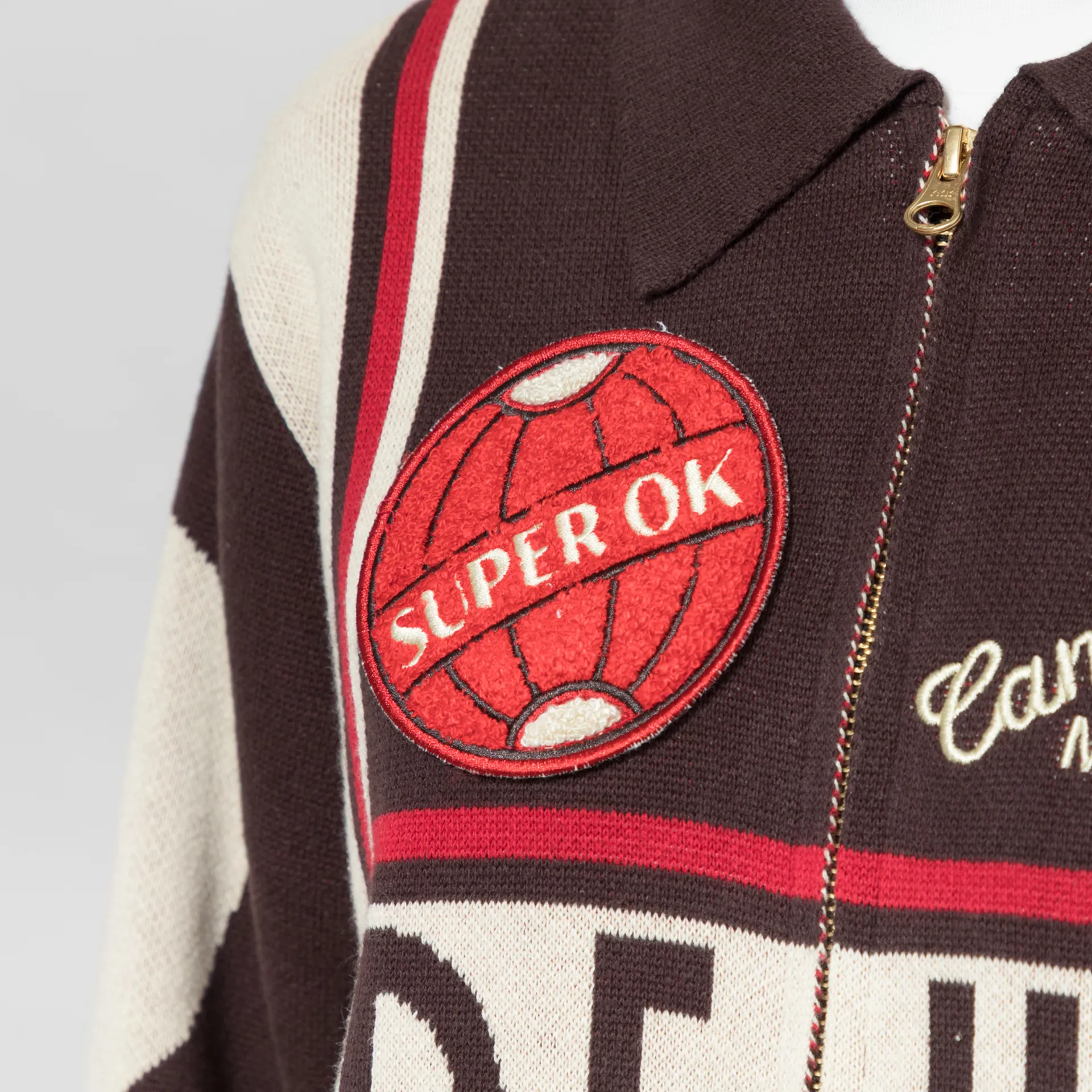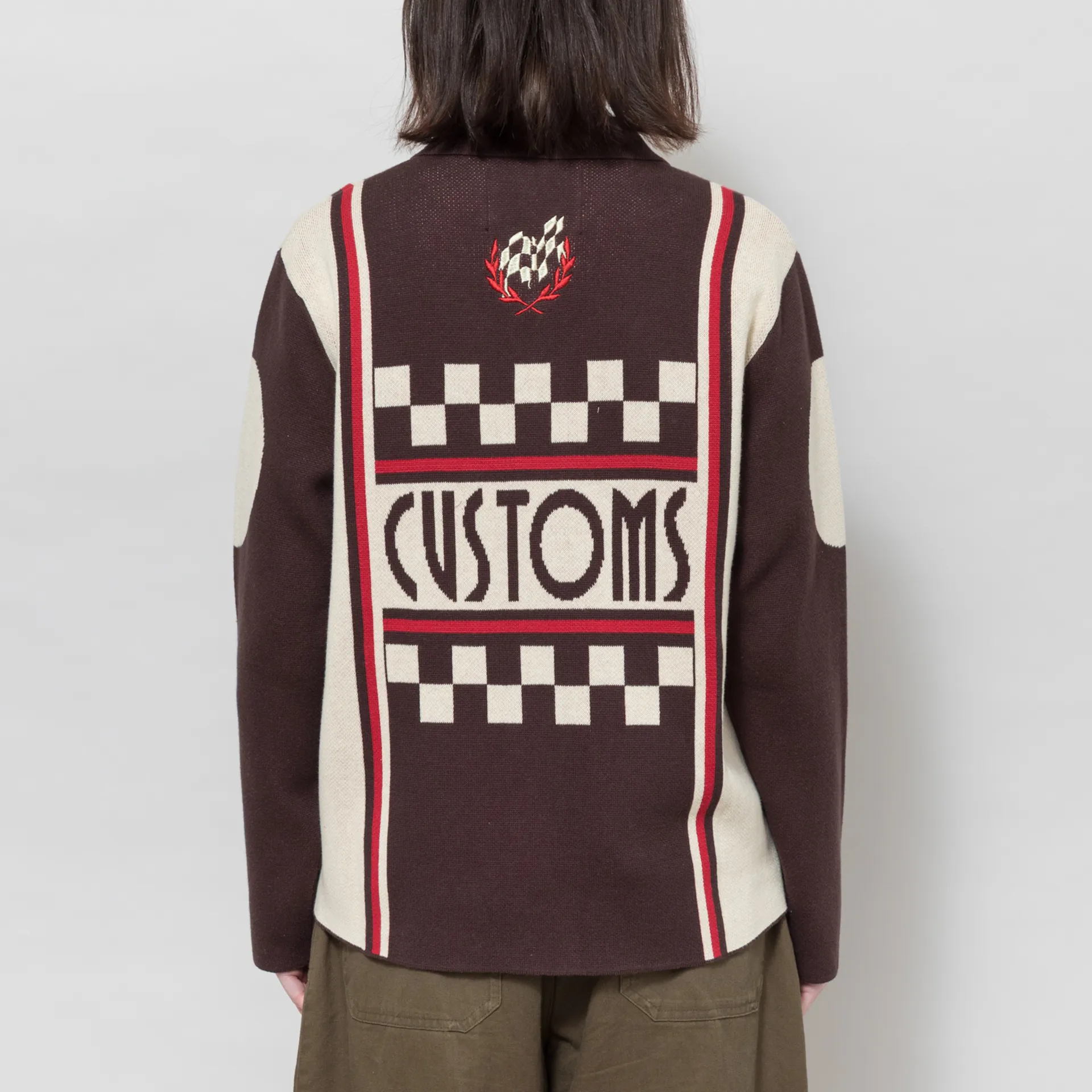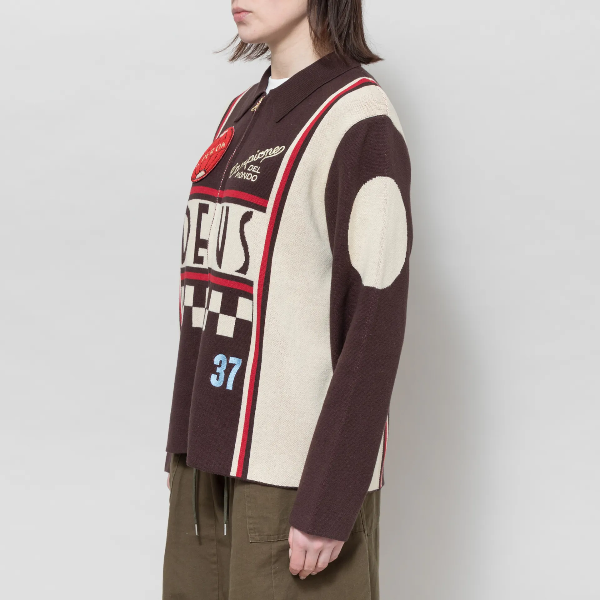 A knitted cardigan from Deus Ex Machina, cut in a relaxed fit for easy layering and crafted from organic cotton birdseye knit. It features a full zip-through front, leading to a classic collar, with a straight hem and cool jacquard design and embroidered patches throughout.