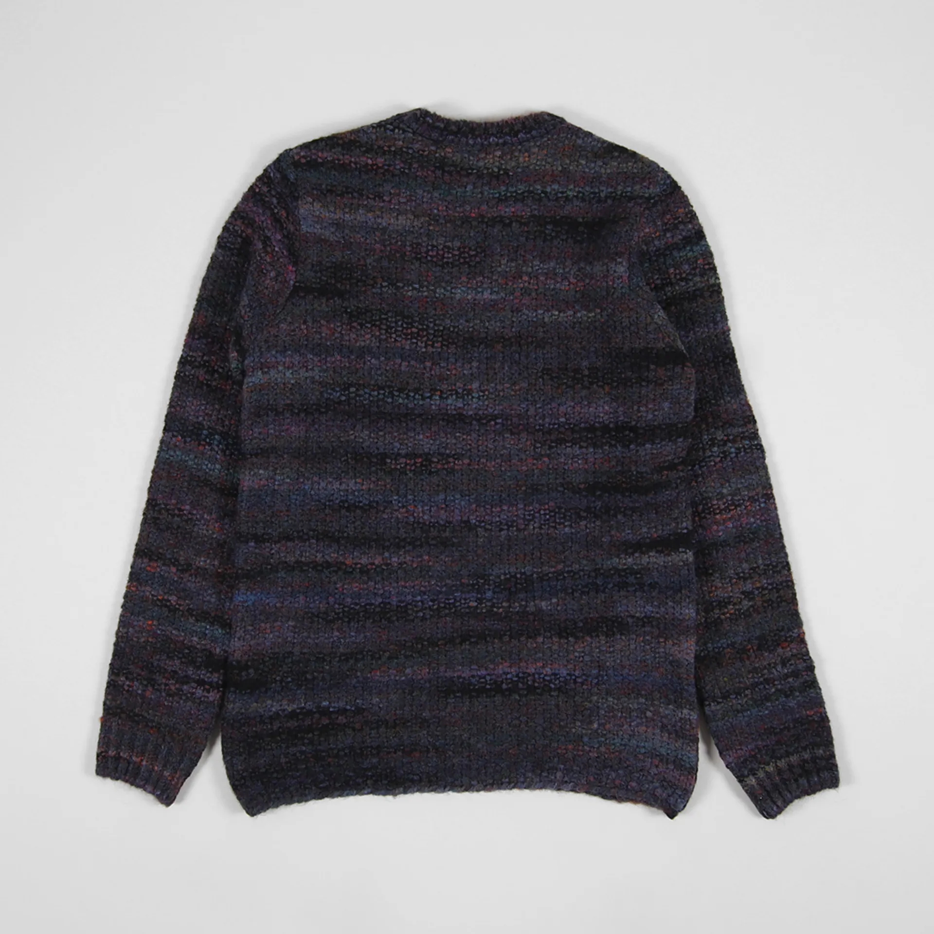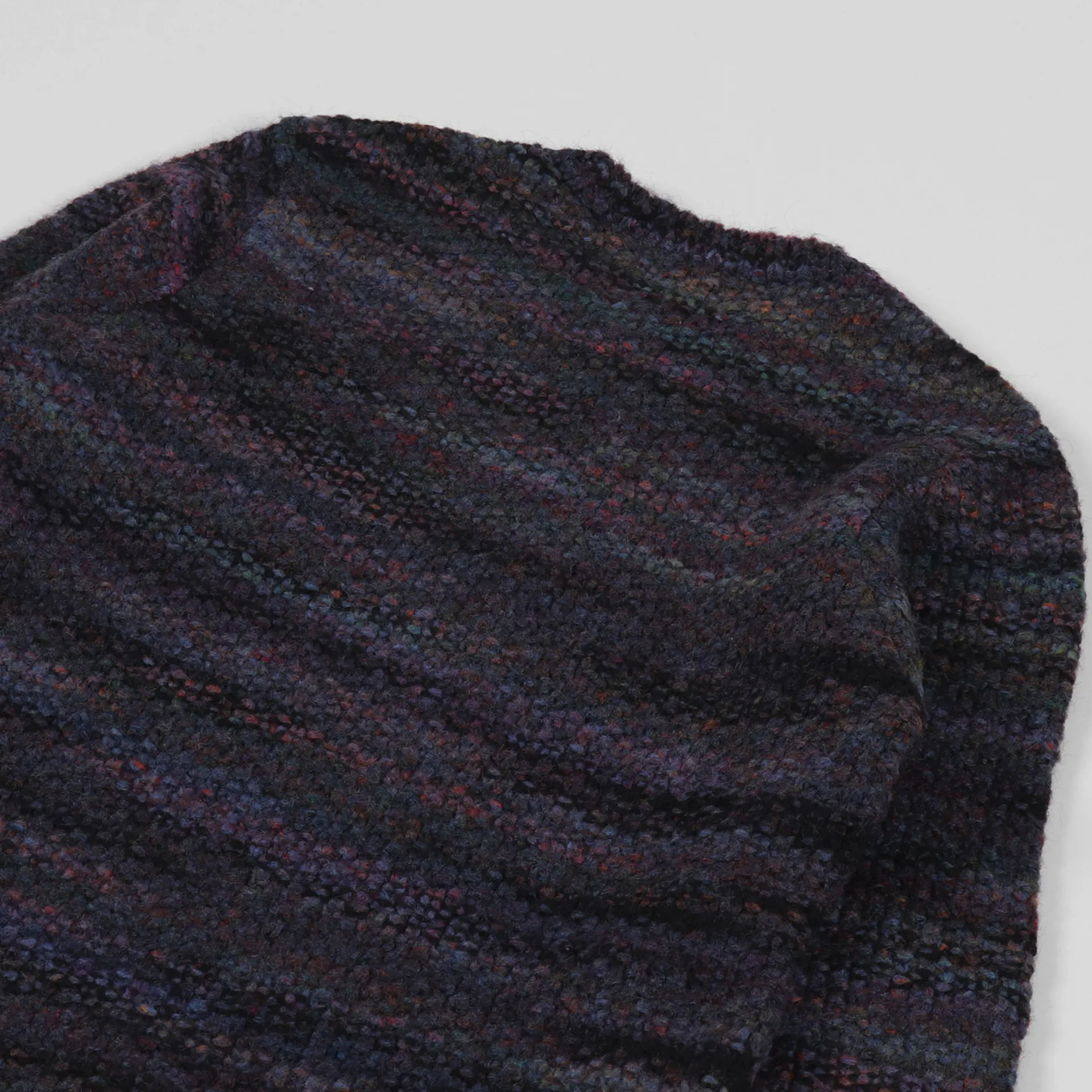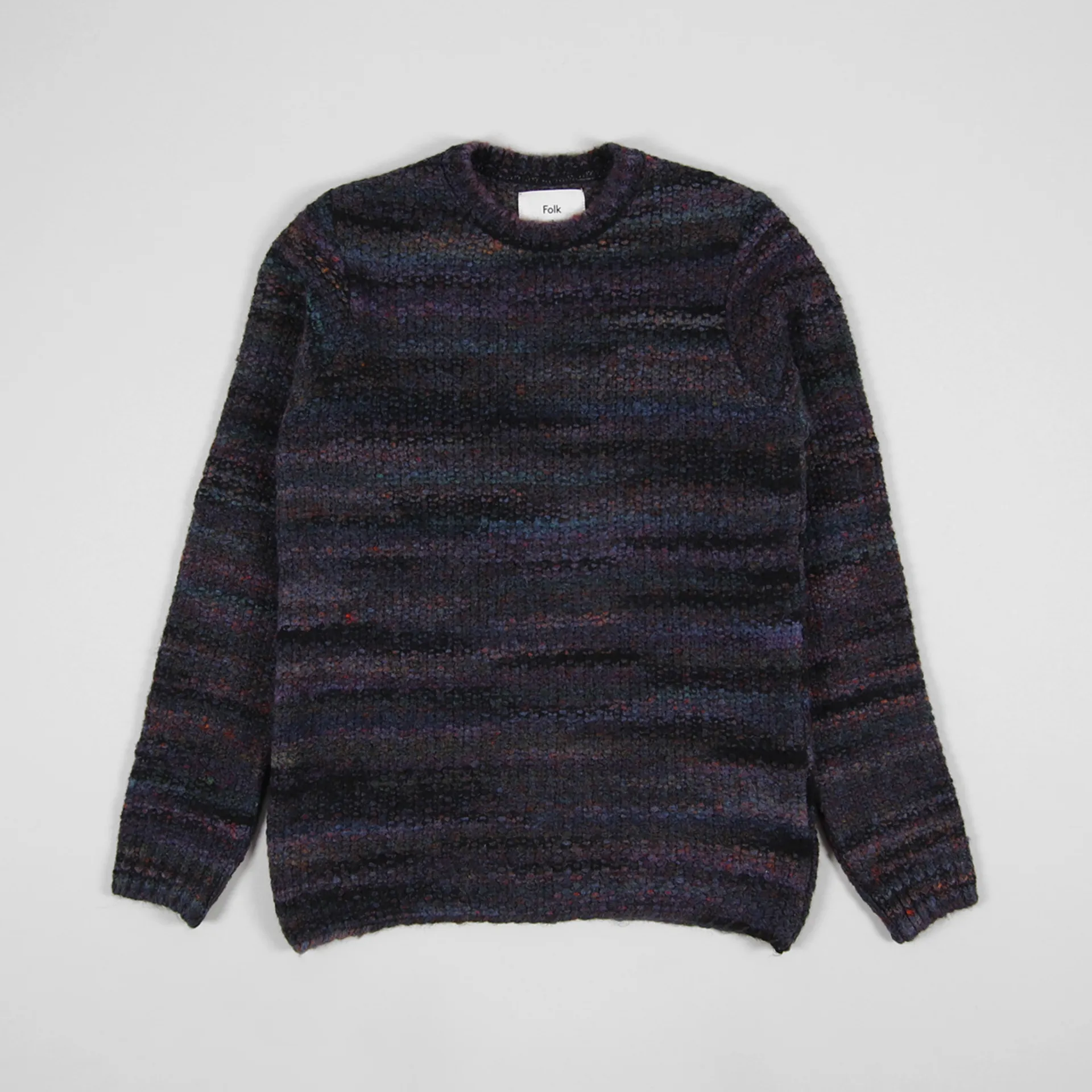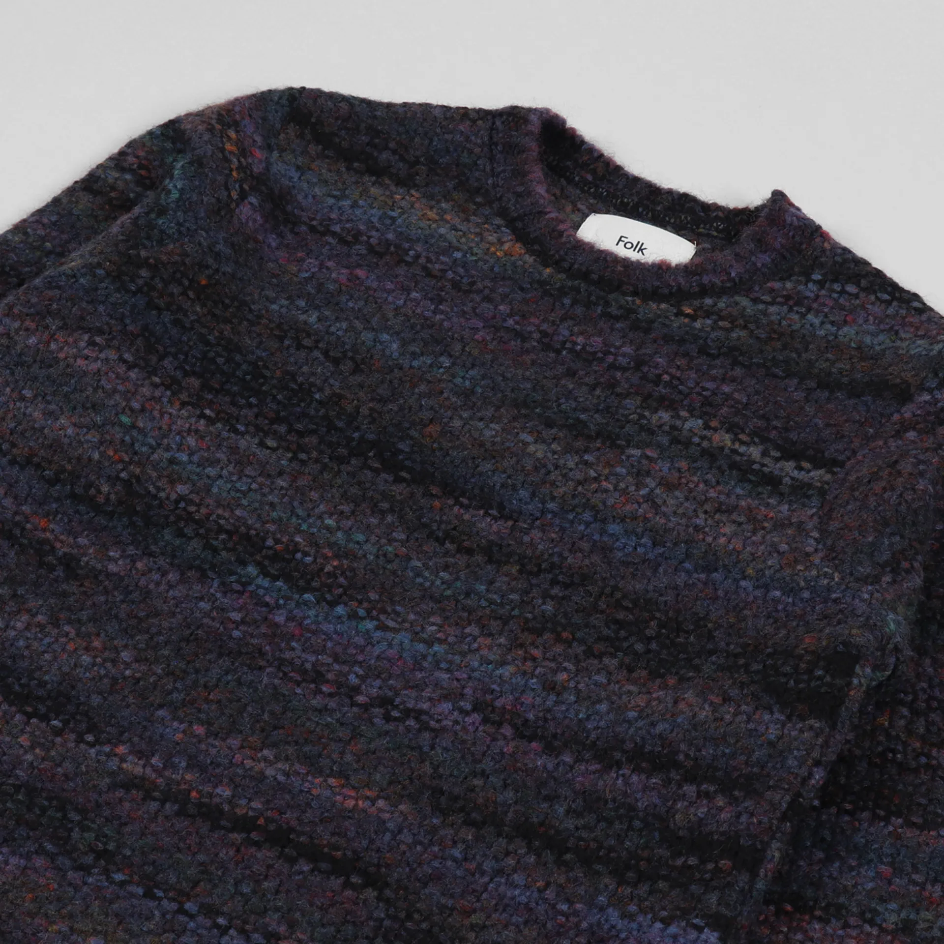 A soft and fluffy knit from Folk Clothing, made from a stretchy 3 gauge moss stitch weave of 21% wool, 65% acrylic and 14% polyamide. It has a textured design with three different yarns, and was made in Portugal.