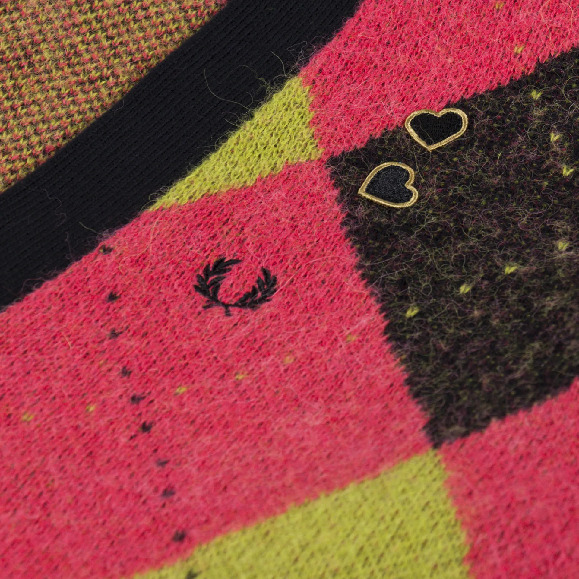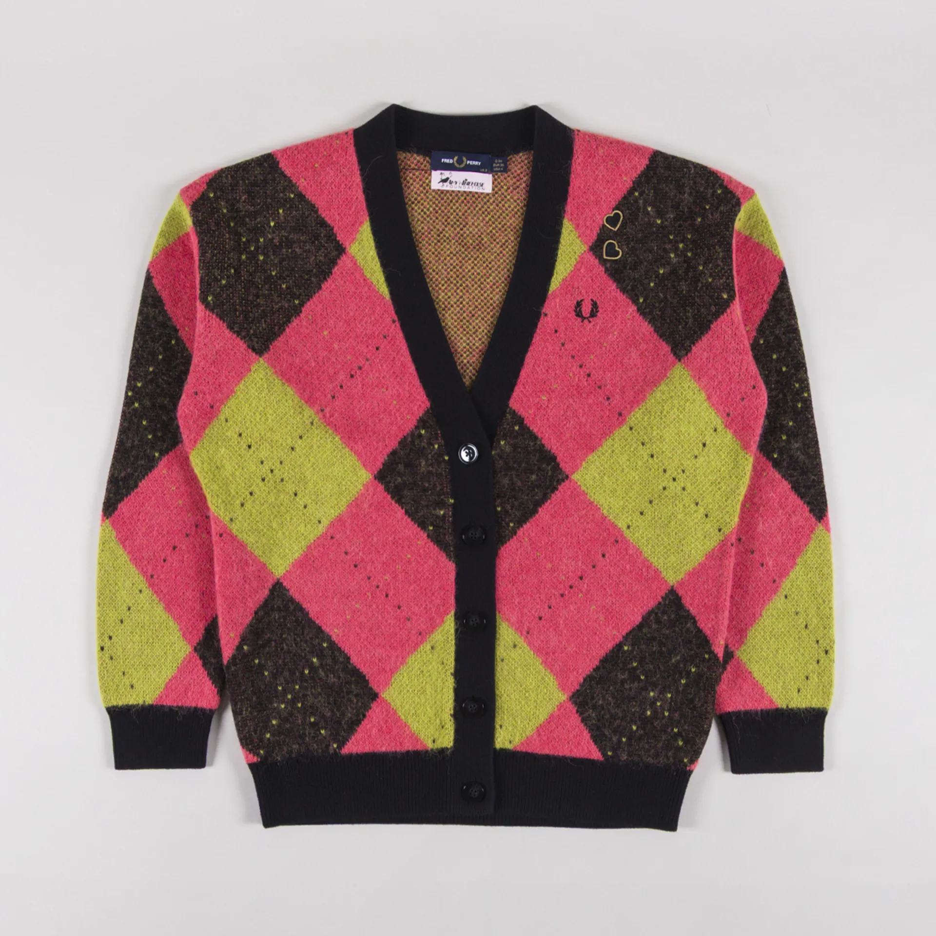 A knitted cardigan from Fred Perry's womenswear collection, crafted from a super soft wool blend with an all-over colour blocked geometric print and black trims. It's cut in a regular fit for everyday comfort and features a button-through front leading to a classic V-neckline, with a ribbed hem and cuffs. Finished with the iconic Laurel Wreath logo and Amy's signature love hearts to the chest.