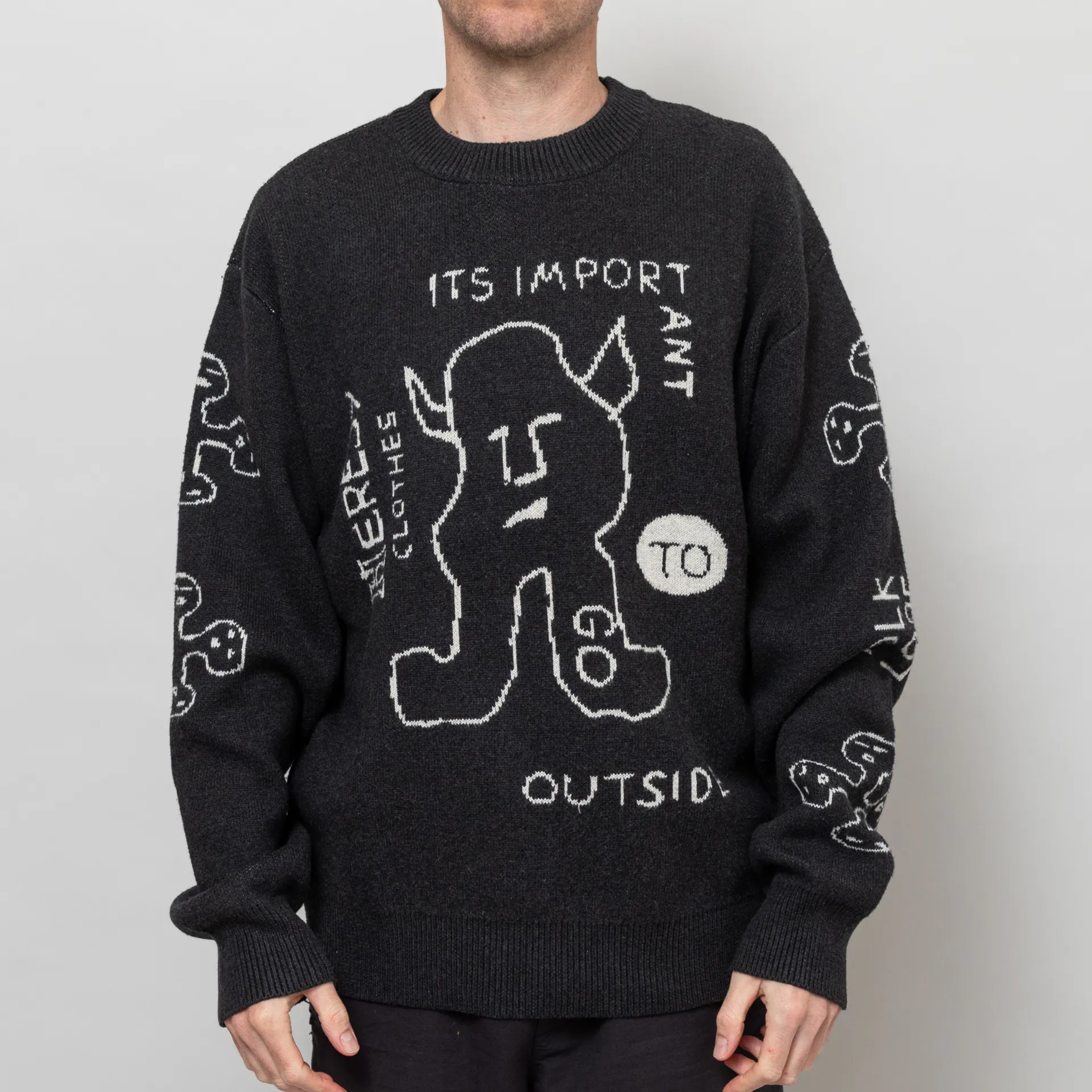 A knitted jumper from Heresy, cut in a relaxed fit for a casual silhouette and constructed from 100% cotton brushed yarn with all-over 'outdoors' graphics. Finished with a ribbed crewneck, hem and cuffs.