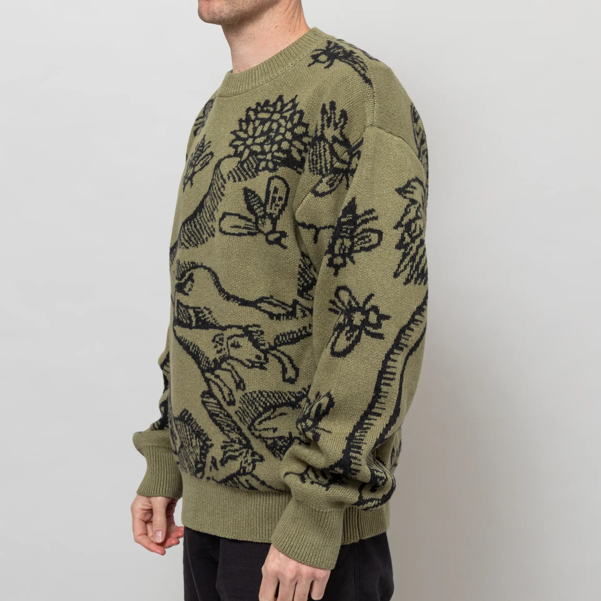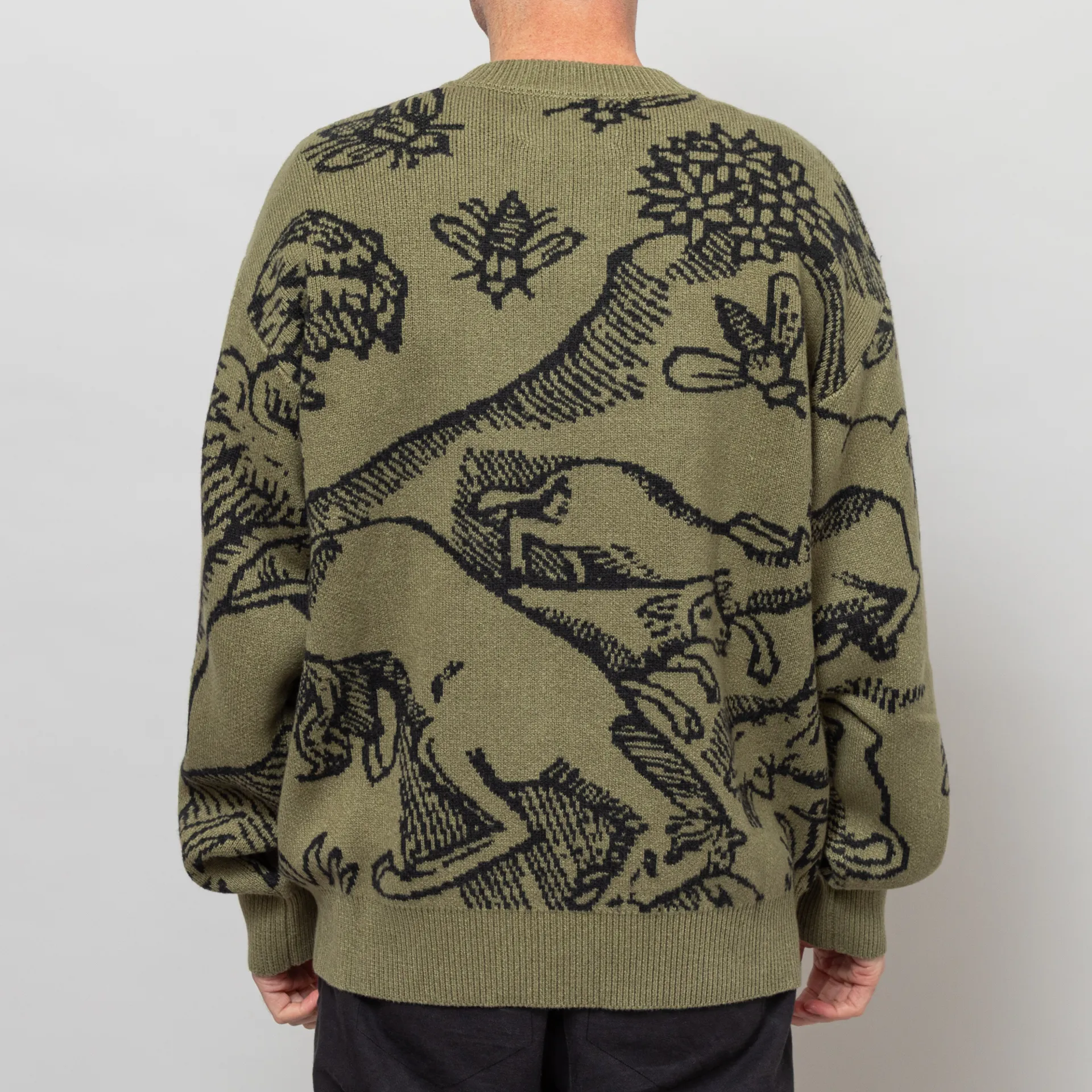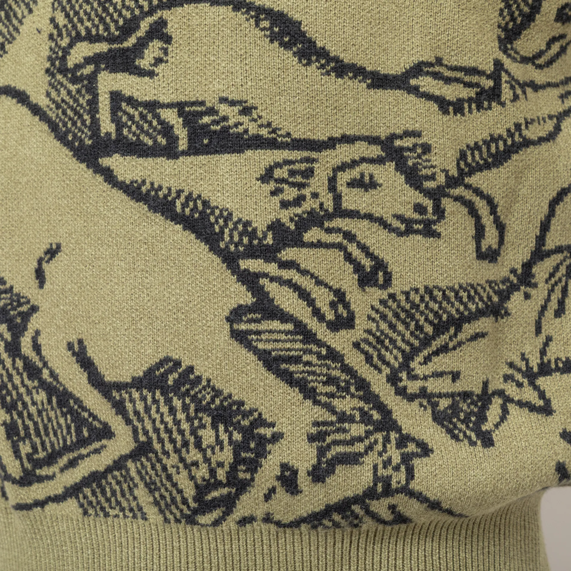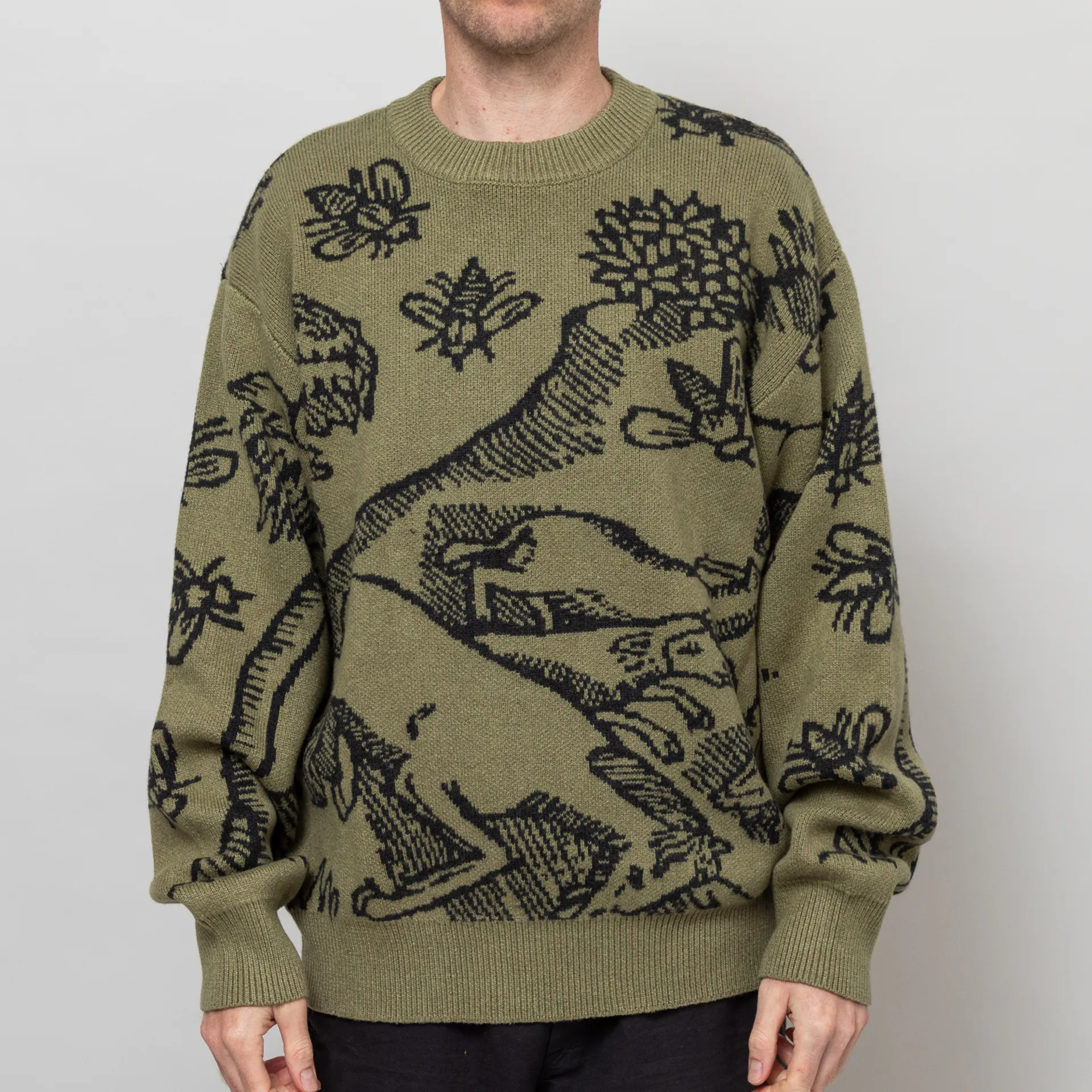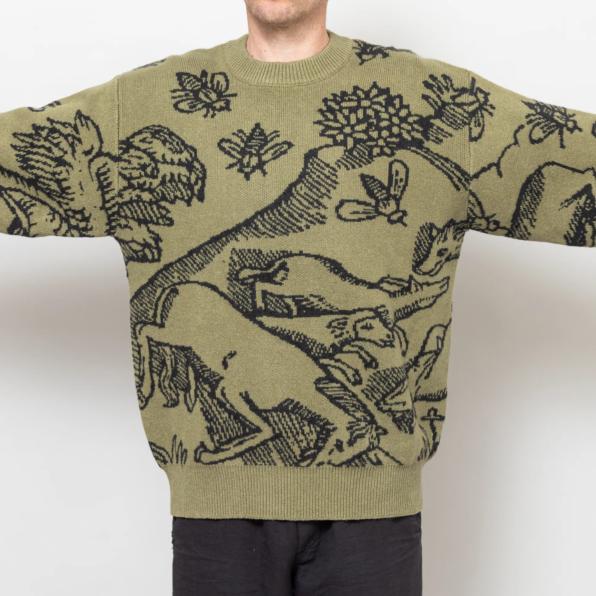 A knitted jumper from Heresy, cut in a relaxed fit for a casual silhouette and constructed from 100% cotton brushed yarn with all-over 'plague' graphics. Finished with a ribbed crewneck, hem and cuffs.