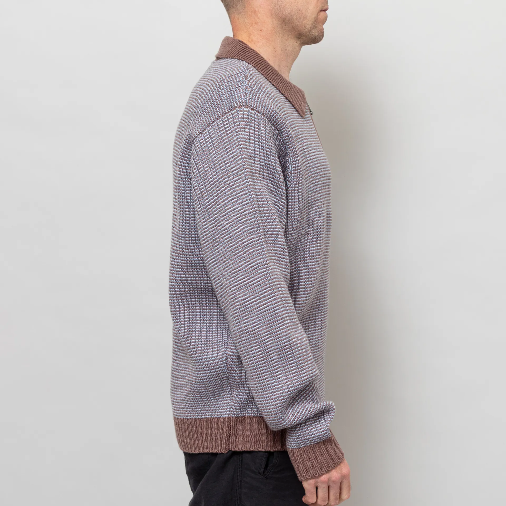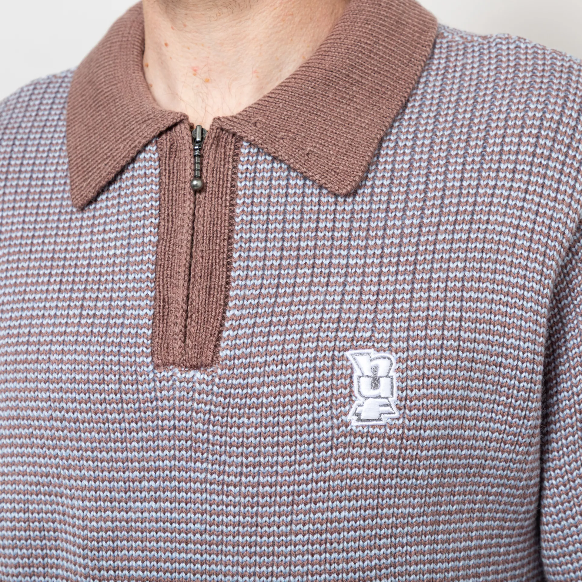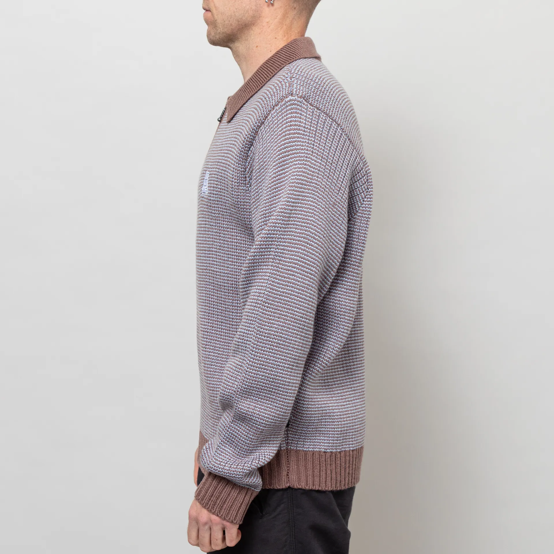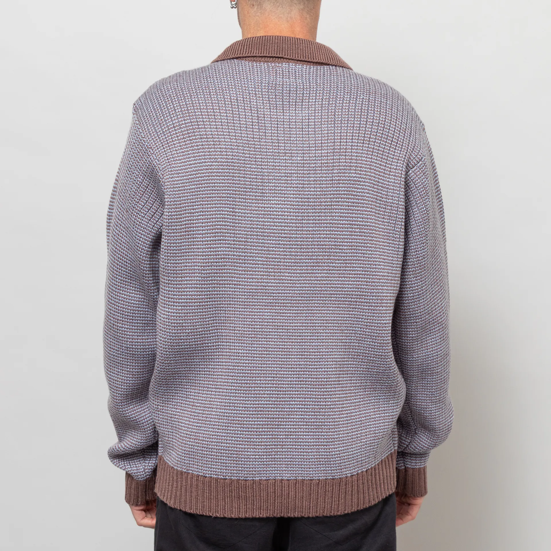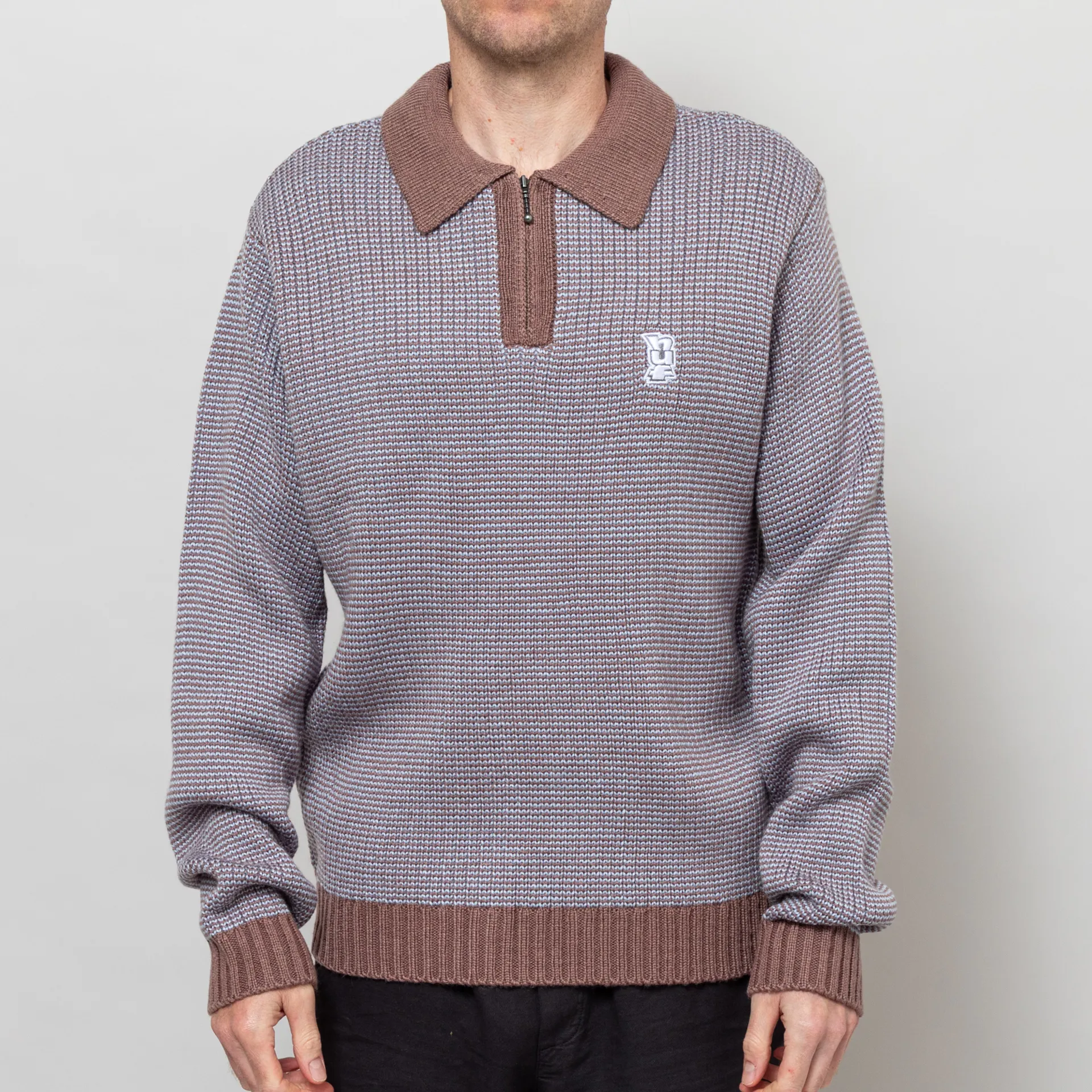 A knitted sweater from Huf, constructed from a waffle textured 70/30 acrylic wool blend, cut in a regular fit for everyday comfort. It features a quarter-zip placket, leading to a classic collar, with a ribbed hem and cuffs. Finished off with a small embroidered logo at the chest.