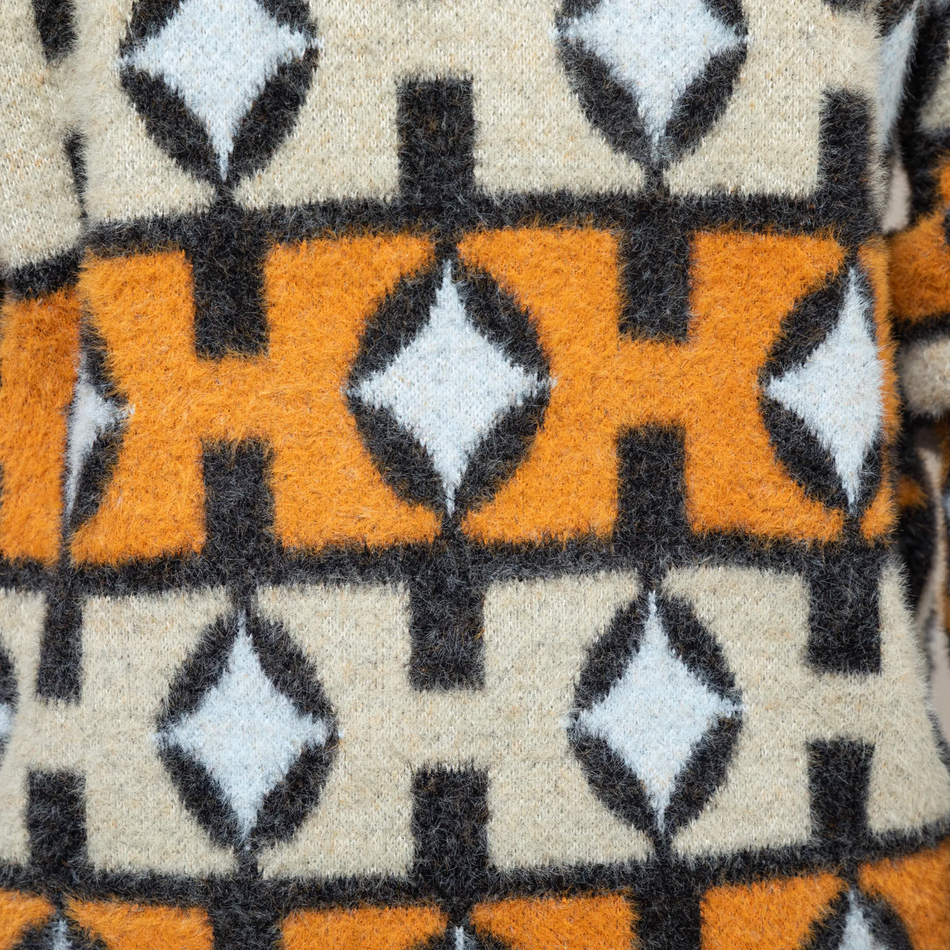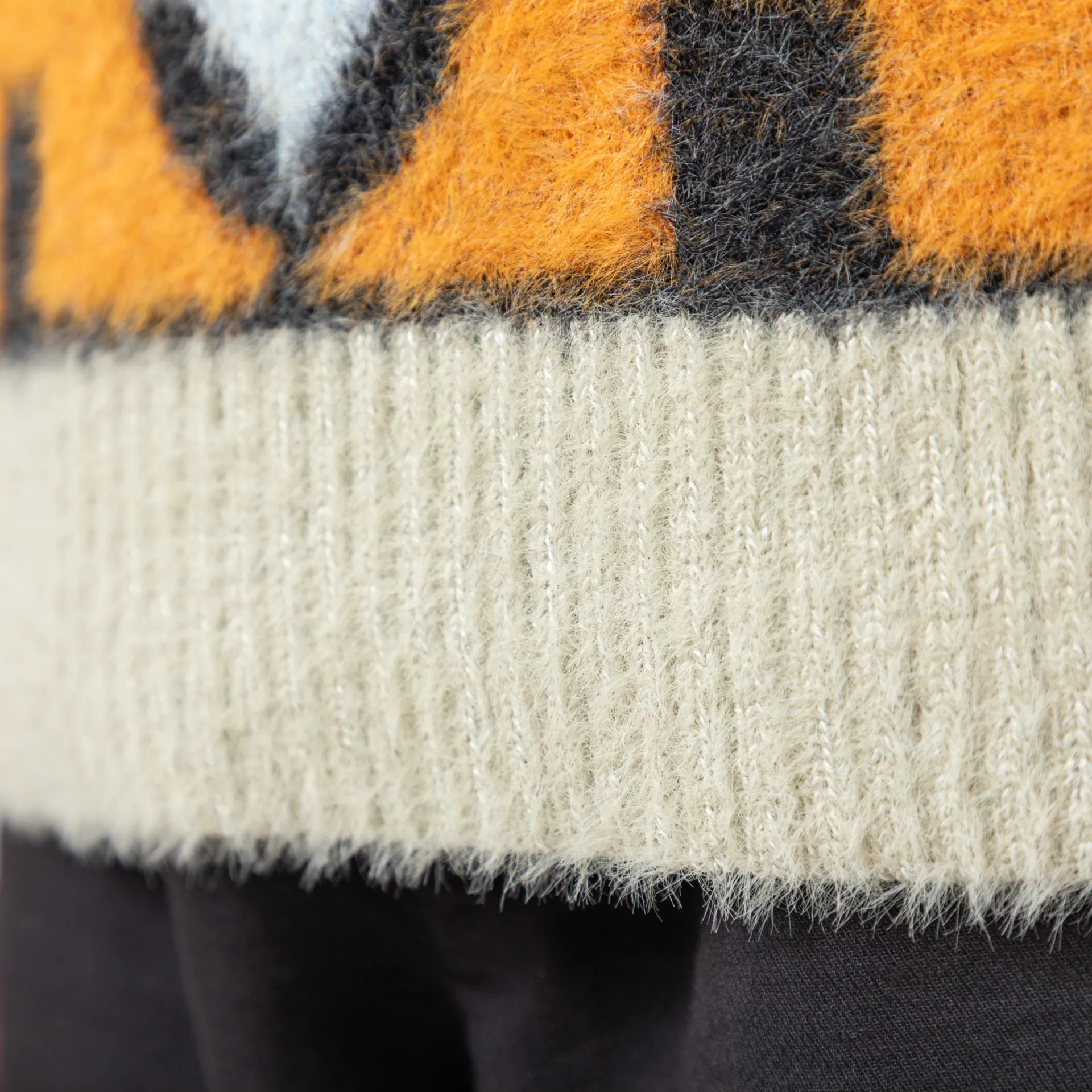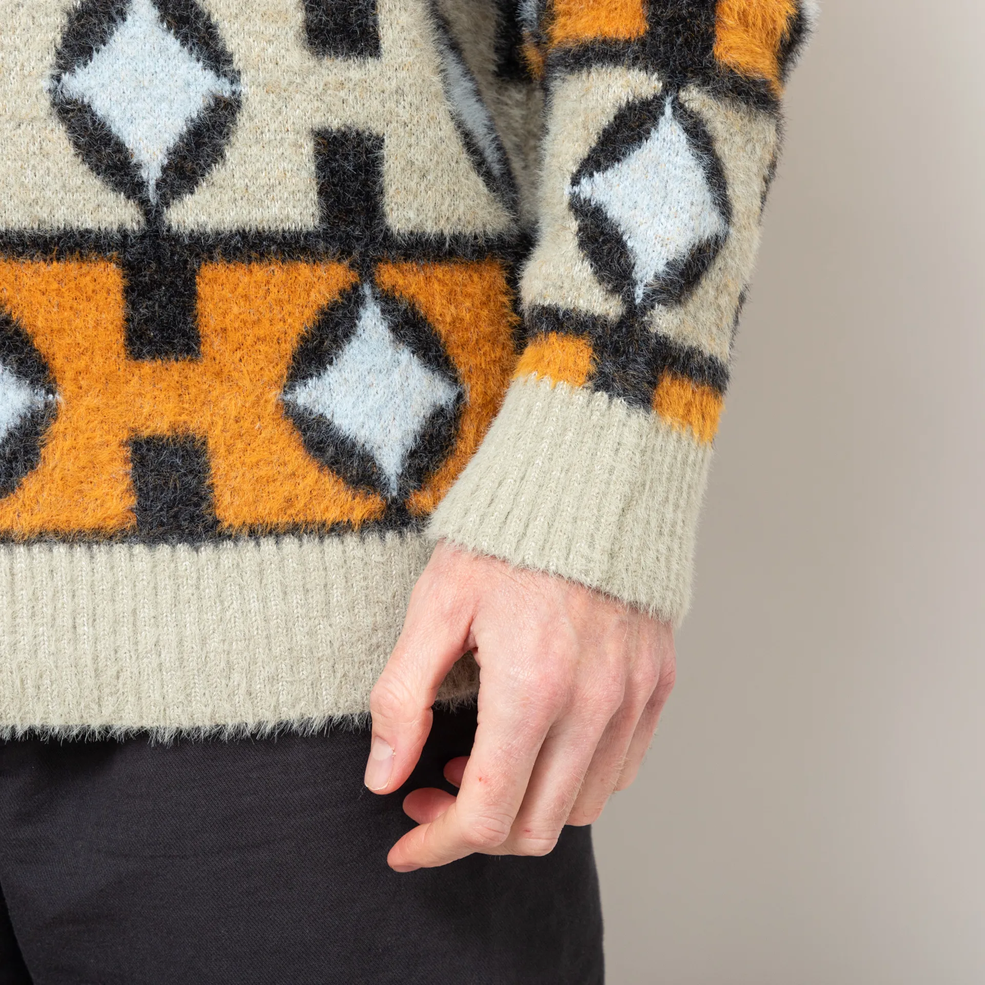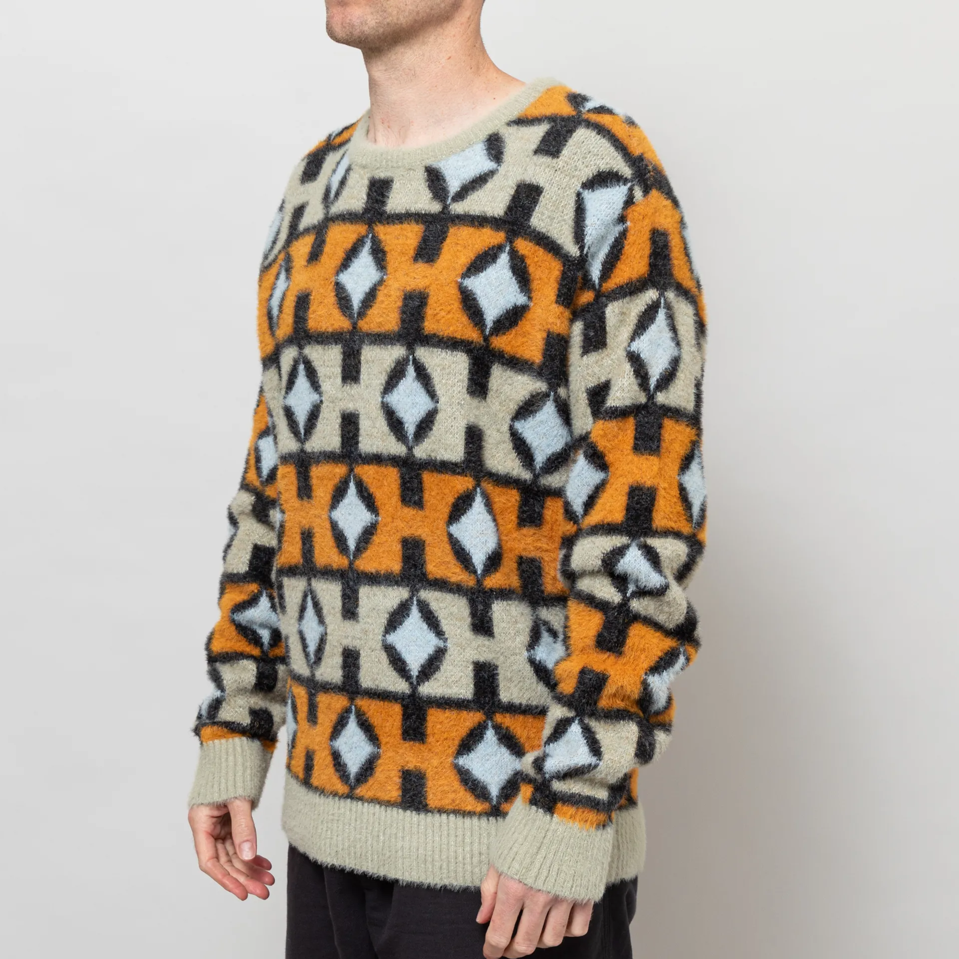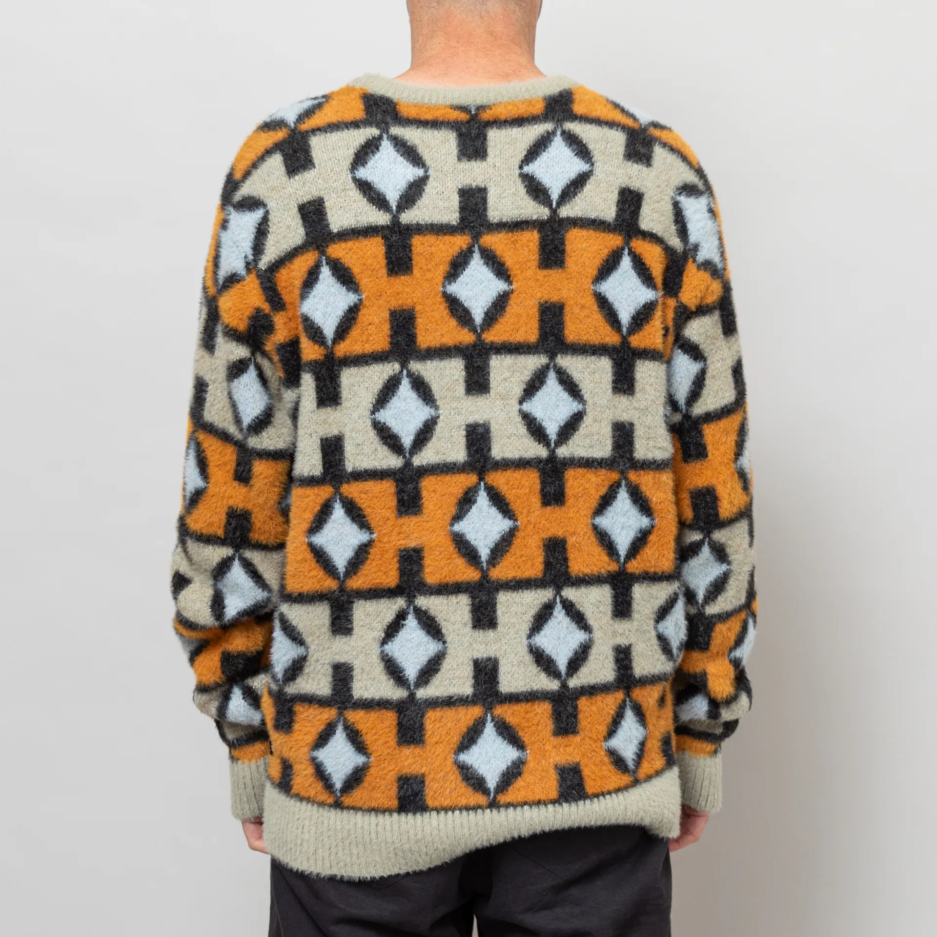 A knitted jumper from Huf, constructed from soft mohair with all-over jacquard stripe artwork. Cut in a relaxed fit for a casual look, it features a ribbed crewneck, hem and cuffs, with a small Huf flag label at the side seam.