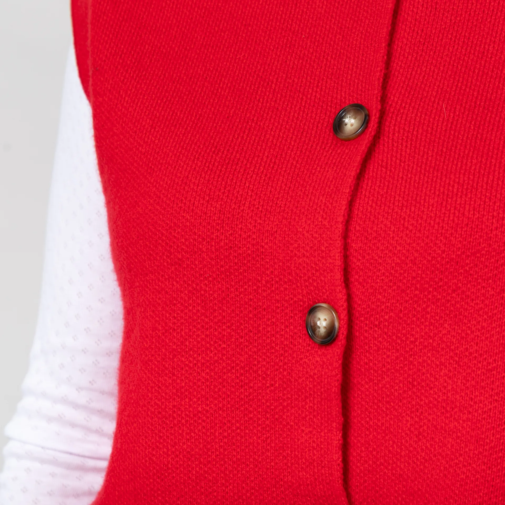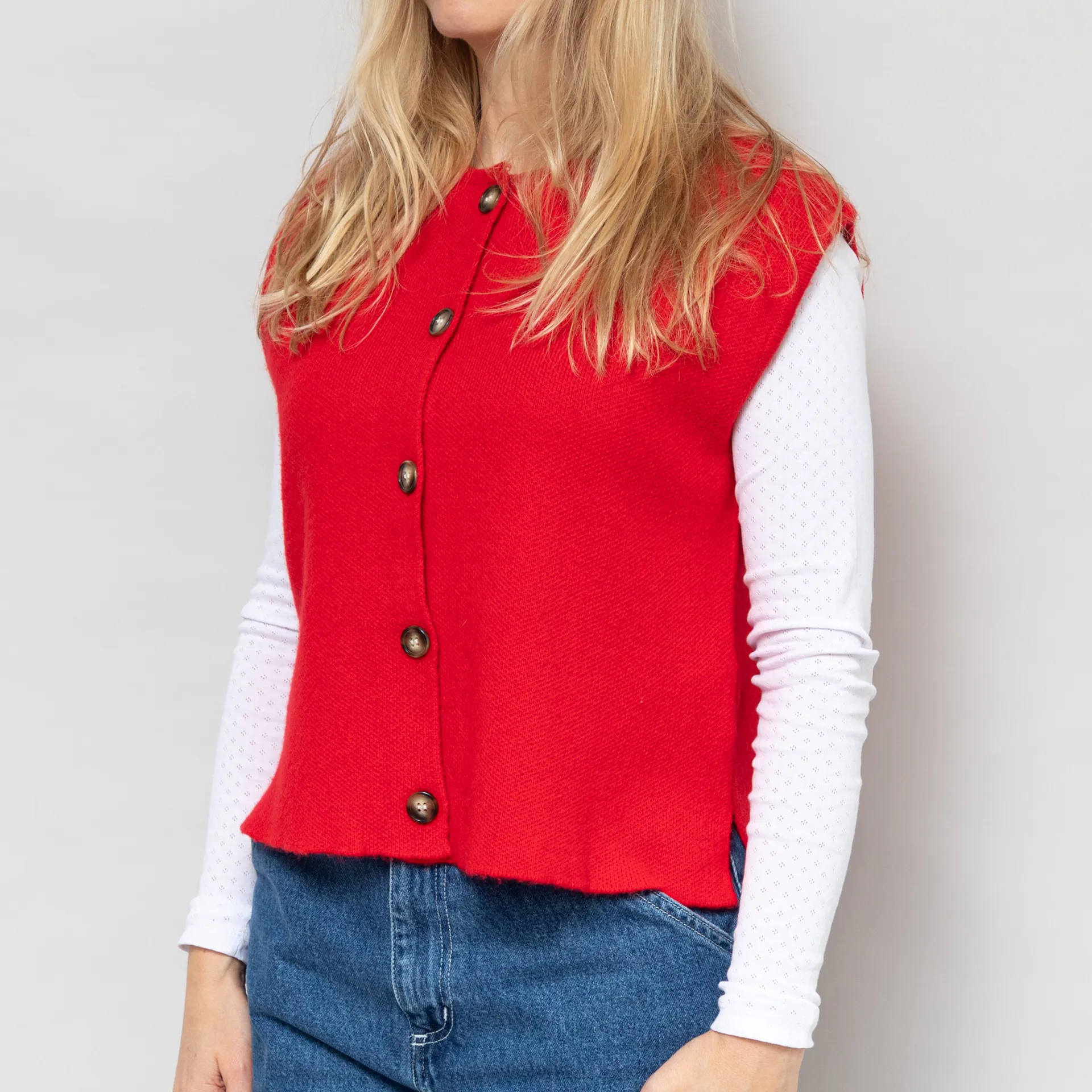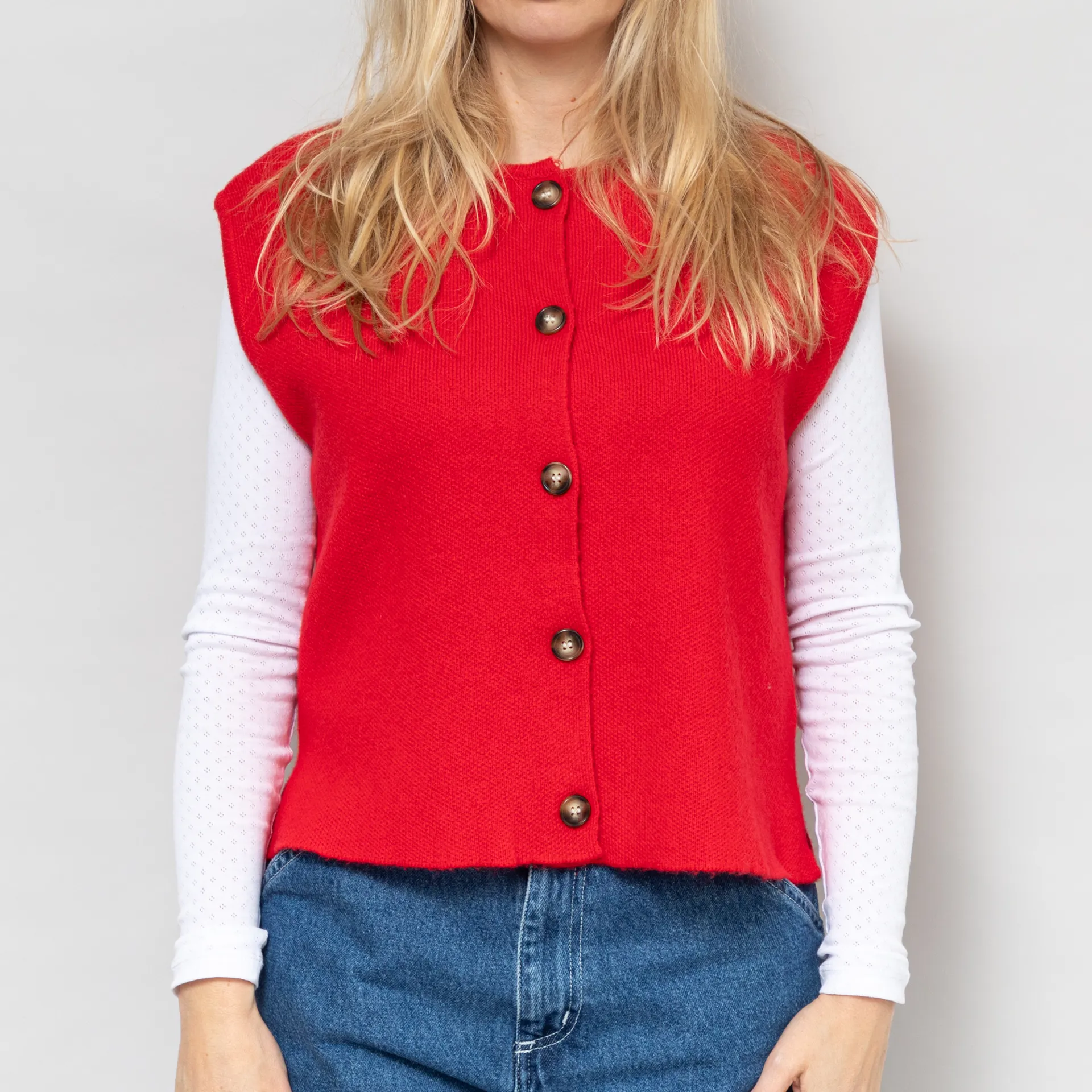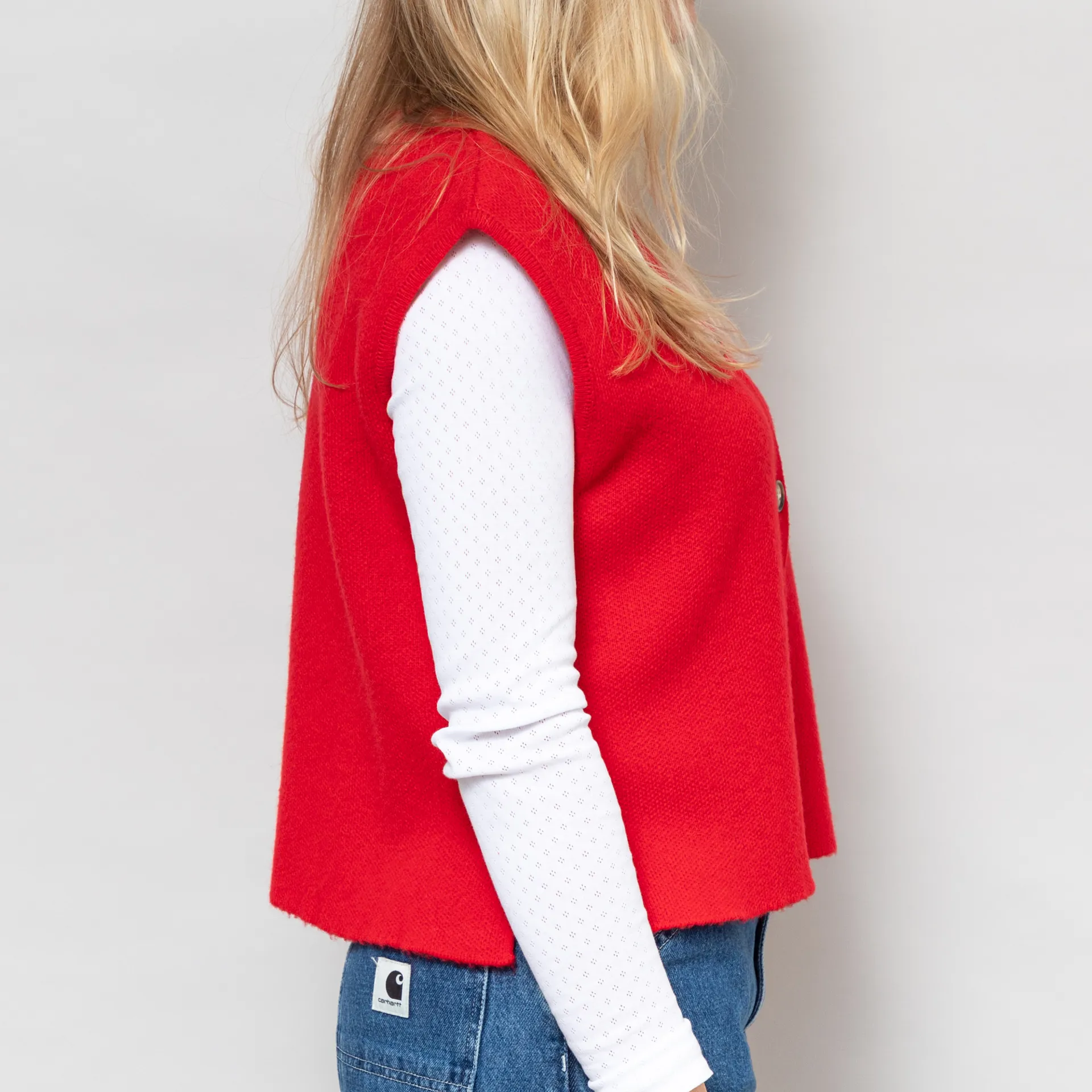 A sleeveless cardigan from Maison Anana, constructed from a super soft blend of polyamide, merino wool and acrylic. It's cut in a regular, cropped fit for everyday comfort and features a full button-through front, leading to a round neckline, with side splits at the hem and a small embroidered logo to the back of the neck.