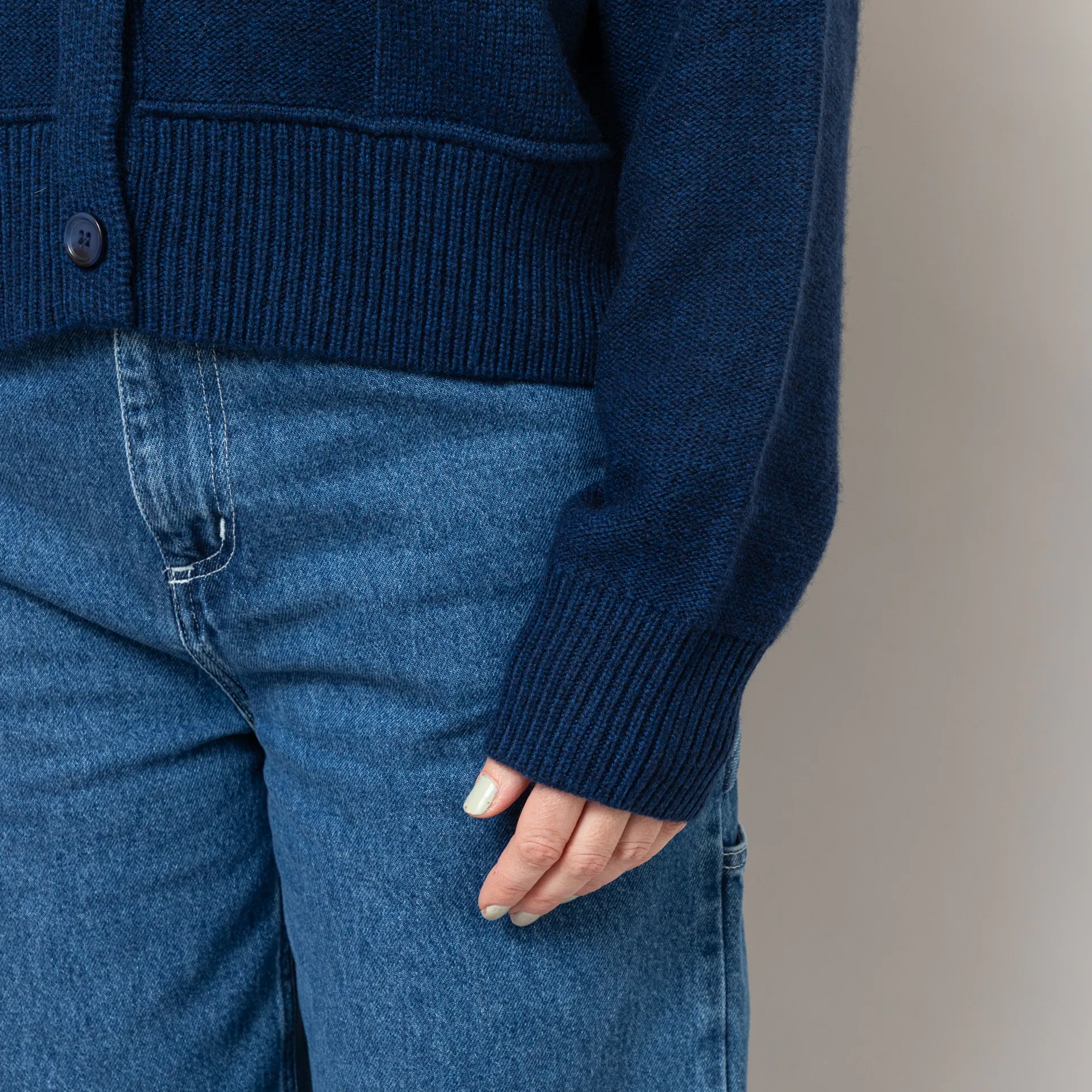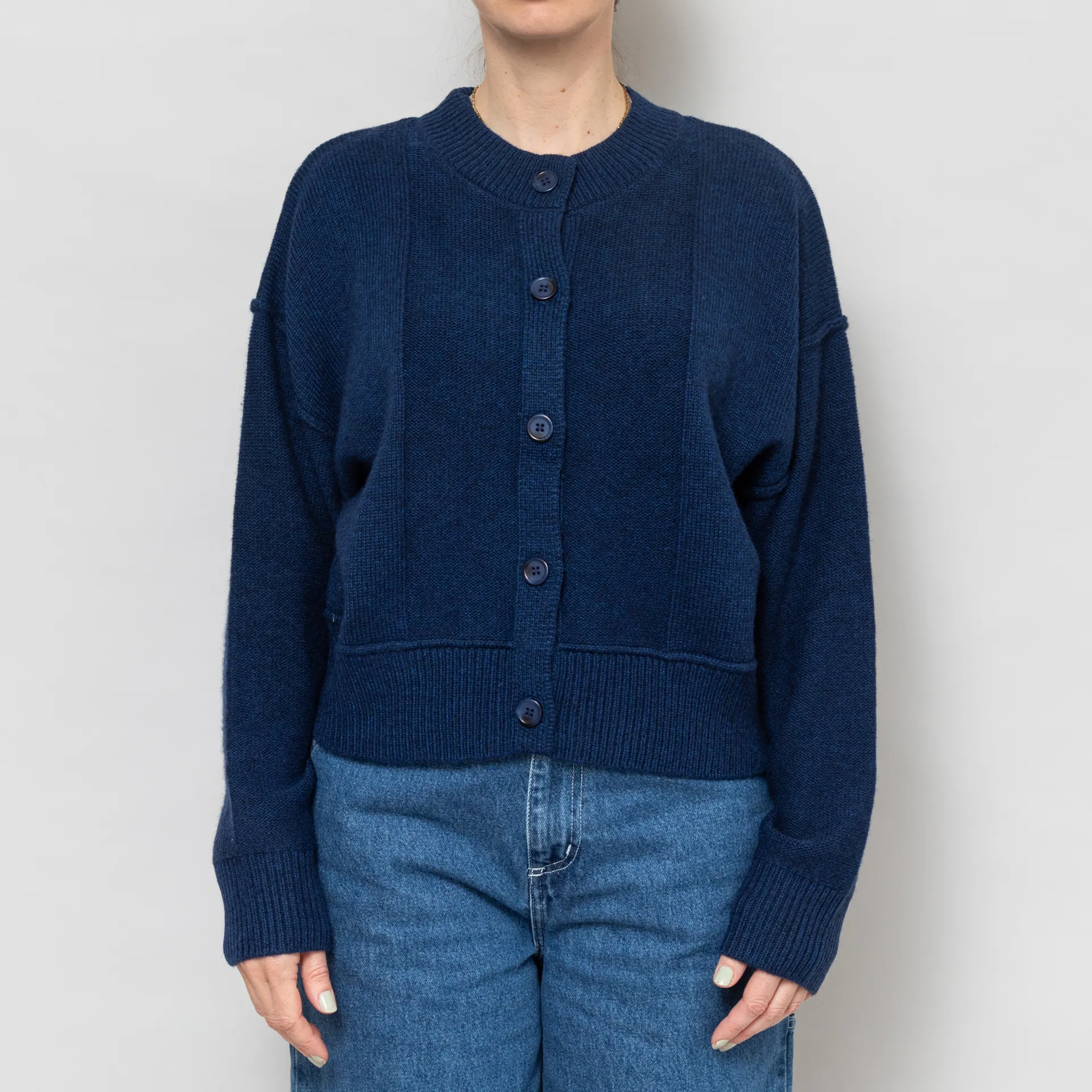 A knitted cardigan from Maison Anana, constructed from soft 100% wool and cut in a relaxed, cropped fit for a casual silhouette. It features a button-through front, leading up to a ribbed neckline, with a ribbed hem and cuffs.